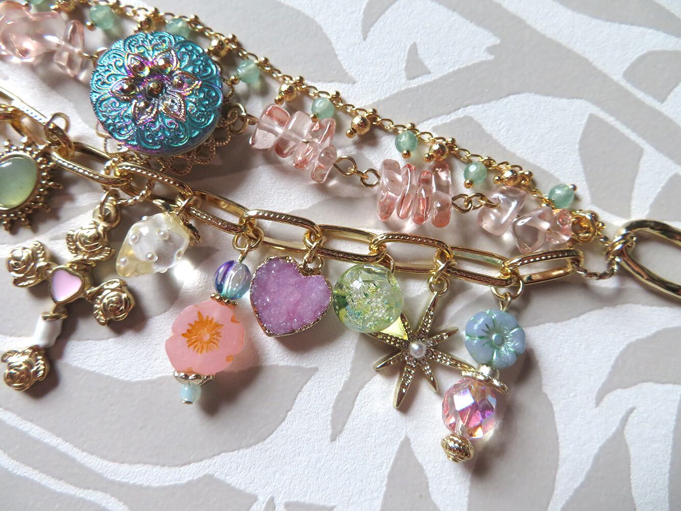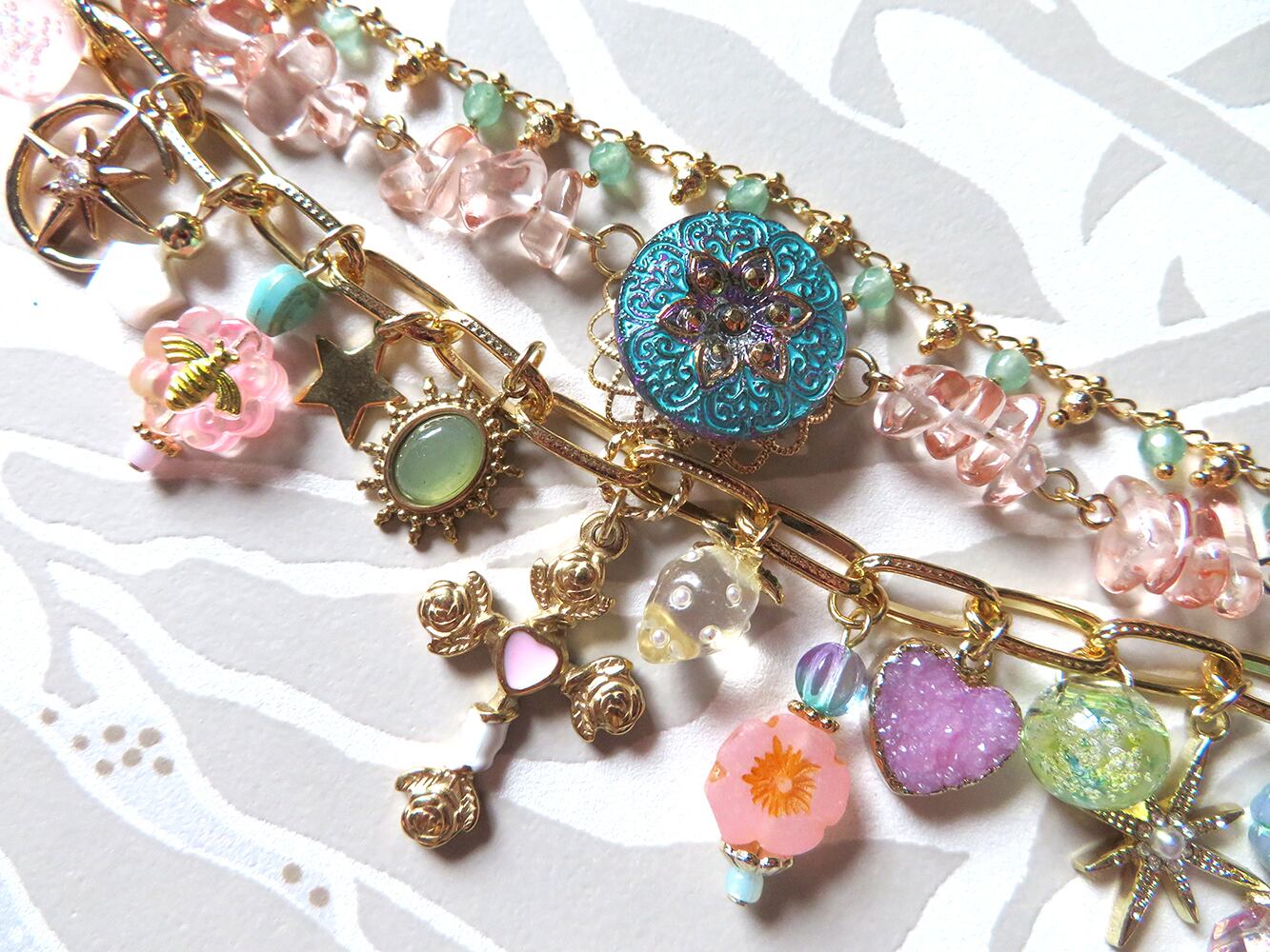 チェーン部分には贅沢にチャーム類を敷き詰めているので、どこから見ても違ったデザインが楽しめて可愛いアイテムです。