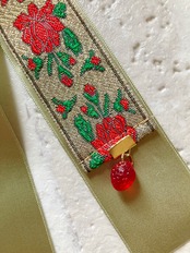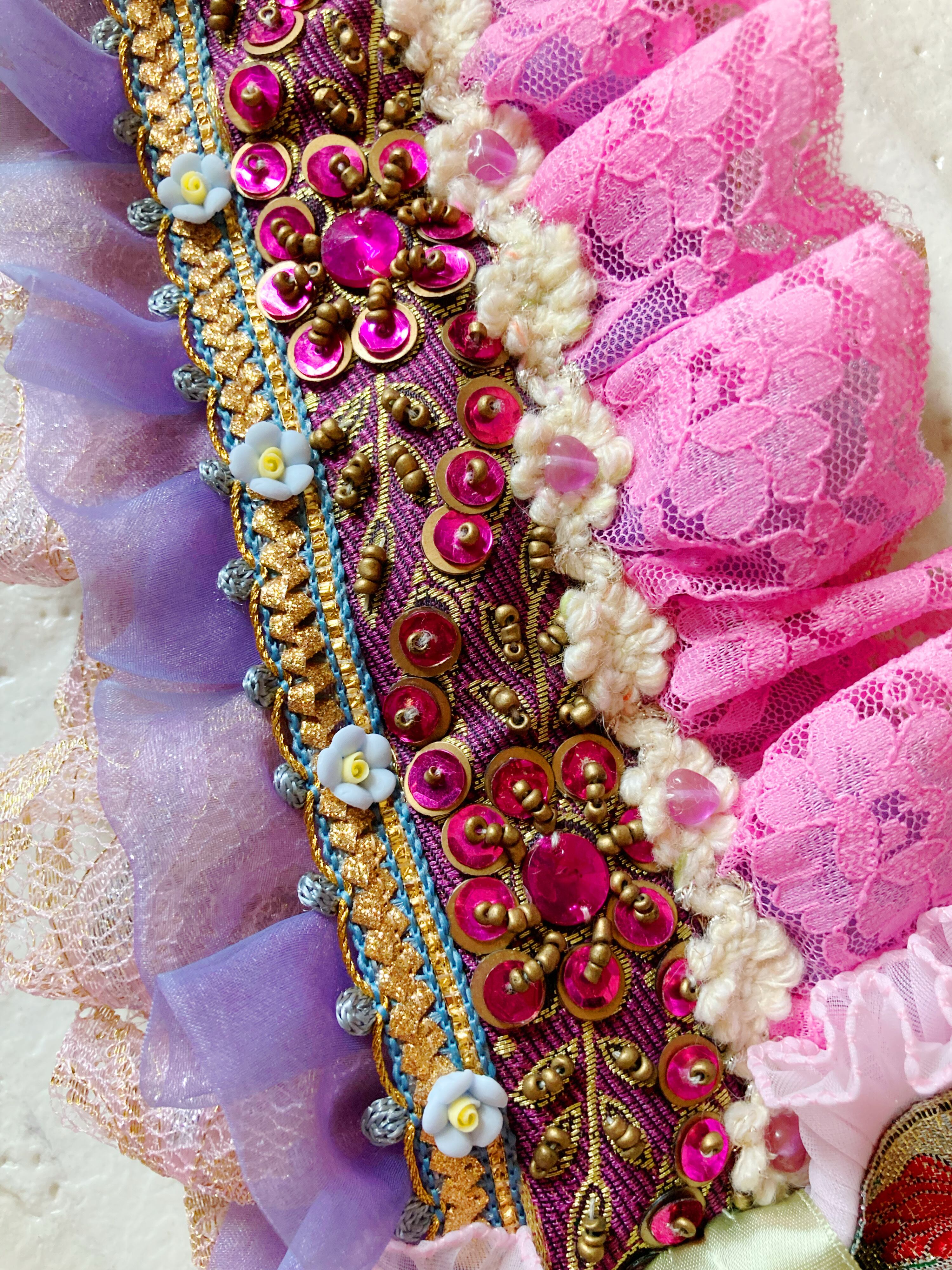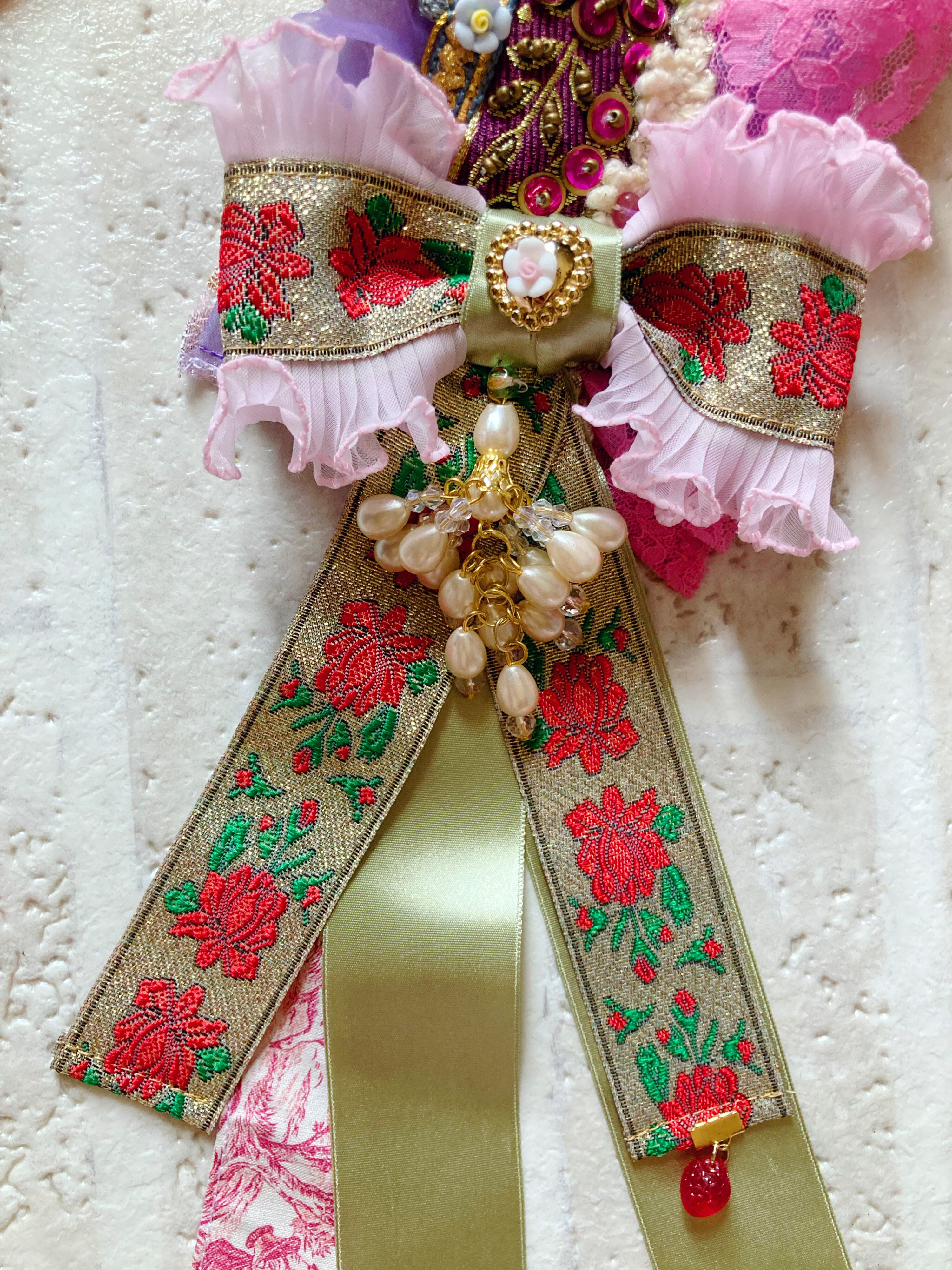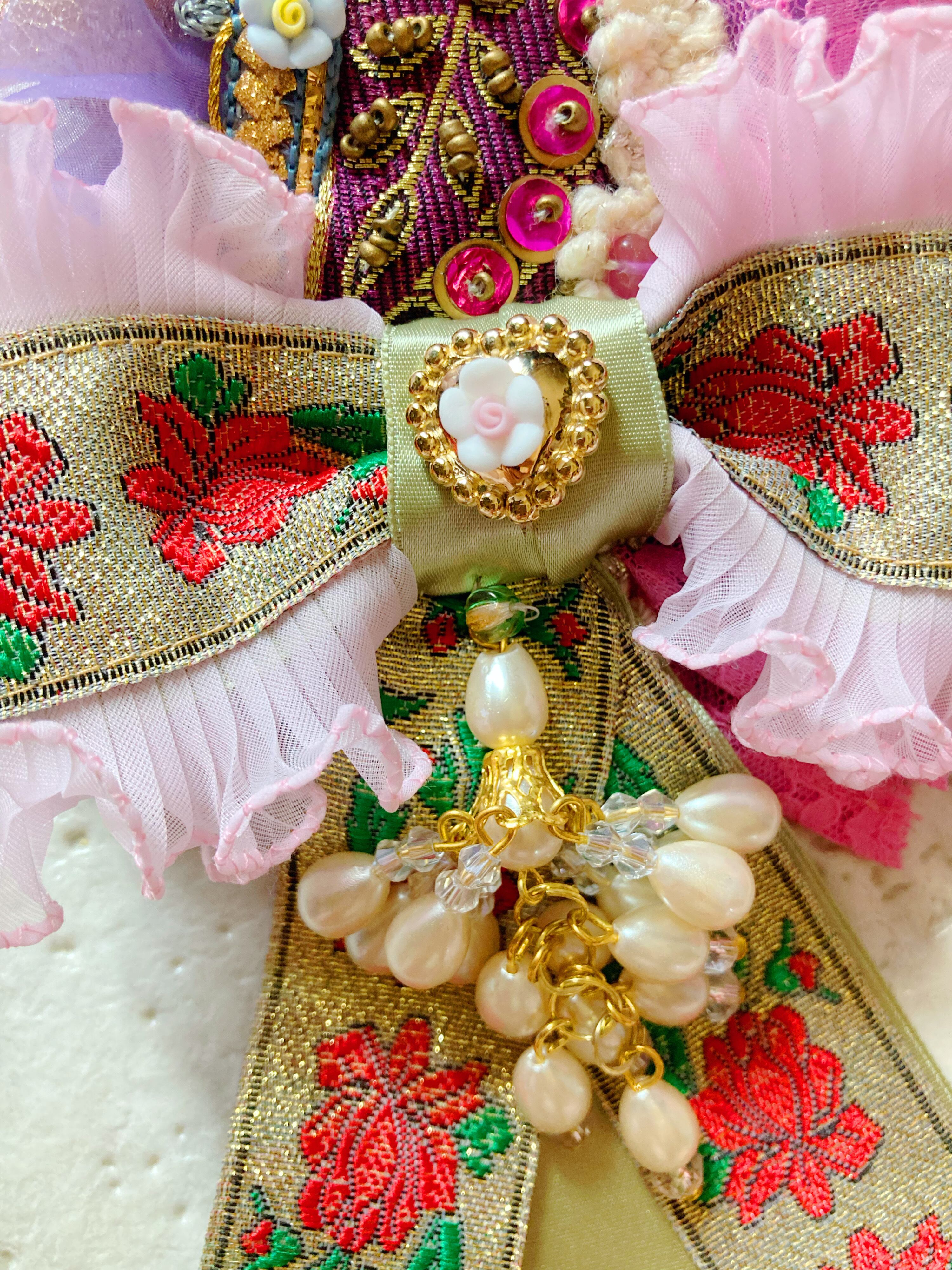 ドイツ製ビーズ、チェコ硝子ビーズなどを使用。海外製のスパンコールリボンや素材を豪華に使用し、おひめさまらしいディティールで仕上げました。