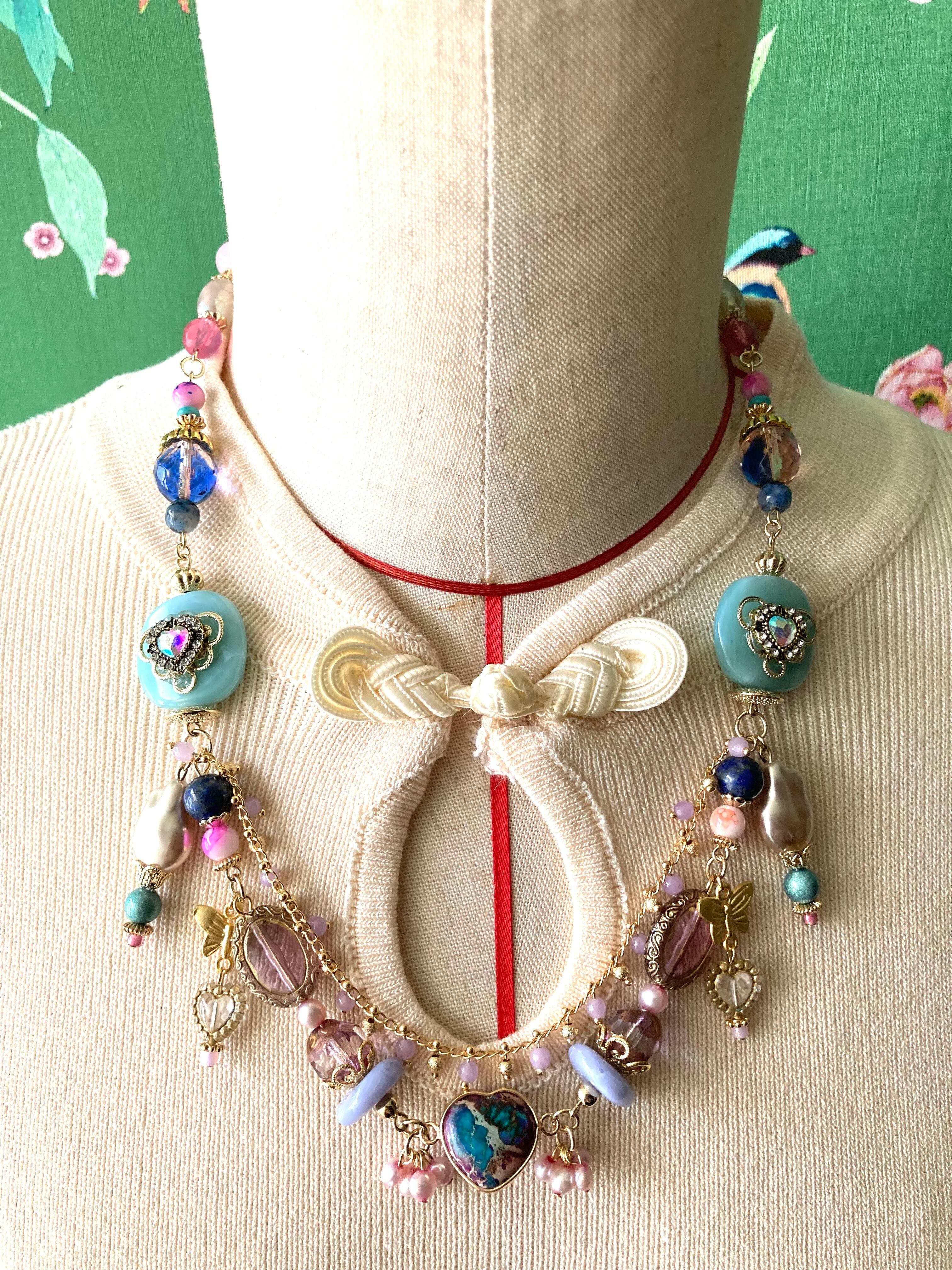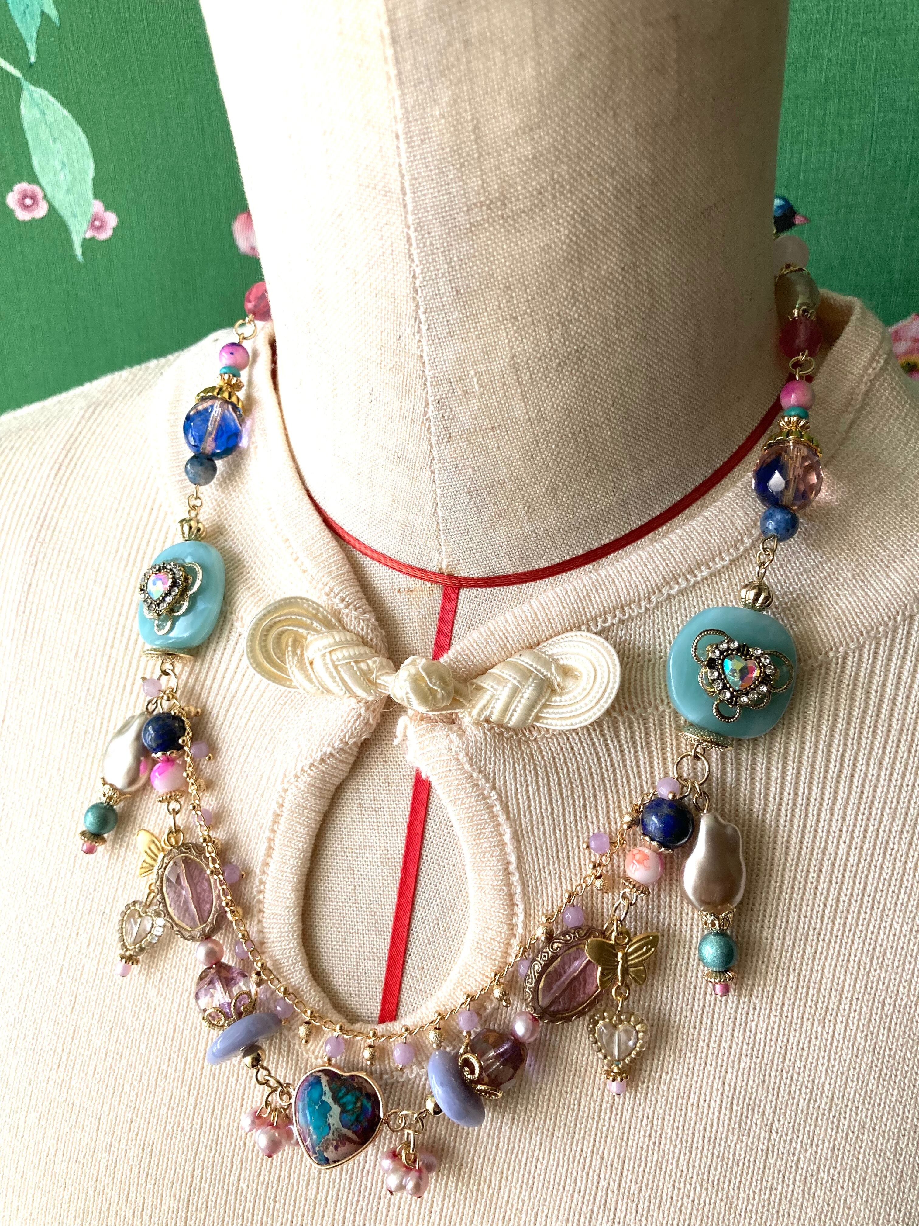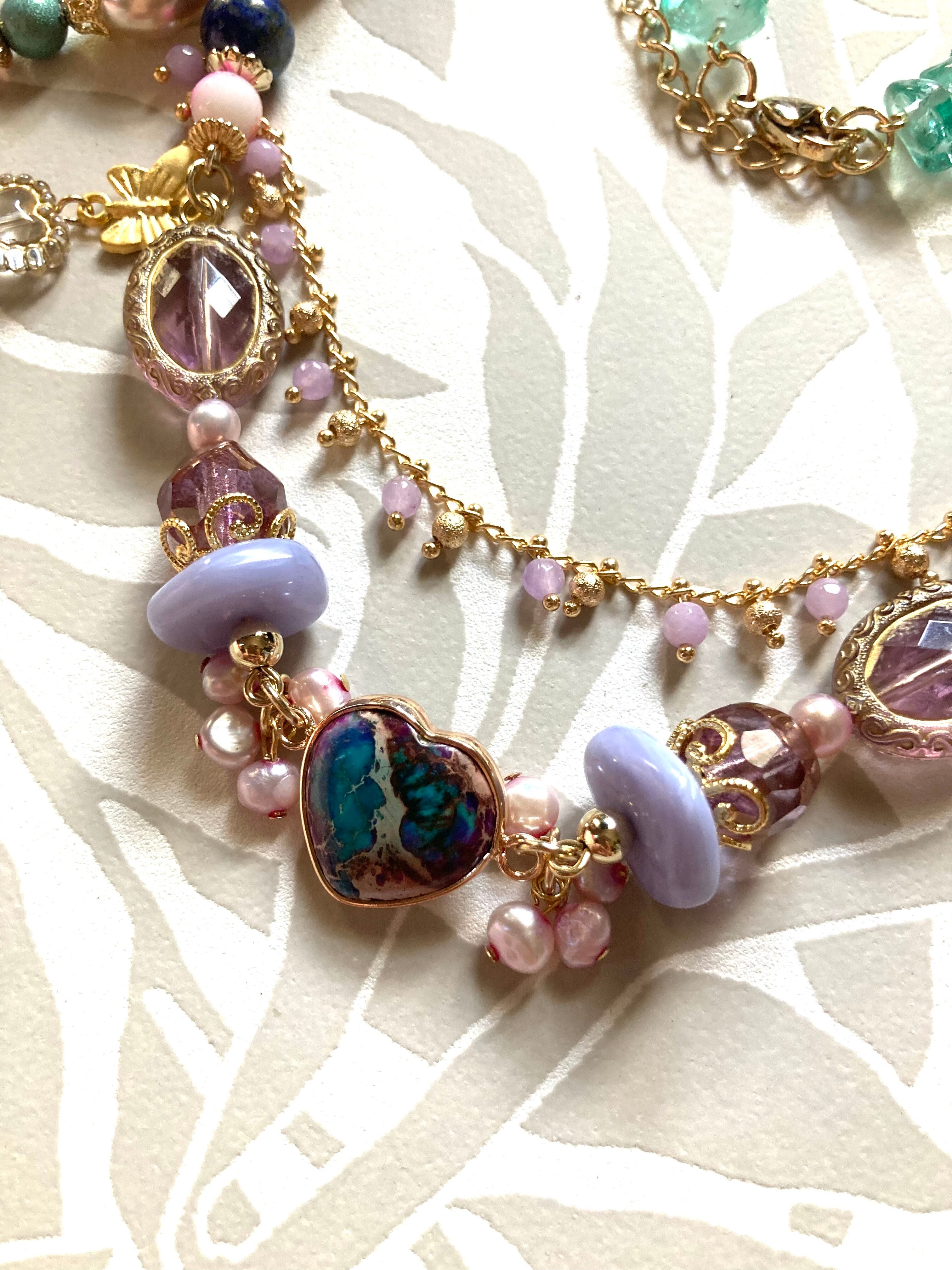 重ね付けのようになるディテールのビーズネックレス。染め天然石やさざれ石等を使用してエキゾチックな雰囲気を醸し出しているデザインです。