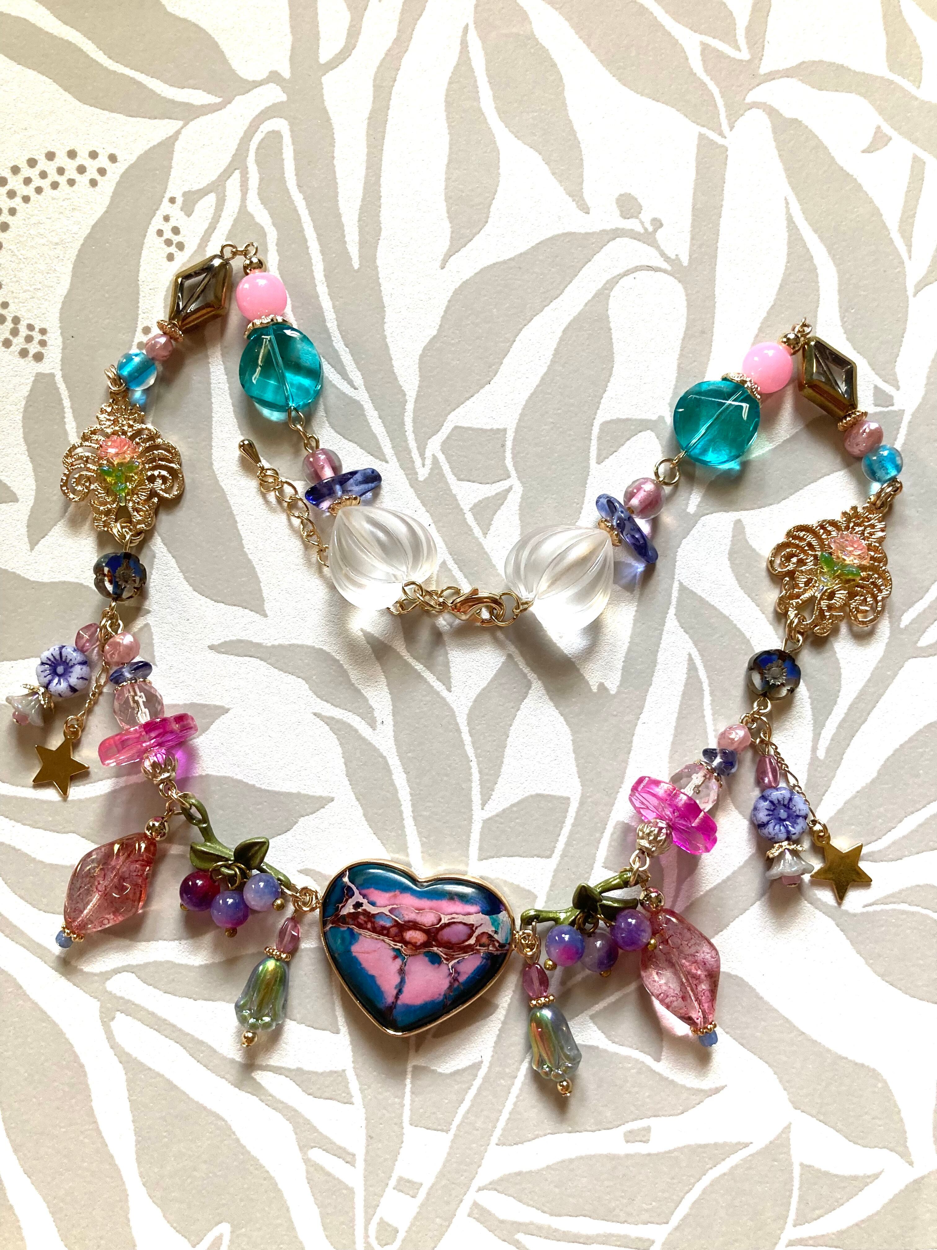 不思議な色の鉱物を組み合わせた煌びやかなネックレス。星や花が垂れ落ちるロマンティックなデザインは、見る人全ての心を捉えてやみません(中央の♡デザインはプリントとなります)