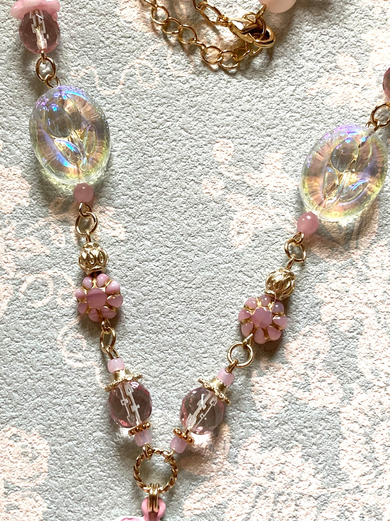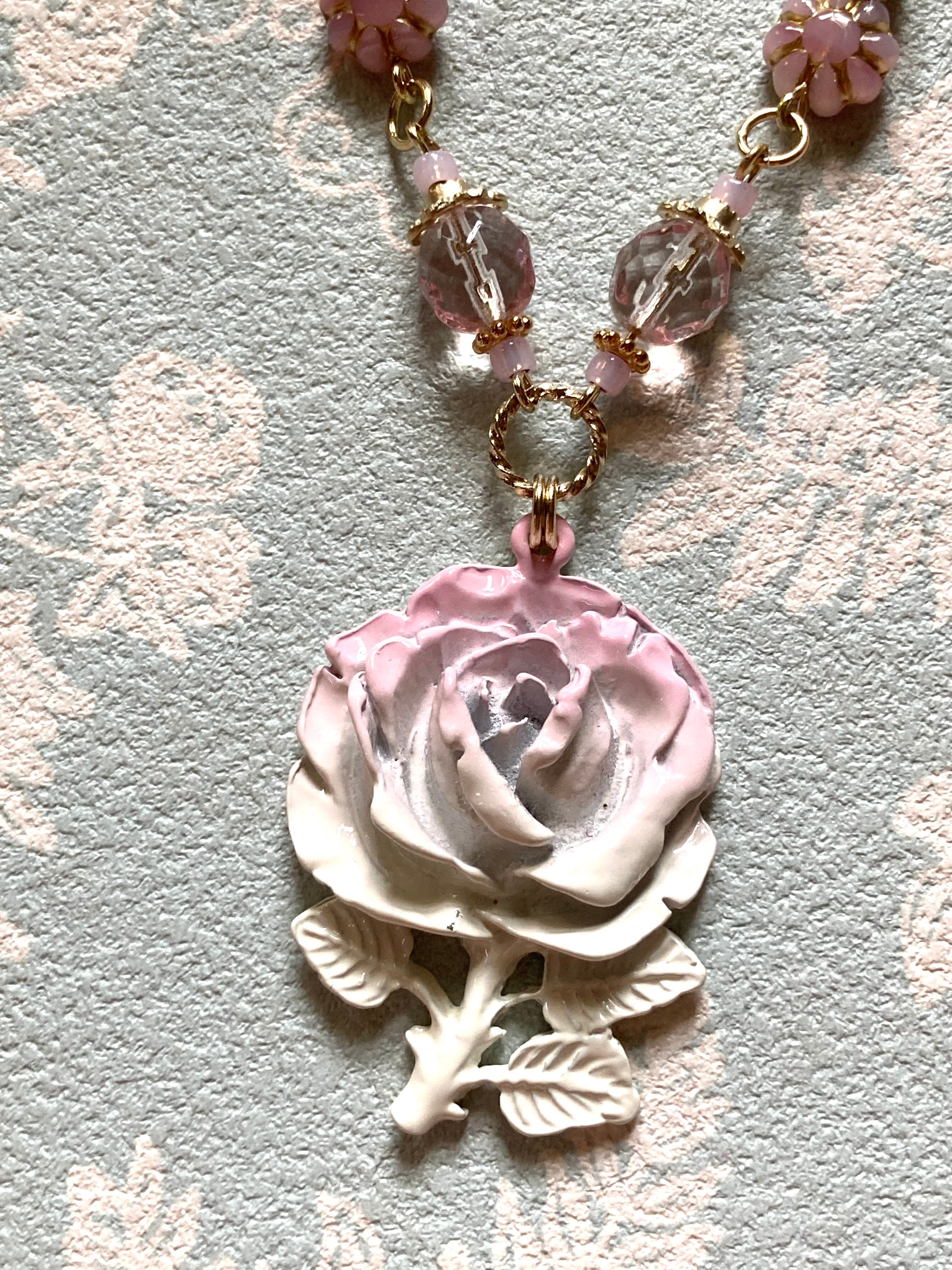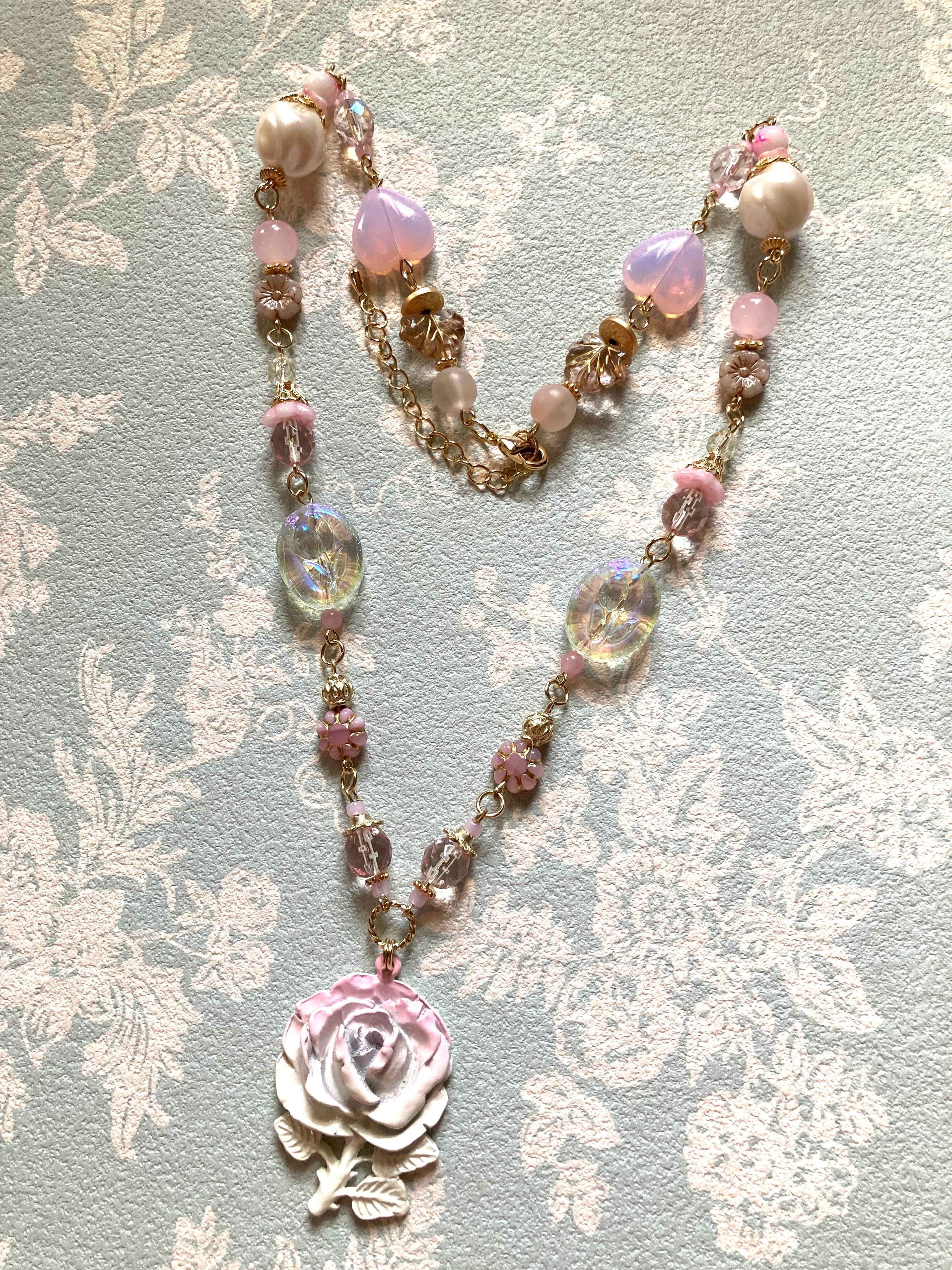 ホワイト×ピンクのRoseネックレス。日本製のローズチャームのディティールが美しいデザインです。お揃いのようなblack×グリーンのローズネックレスもお出ししています。