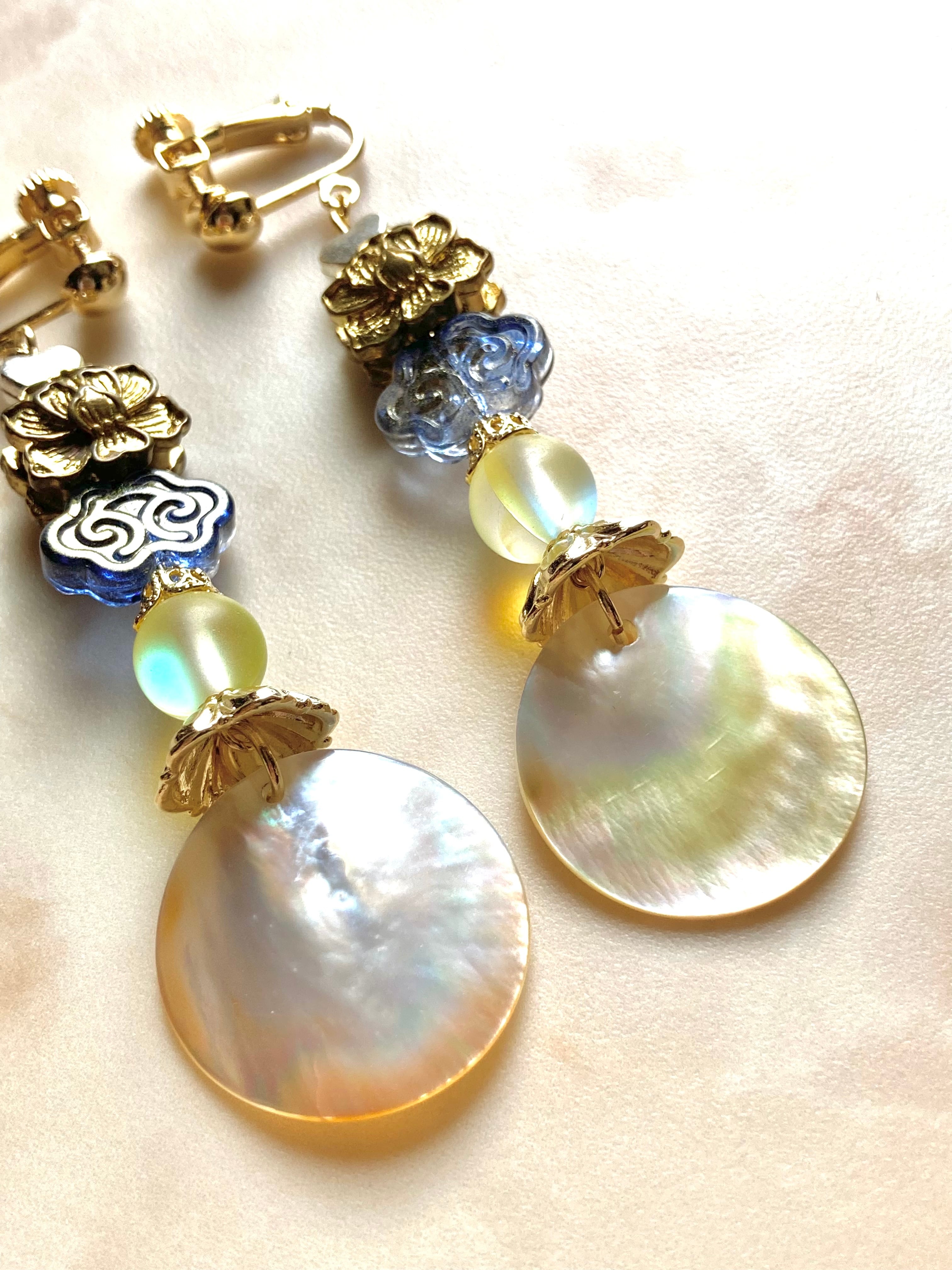 素材:チェコ硝子ビーズ、貝ビーズ、キャストビーズなど