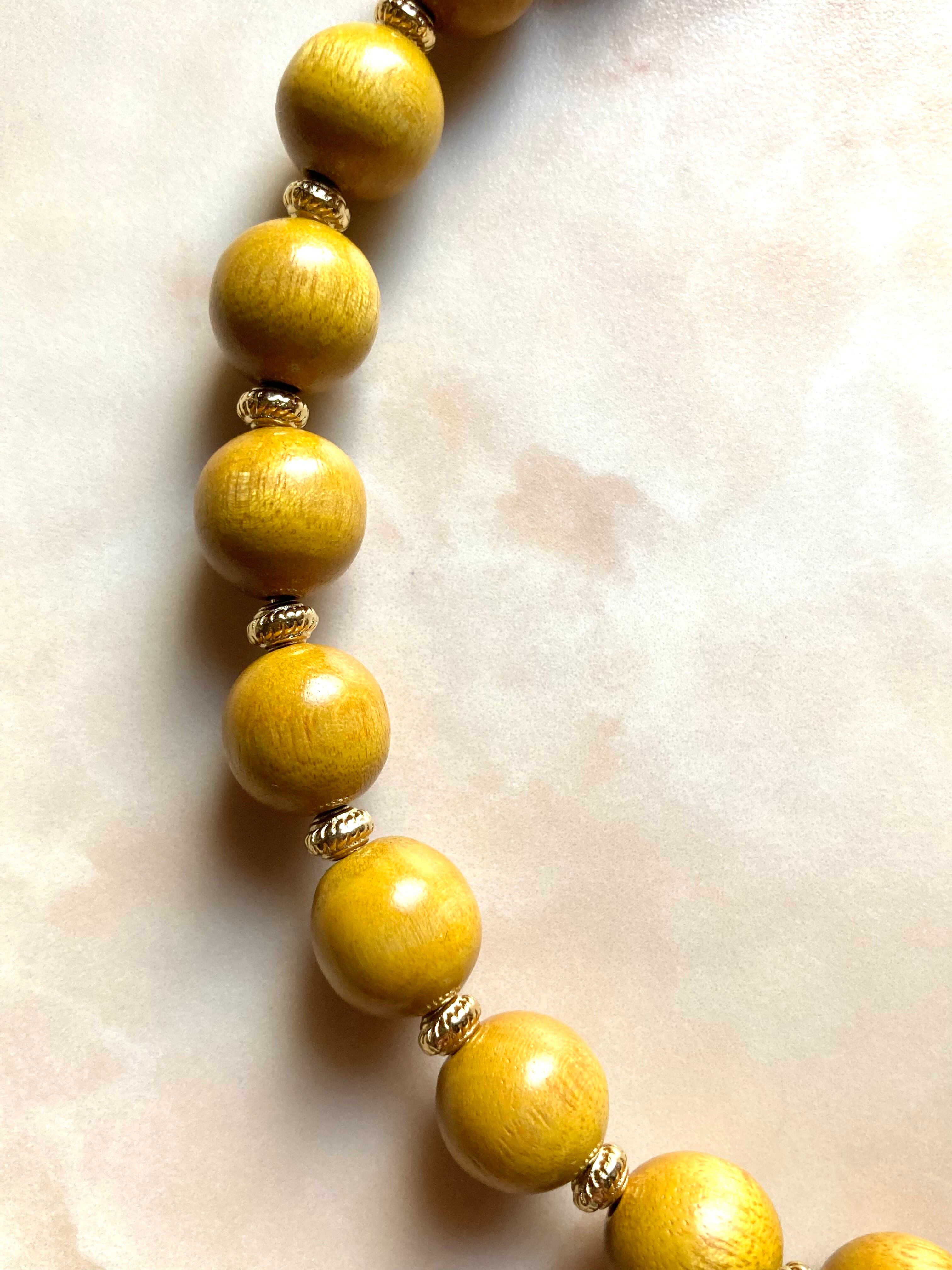 中秋の満月の様な深いムーンイエローのウッドビーズと、花図案の七宝ビーズ、中華タッセルを組み合わせ、シンプルだけど存在感のあるシノワズリなネックレスに仕上げました。