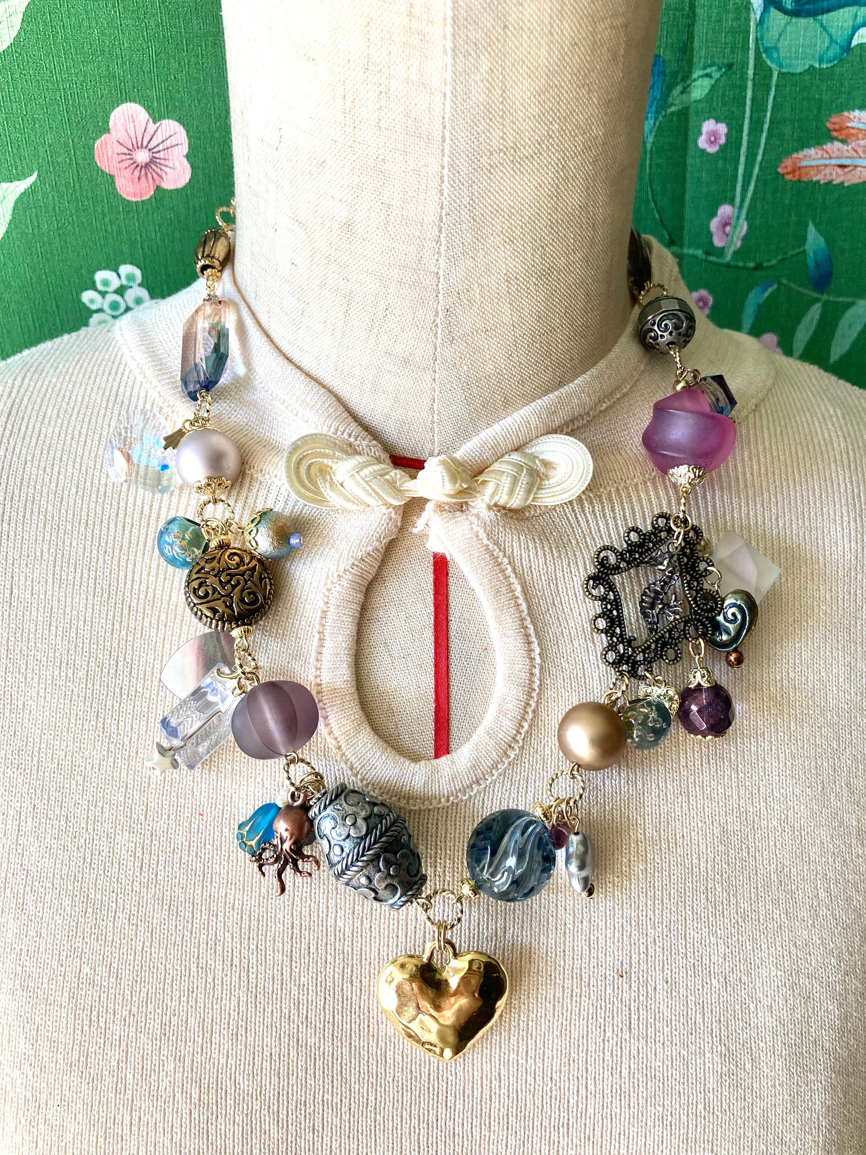 アンティークでカラフルなビーズやチャームを組み合わせた、ボリューミーなデザインです。