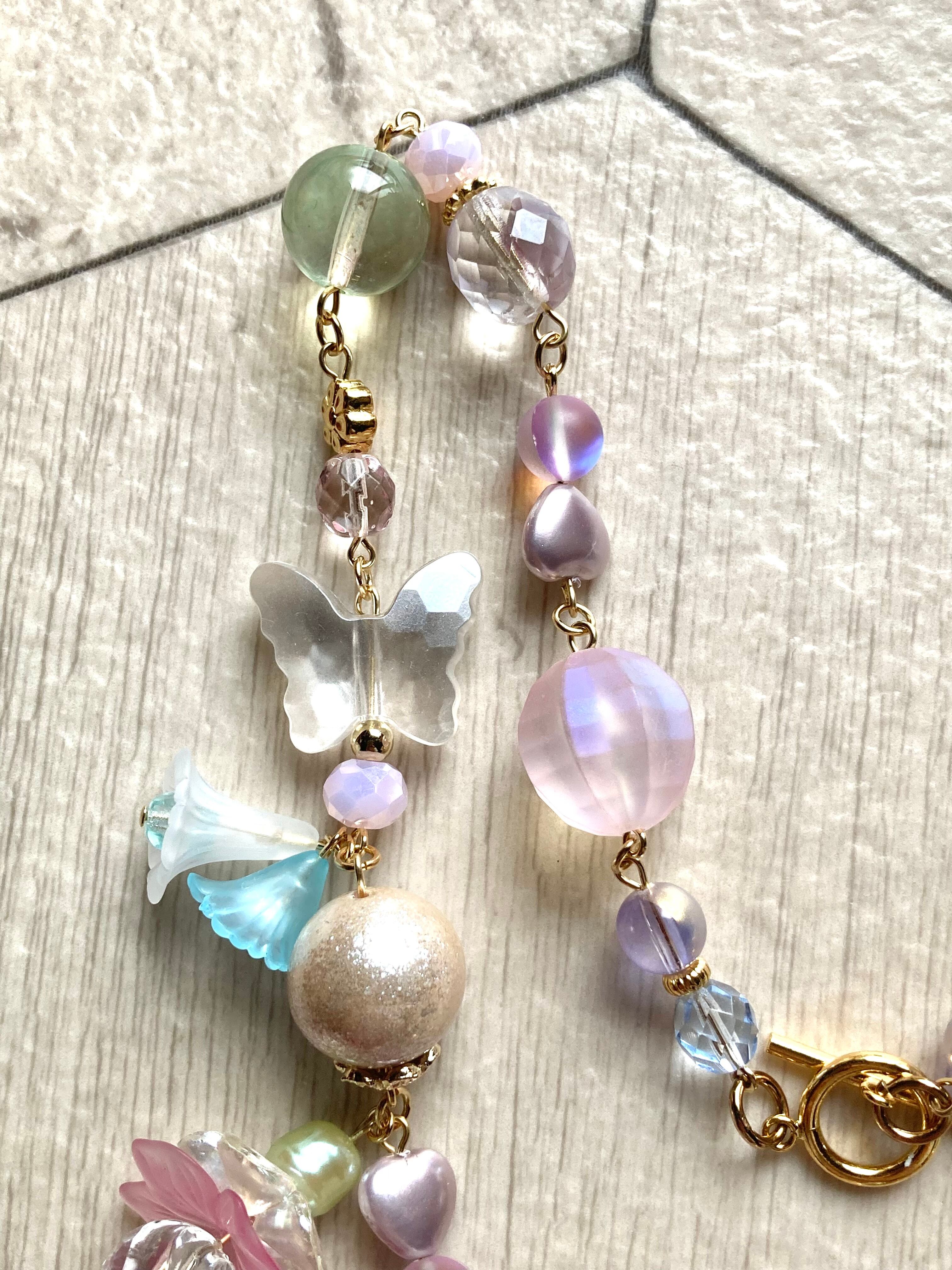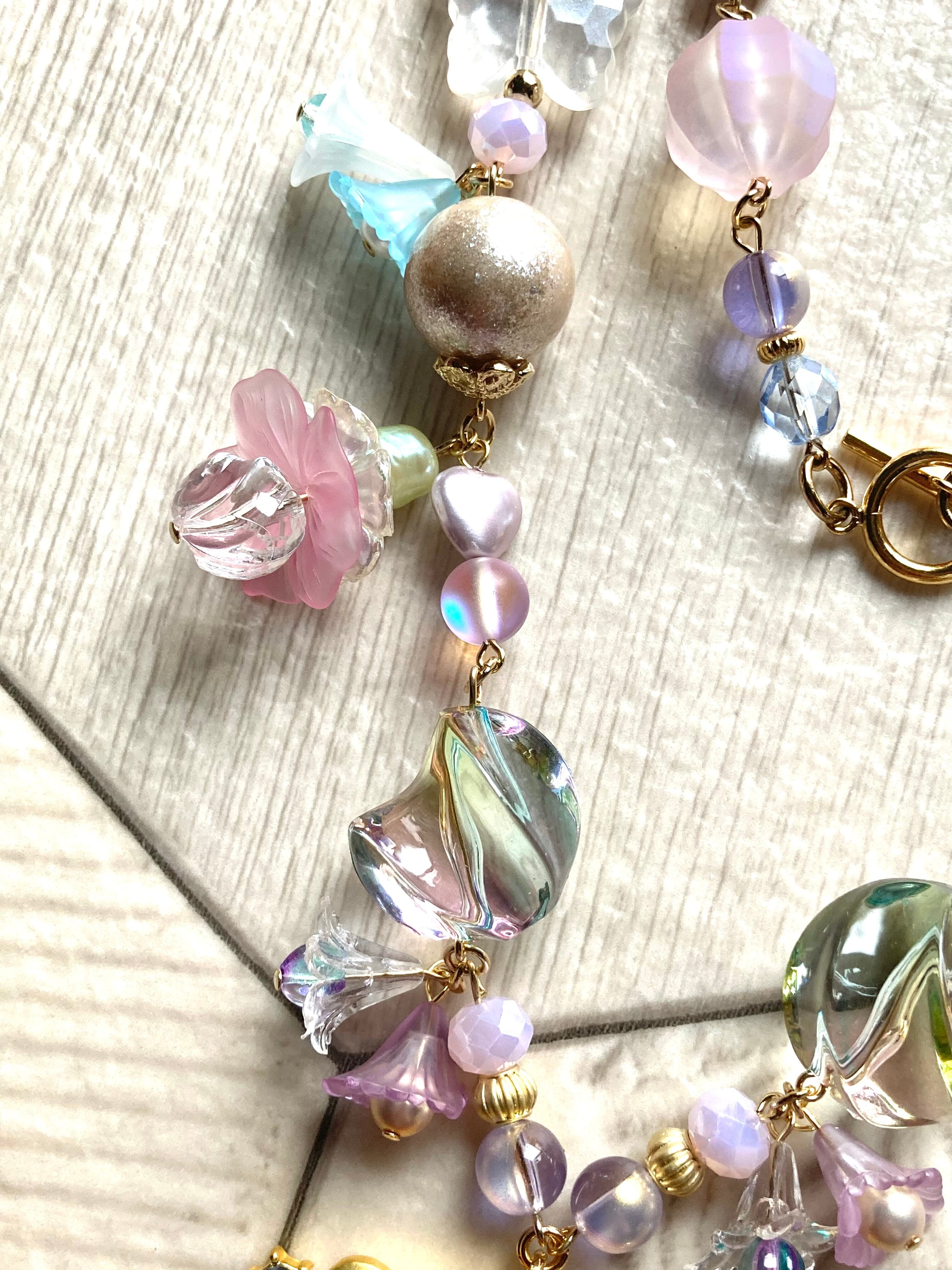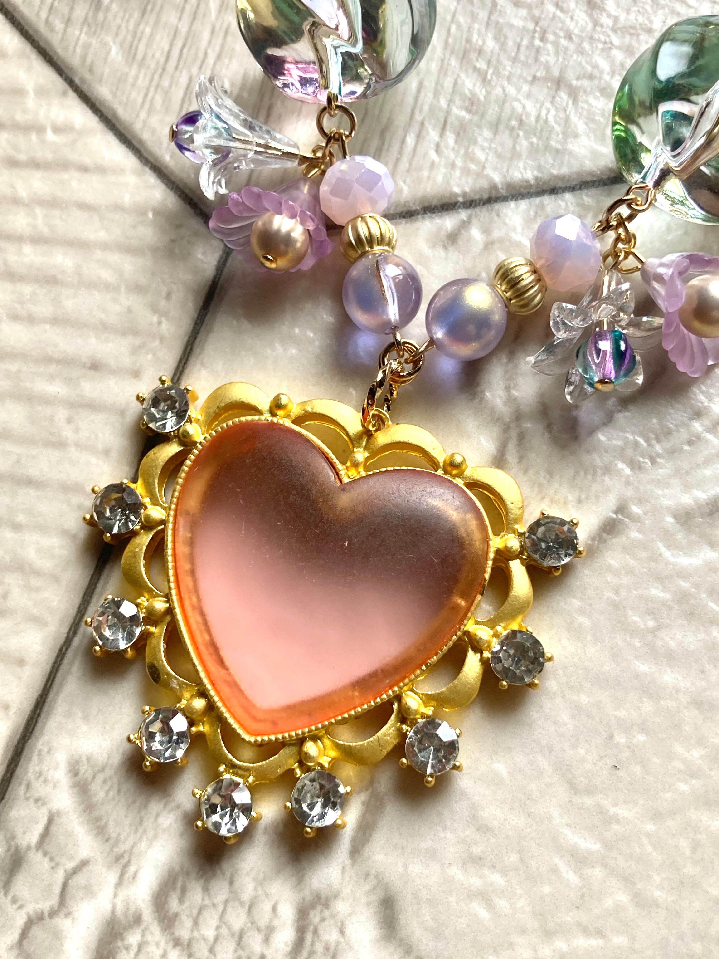大きなスリ硝子のハートのペンダントトップと、楽園の花畑をイメージしたパステルなシャボンカラーのビーズが印象的なデザインです。