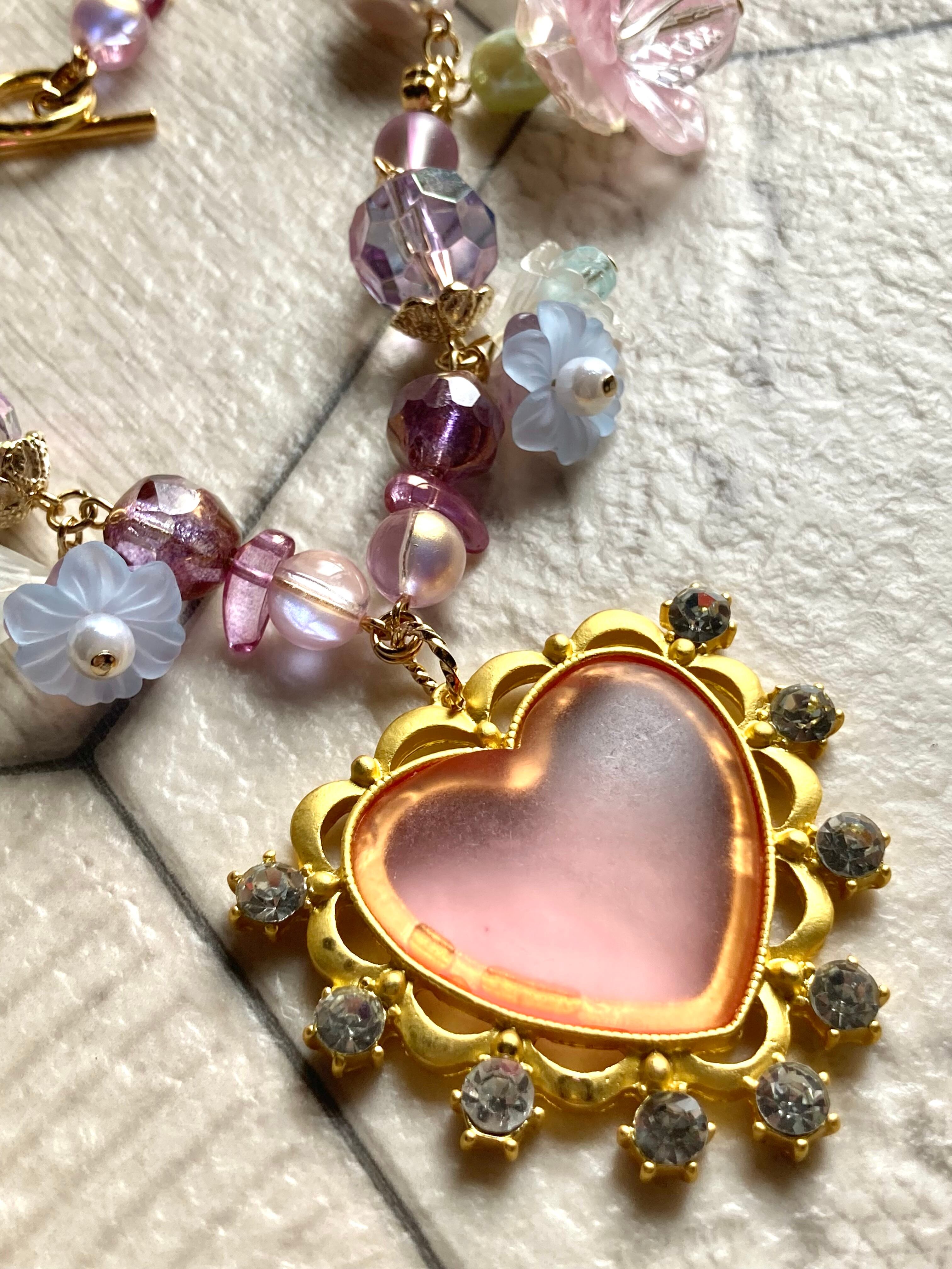 大きなスリ硝子のハートのペンダントトップと、楽園の花畑をイメージしたパステルなシャボンカラーのビーズが印象的なデザインです。