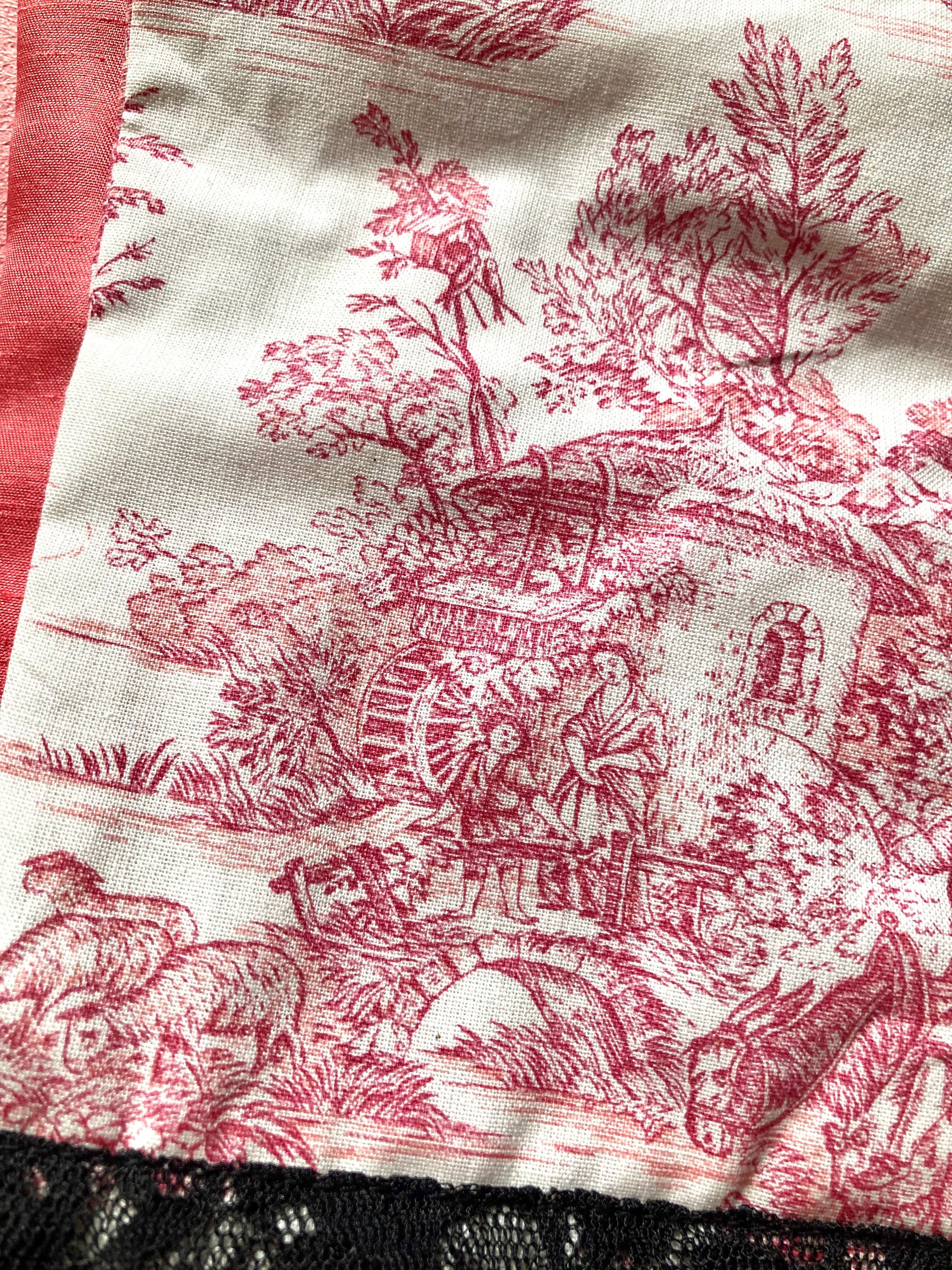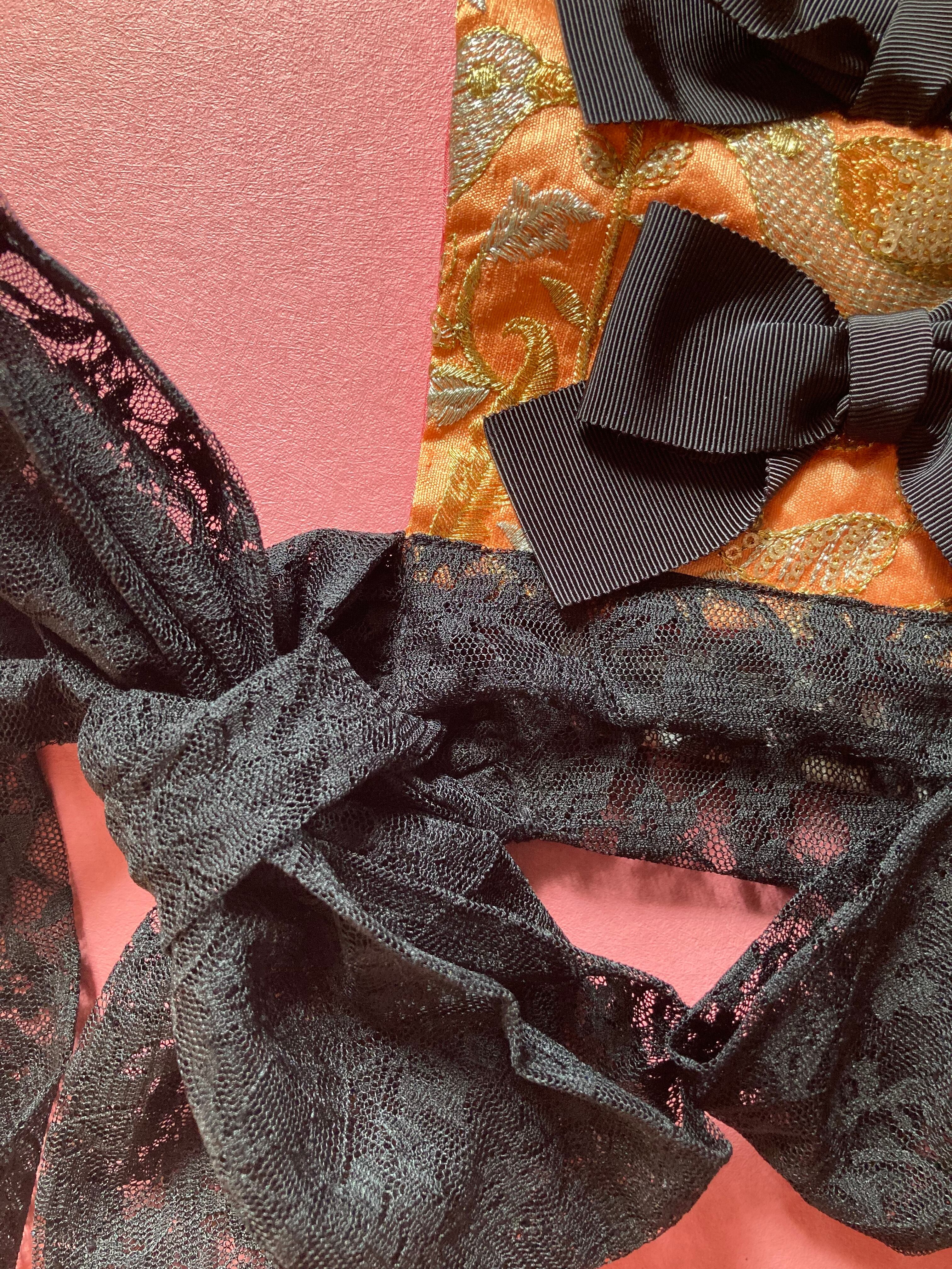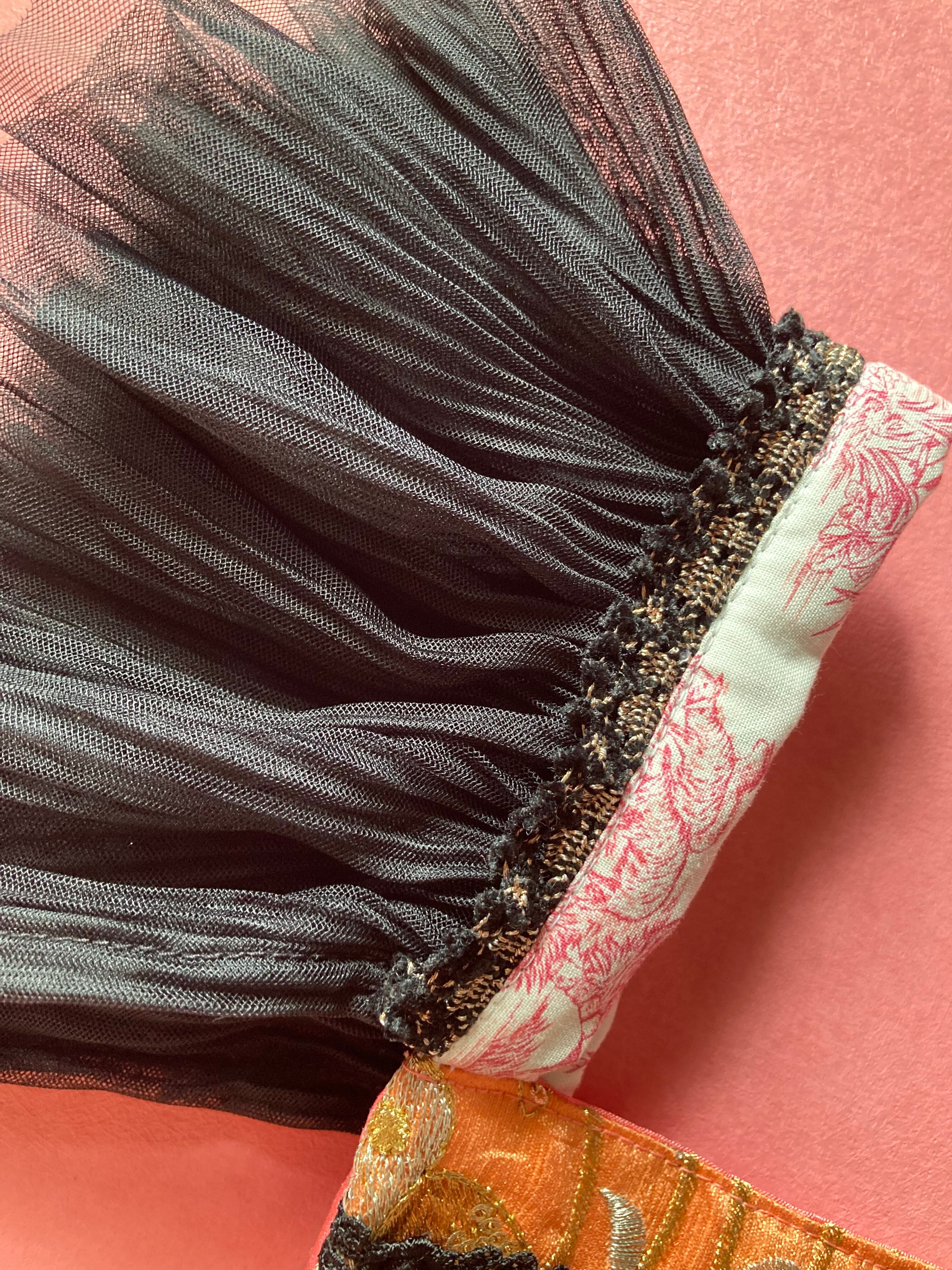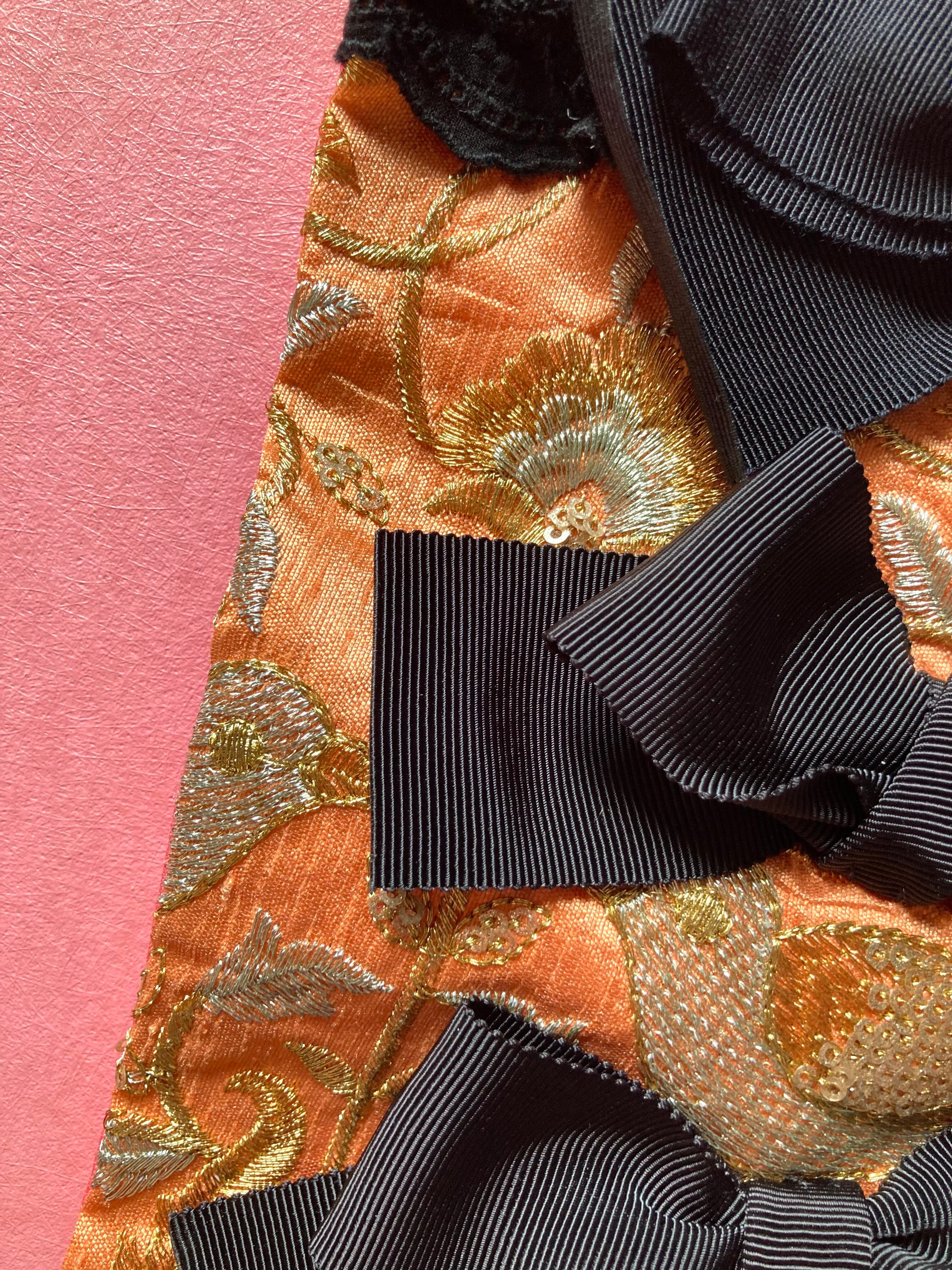 こちらはアプリコットカラーのインド刺繍シルク生地に、エレガントなブラックのグログランりぼんを装飾したダブリエです。バックスタイルと肩紐はトワルドジュイ柄の生地を使いエレガントな印象に仕上げました。
