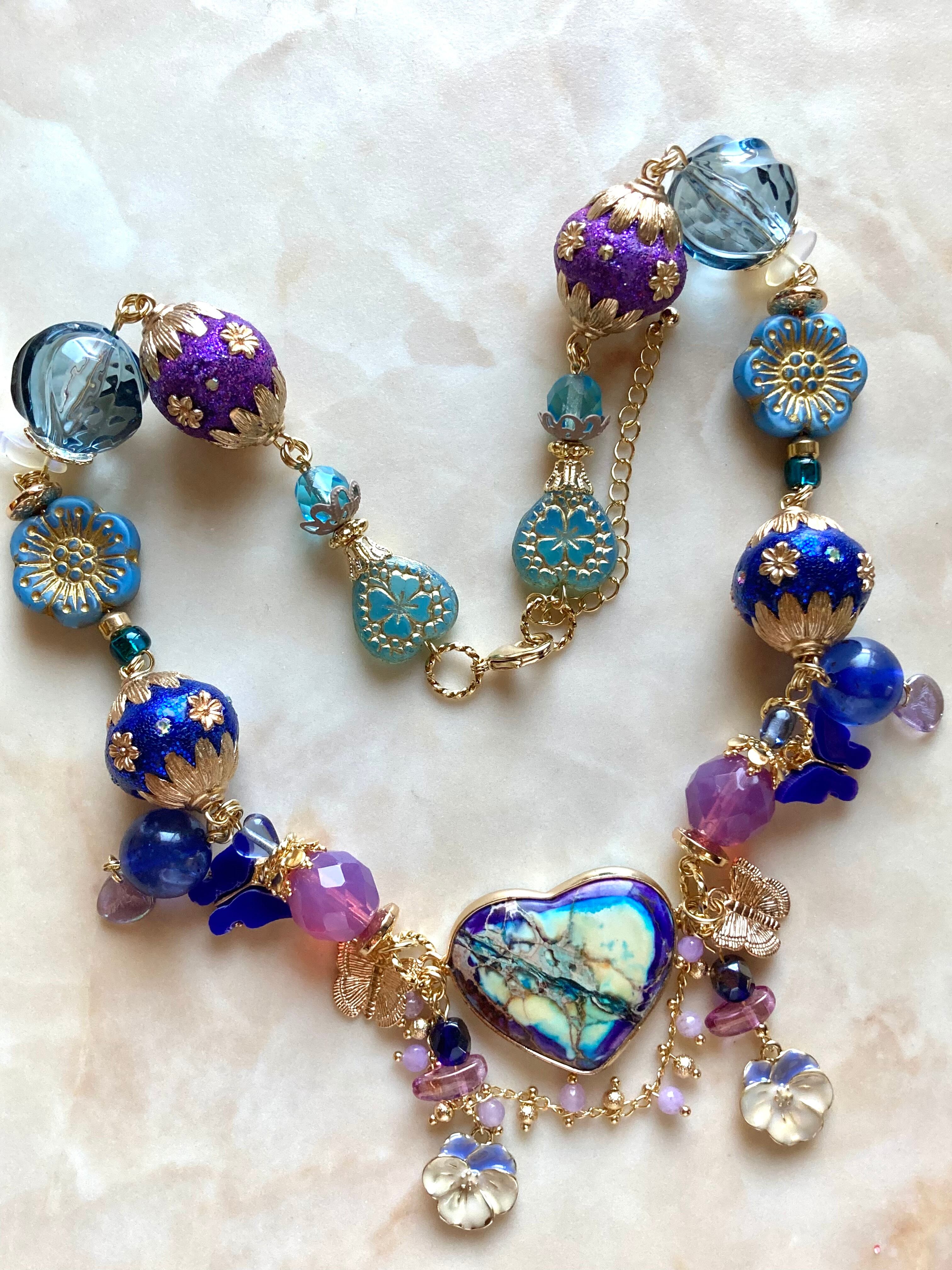 不思議な色の鉱物を組み合わせた煌びやかなネックレス。星や花が垂れ落ちるロマンティックなデザインは、見る人全ての心を捉えてやみません(中央の♡デザインはプリントとなります)