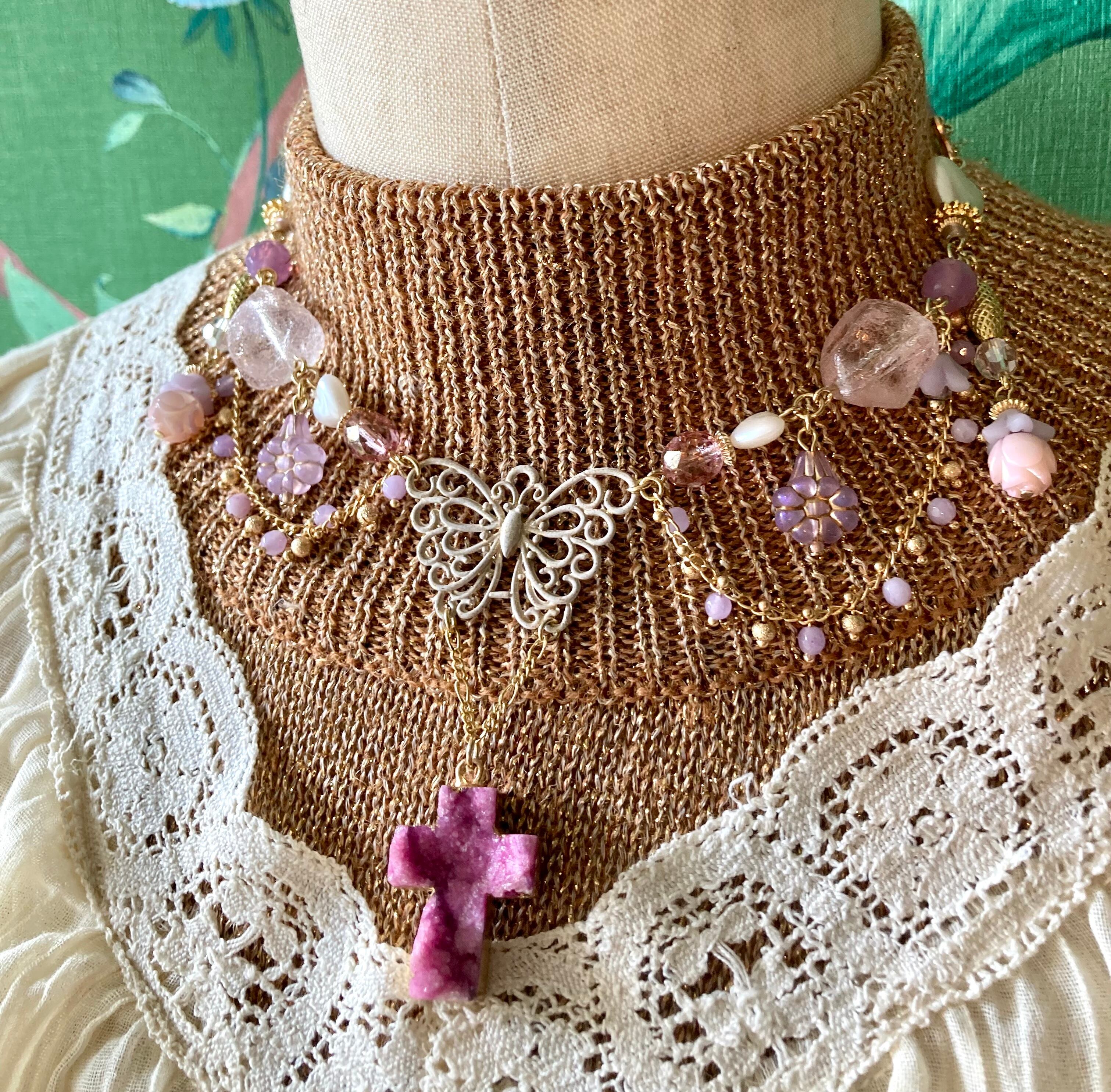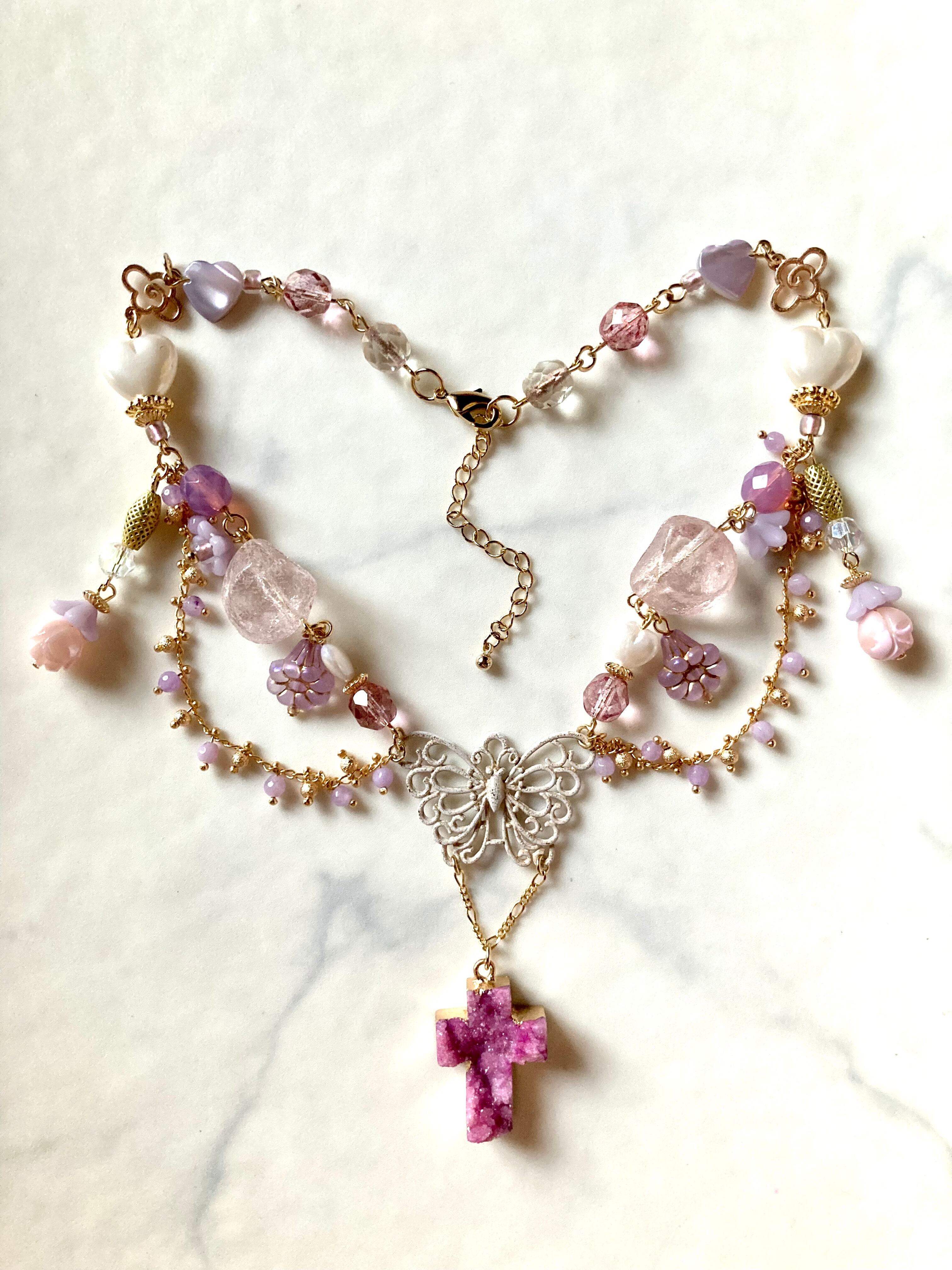 ピンクベージュの繊細な蝶々とドゥルージーの十字架が印象的な、シャンデリアチョーカー。