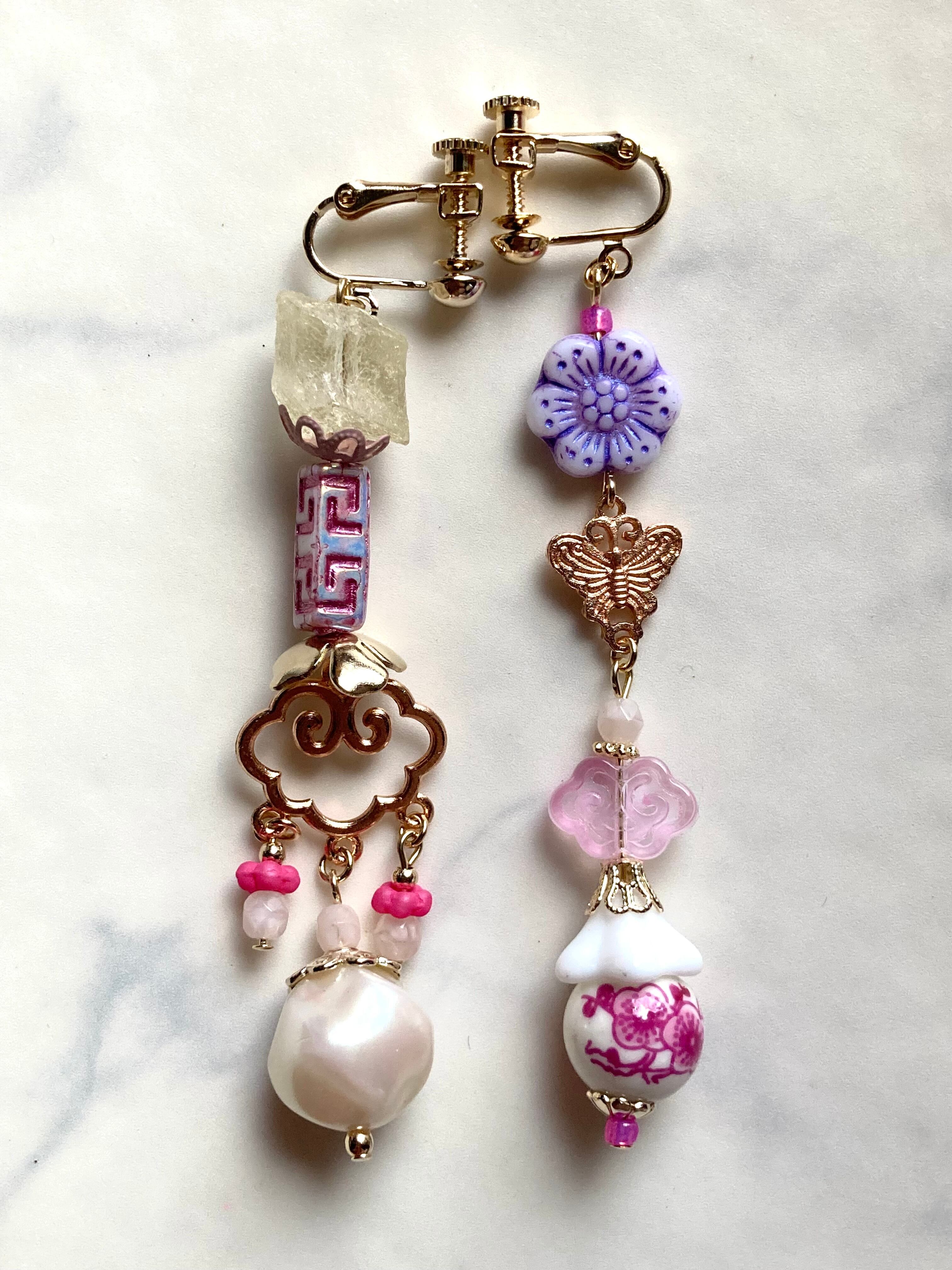 そんな片方だけになった耳飾り達同士を新しく組み合わせてペアにした、左右非対称なシリーズ。アシンメトリーなデザインは、幾つか集めるとあなただけの組み合わせが組めるのも魅力のひとつ。