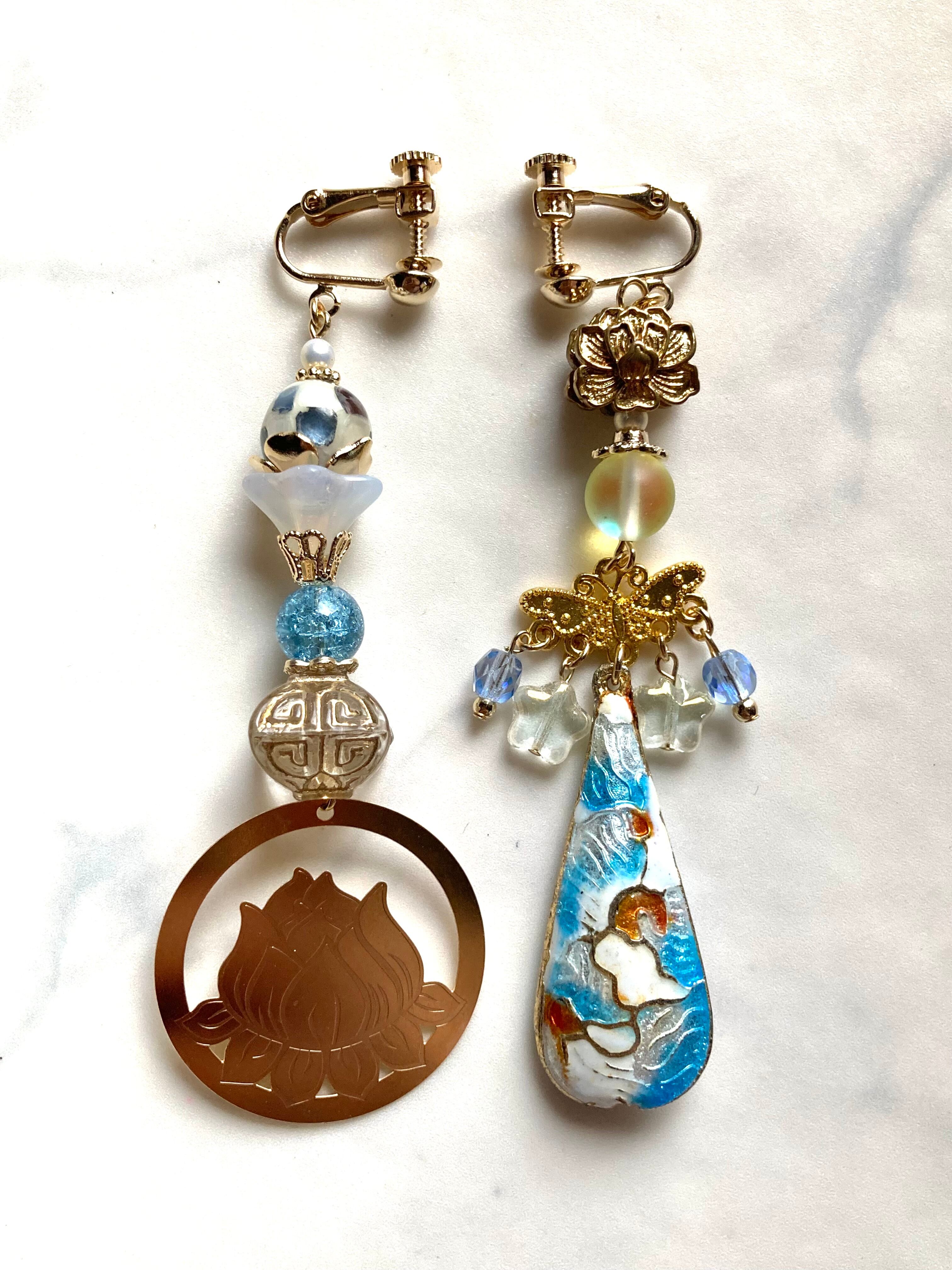 そんな片方だけになった耳飾り達同士を新しく組み合わせてペアにした、左右非対称なシリーズ。アシンメトリーなデザインは、幾つか集めるとあなただけの組み合わせが組めるのも魅力のひとつ。