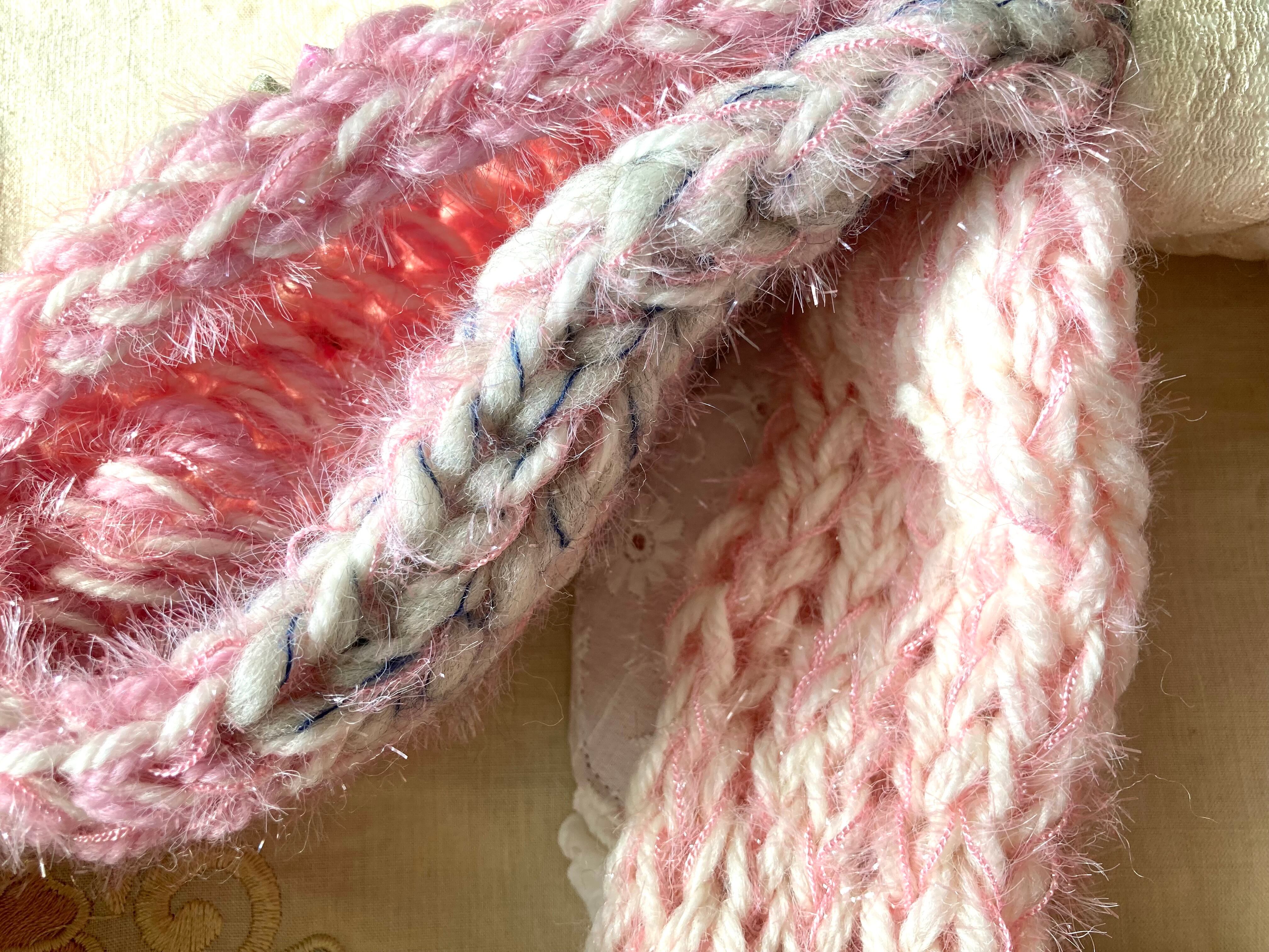 左右非対称に編んでいます。毛糸の組み合わせやちぐはぐなディティールの可愛さをお楽しみください。