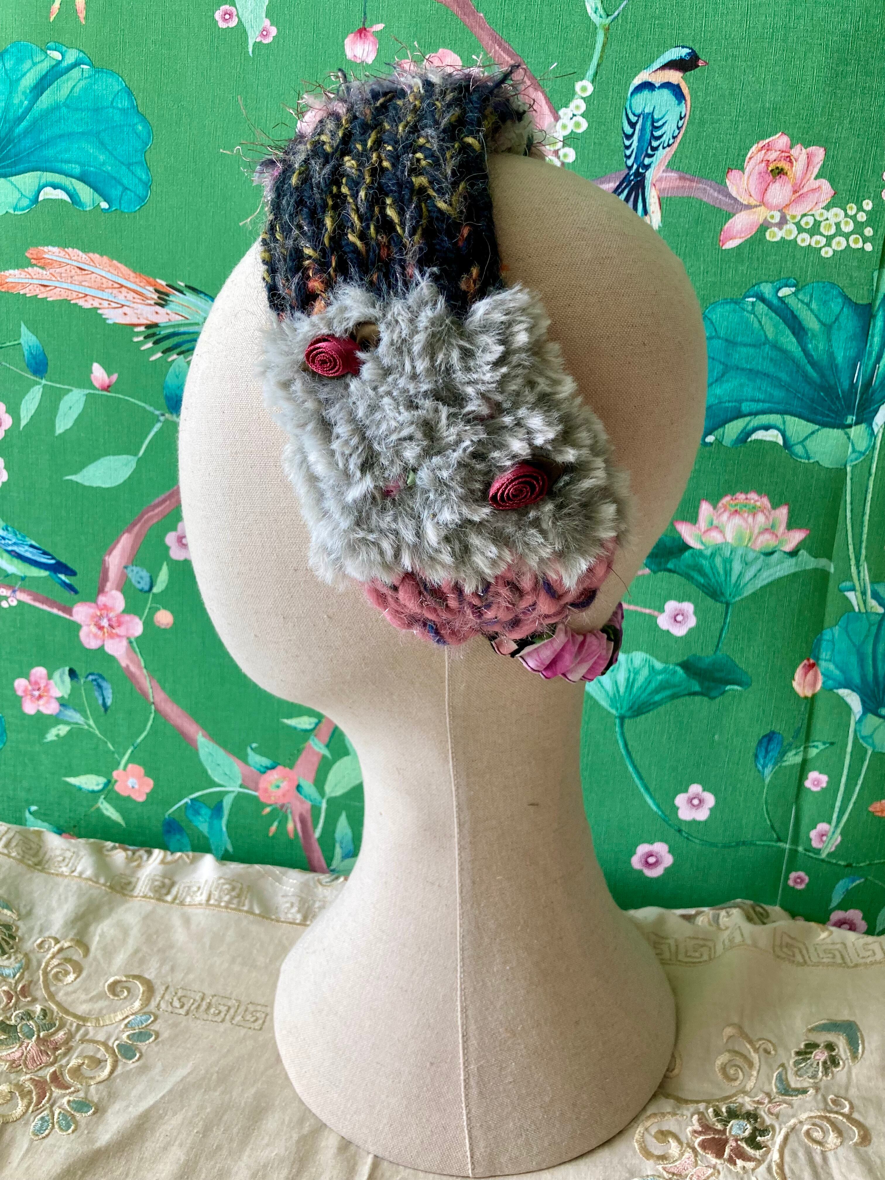 複数の毛糸をパッチワークの様に編んだニットヘアバンド。