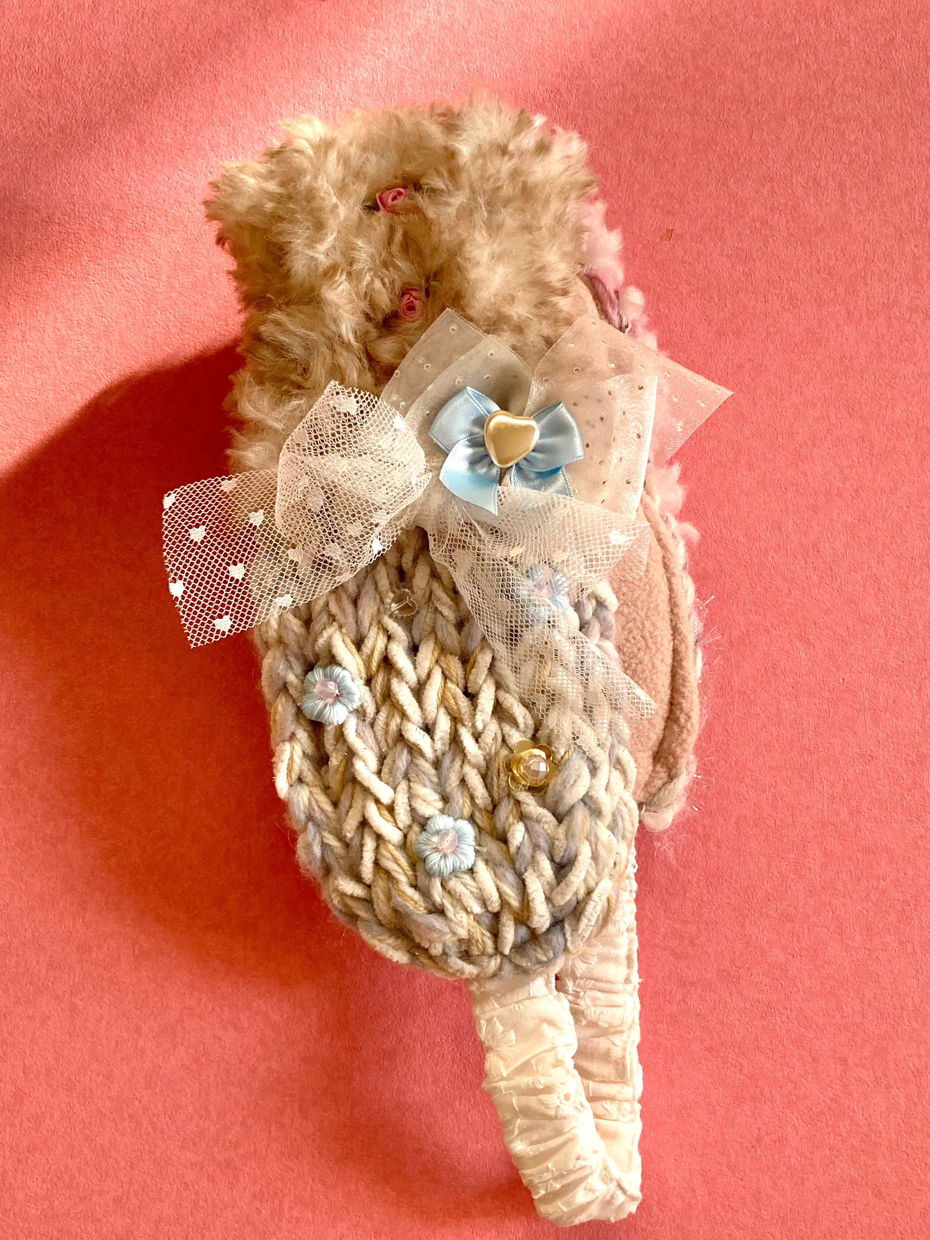 上にレースやビーズ、りぼん等をコラージュし、何処から見ても違う可愛さを楽しめるデザインに仕上げました。