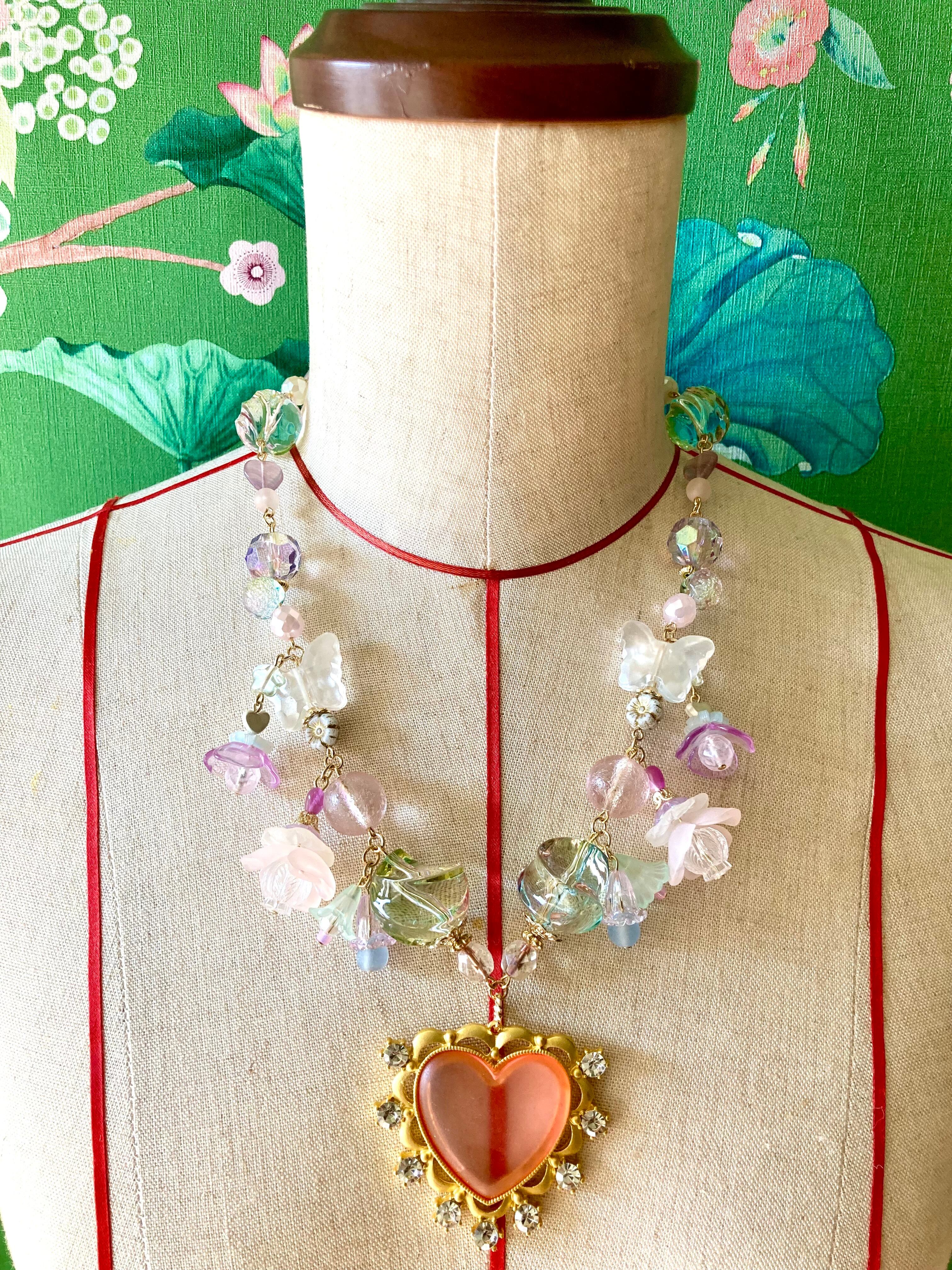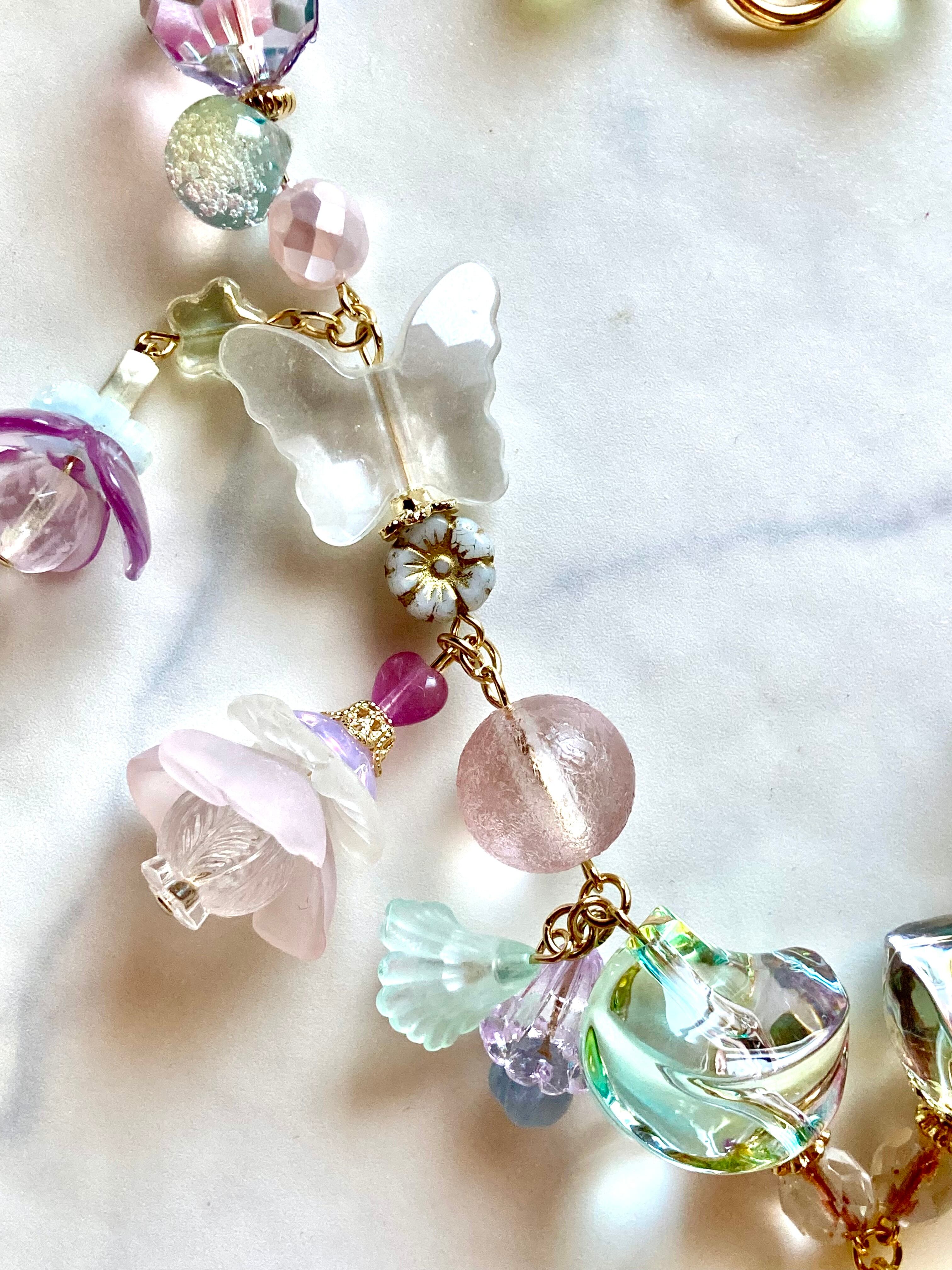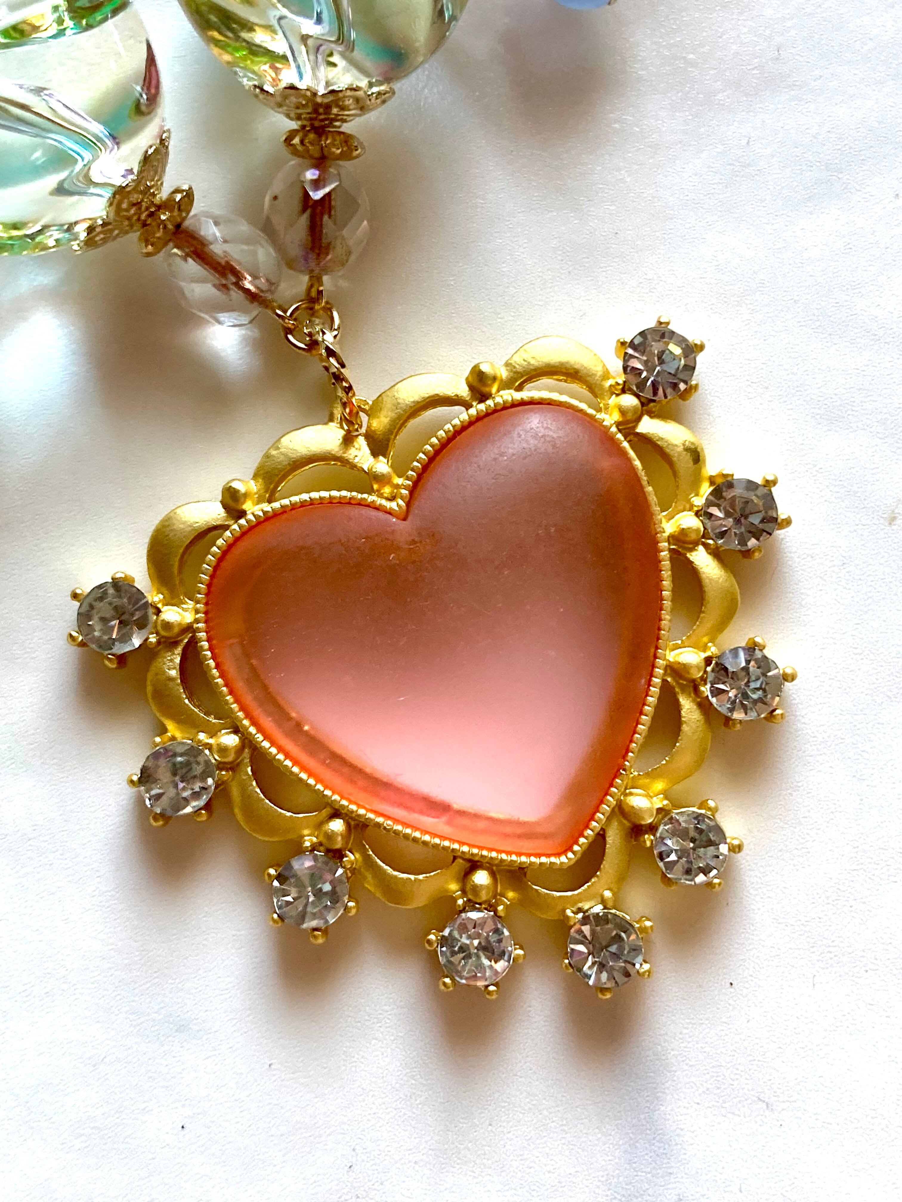 大きなスリ硝子のハートのペンダントトップと、楽園の花畑をイメージしたパステルなシャボンカラーのビーズが印象的なデザインです。