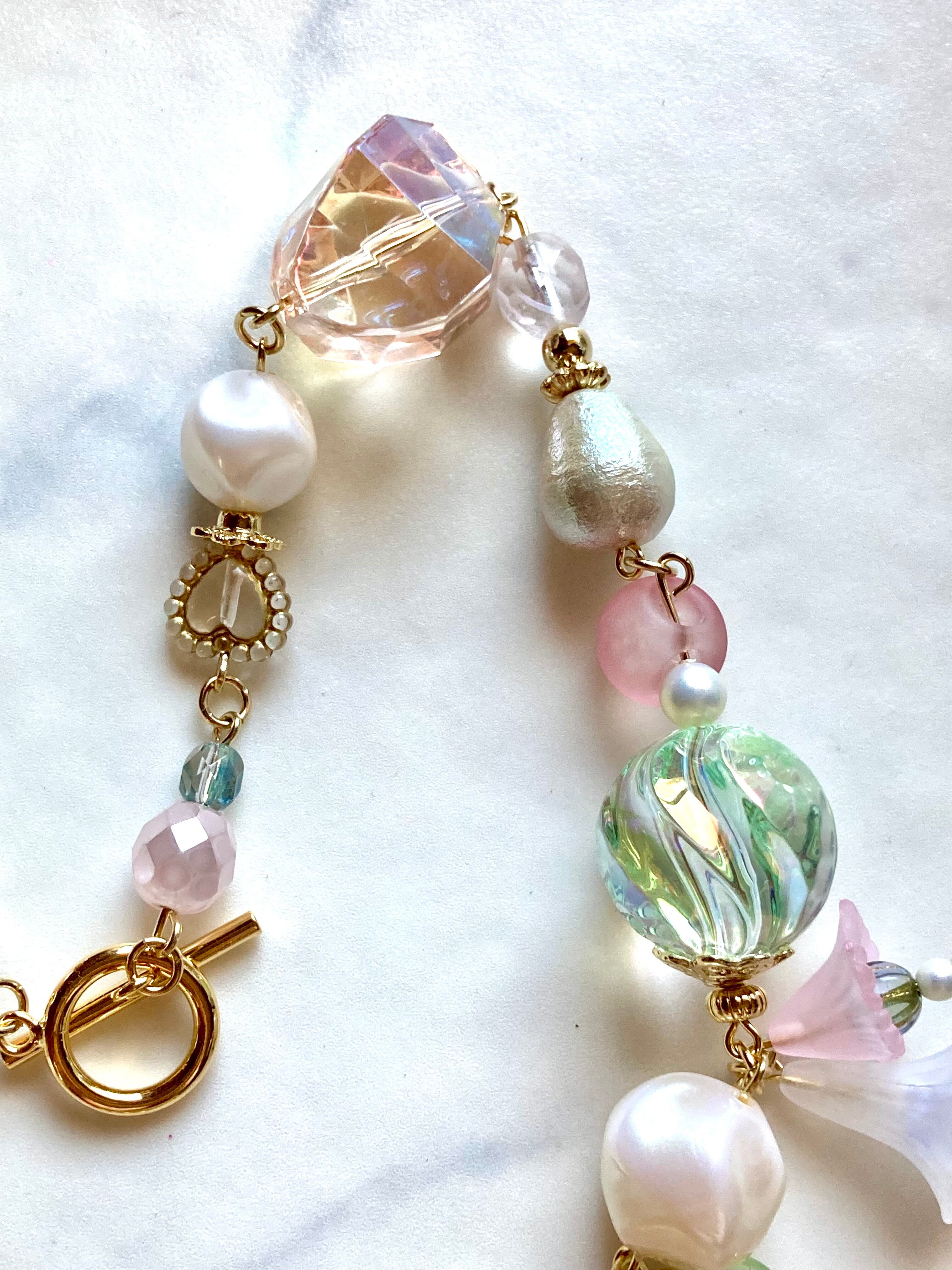 大きなスリ硝子のハートのペンダントトップと、楽園の花畑をイメージしたパステルなシャボンカラーのビーズが印象的なデザインです。