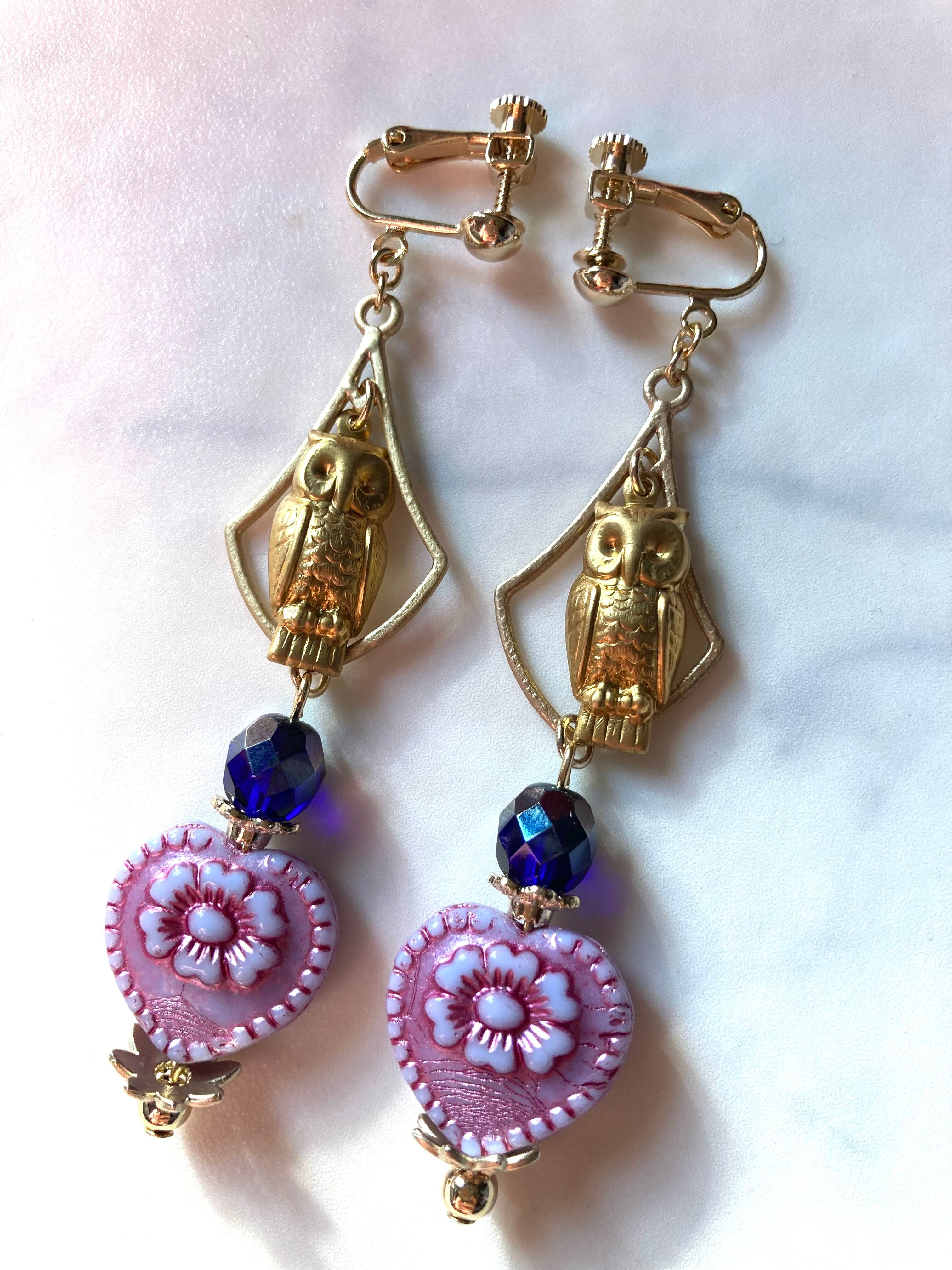 幸運のシンボルのフクロウチャームを、ミッドナイトカラーの硝子ビーズと合わせてミステリアスな雰囲気の耳飾りに仕上げました。
