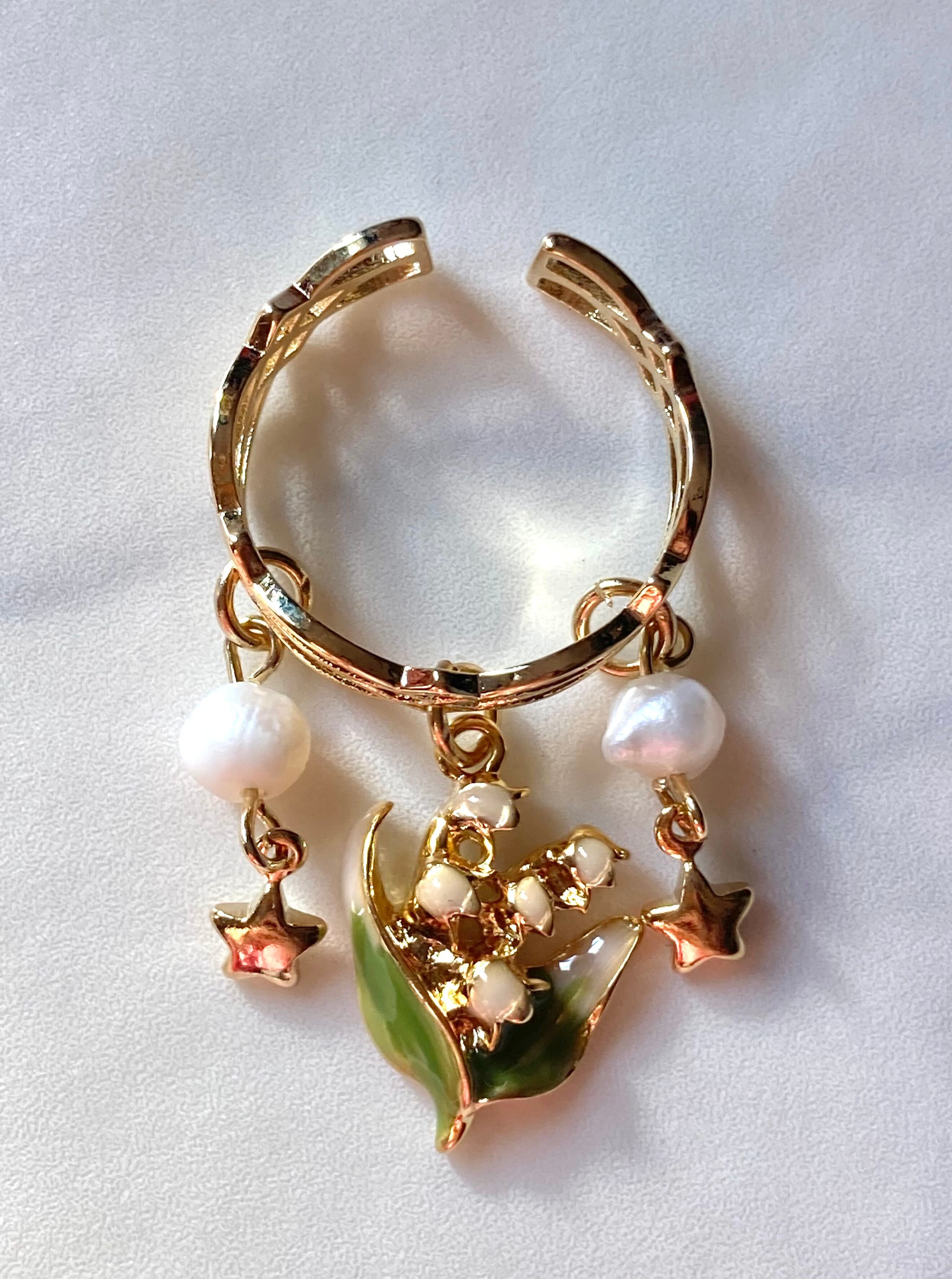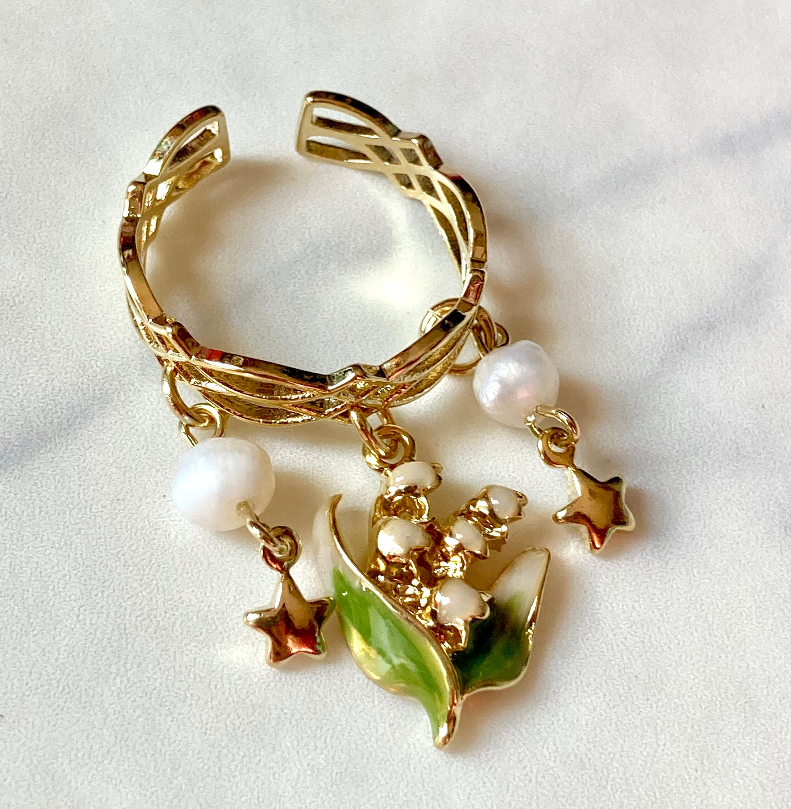 淡水パールと小さな星のチャームをあしらった、ロマンティックな鈴蘭リングです。