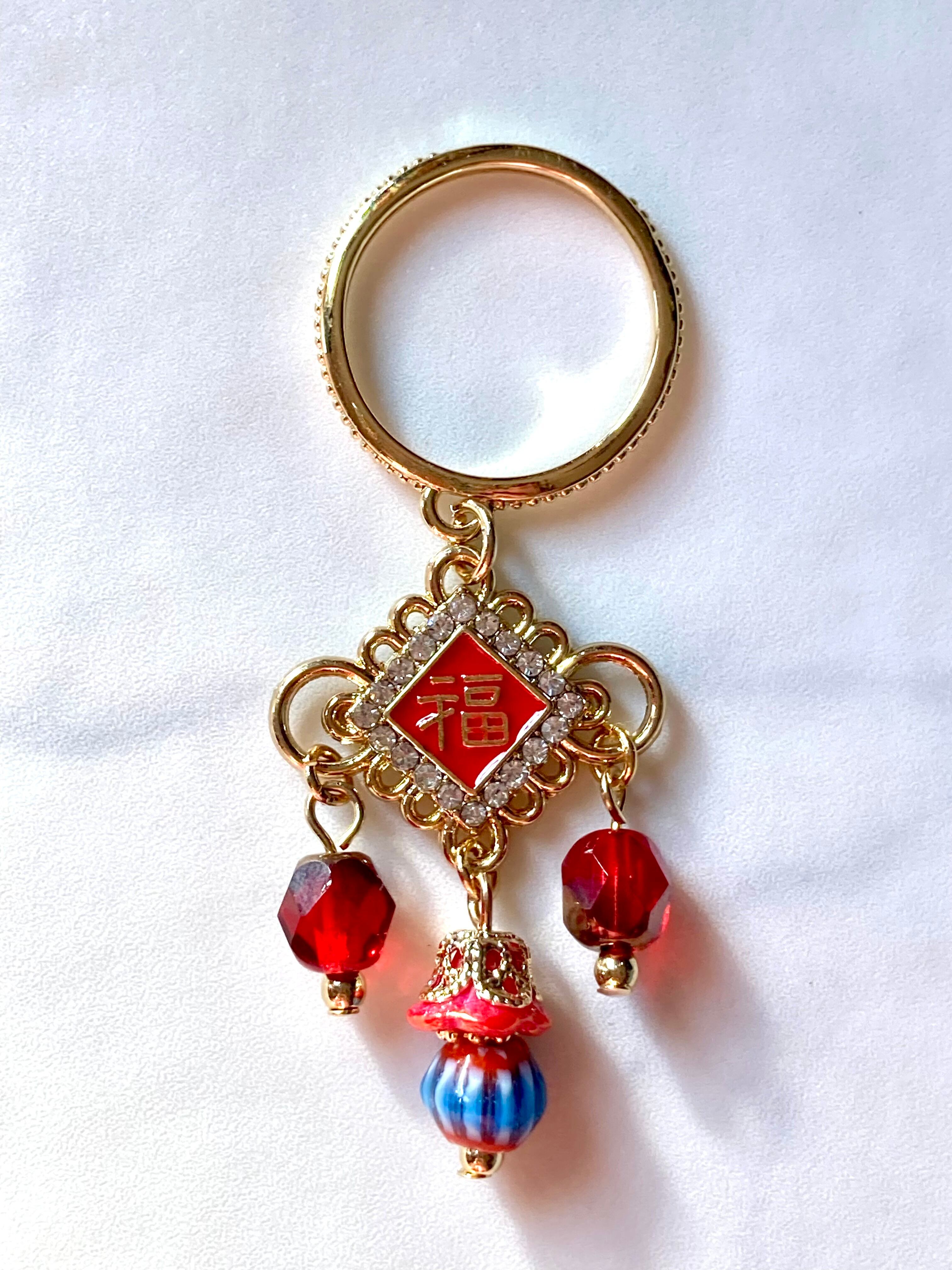 吉祥モチーフの福飾りをイメージして、チェコ硝子ビーズのチャームを垂らしました。