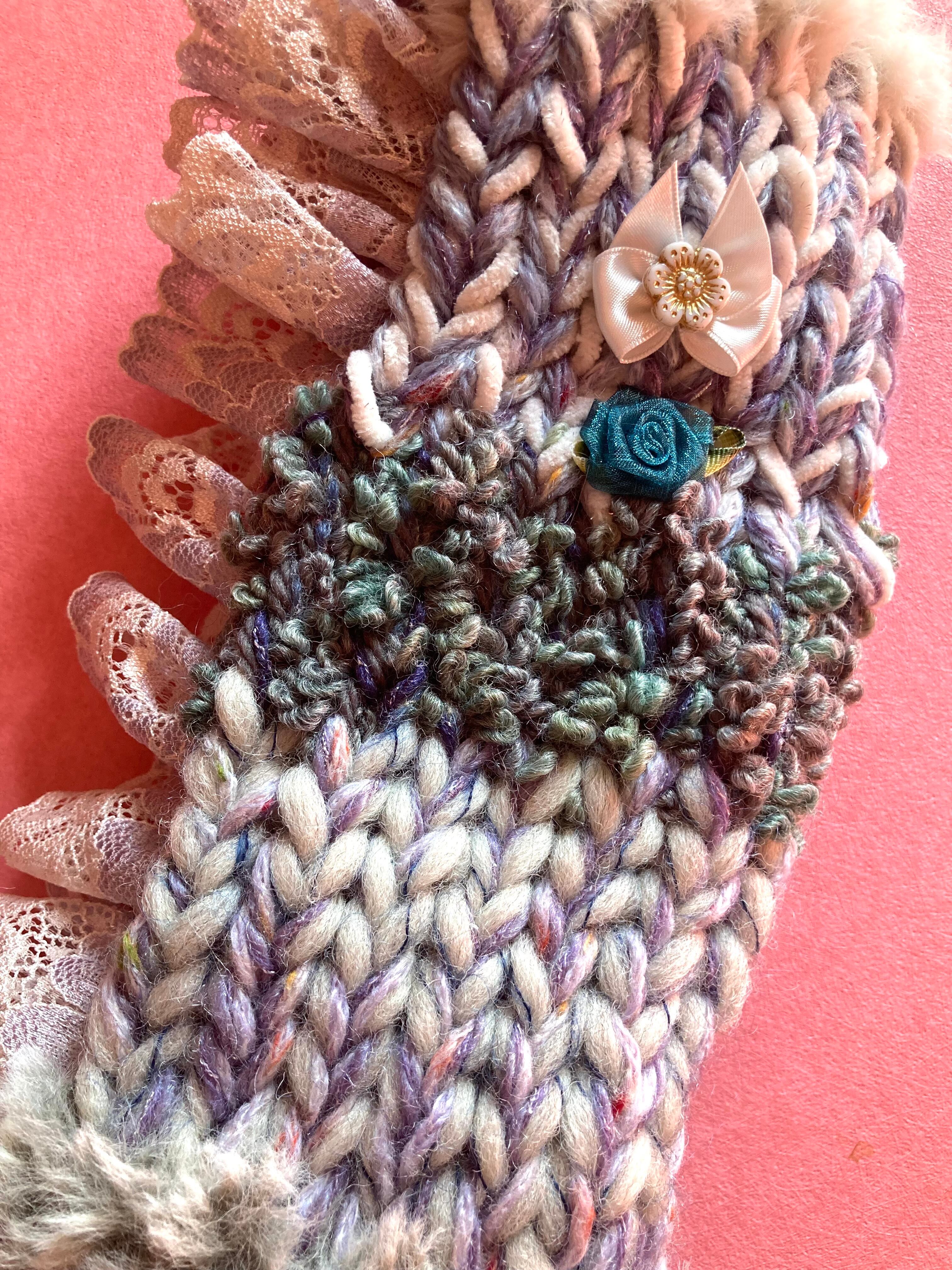 複数の毛糸をパッチワークの様に編んだニットヘアバンド。