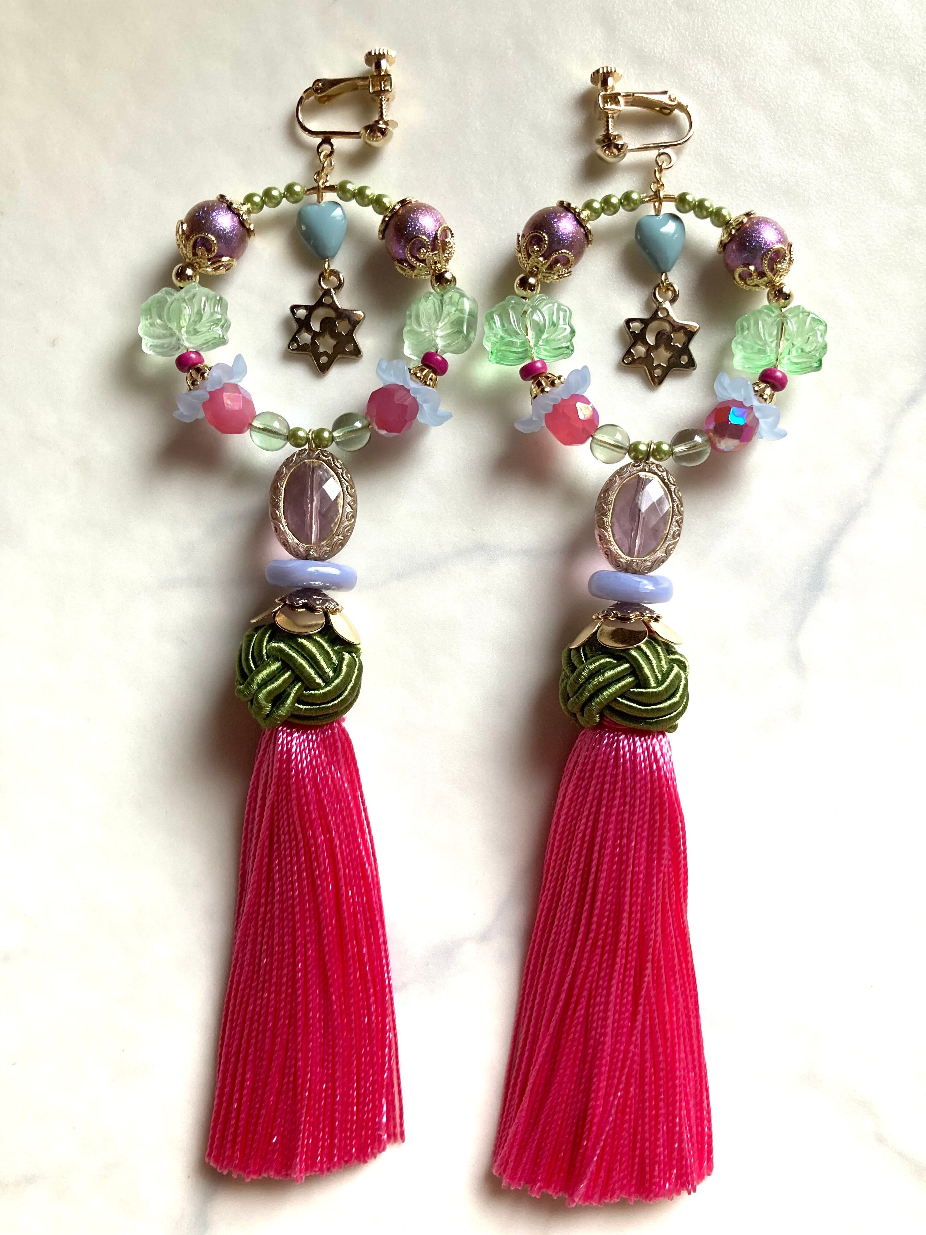 巨人の盤古が使う栞をイメージした大振りのタッセルと、物語をイメージした装飾的なフープが華やかな中華デザインです。