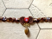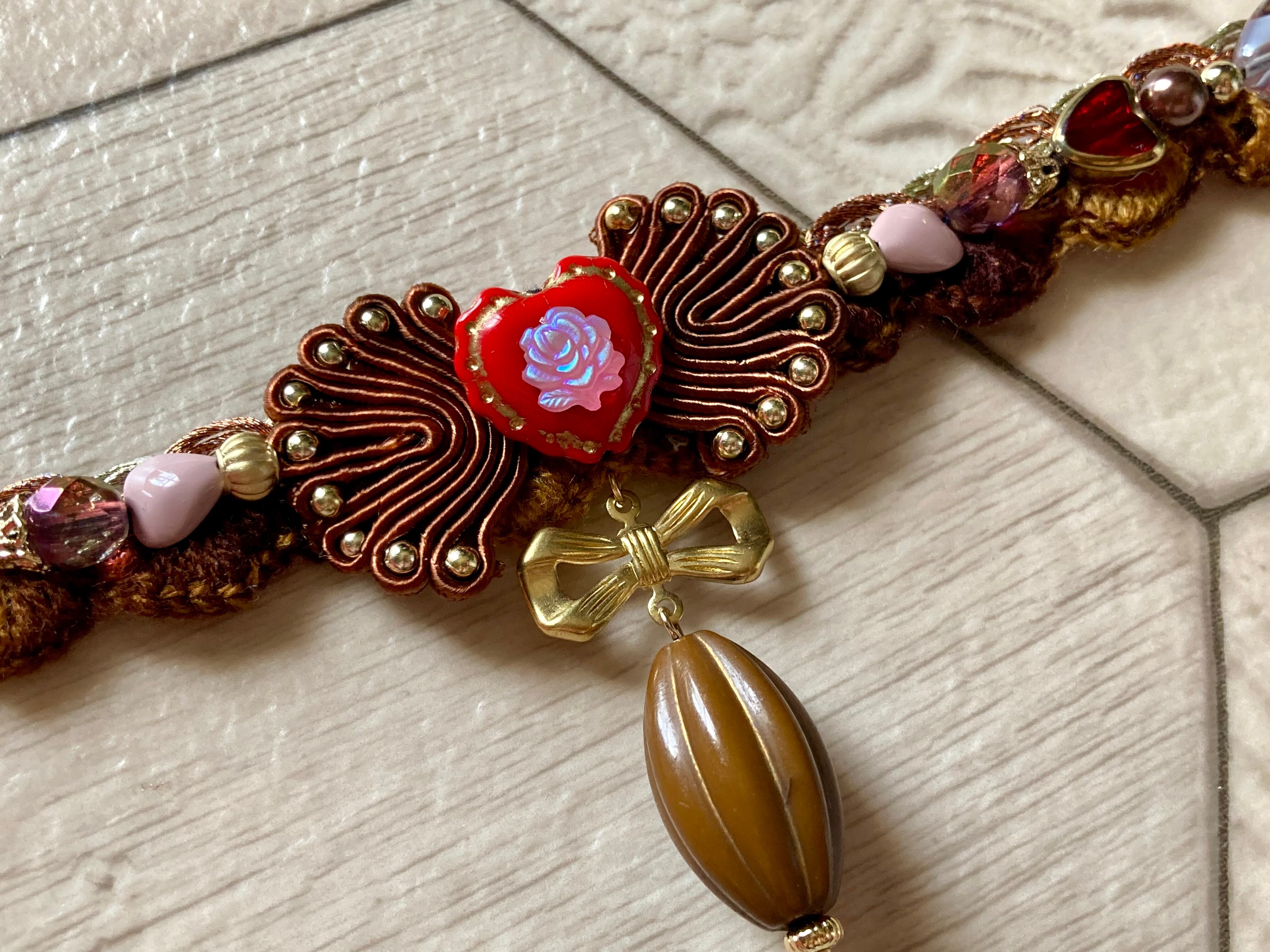 カカオの様なビーズをチャームにし、チェコガラスビーズとヴィンテージの薔薇カボションを合わせて大人っぽいスイーツデザインに仕上げました。
