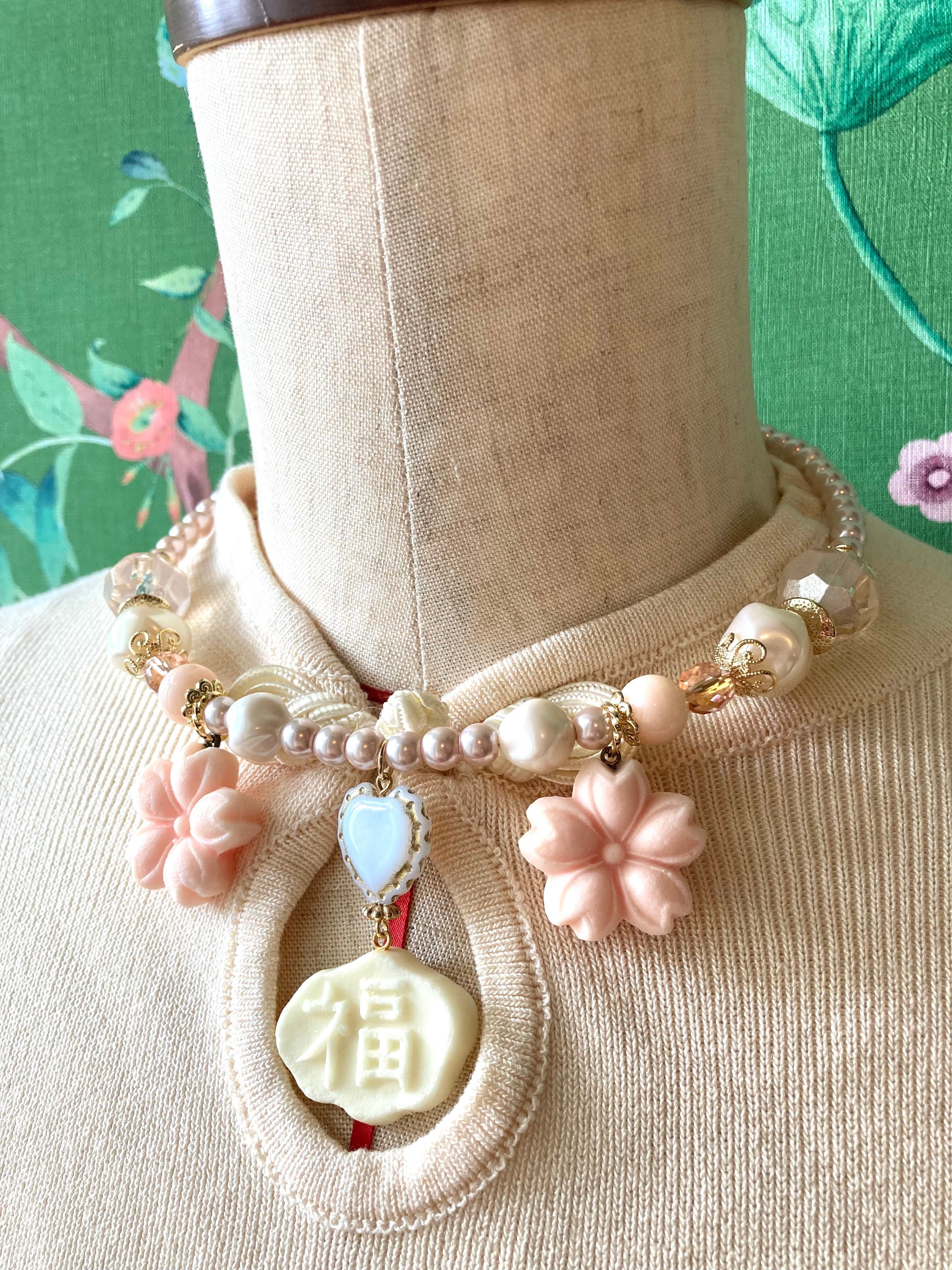 干菓子の様な桜チャームが可愛いワイヤーネックレス。❀·̩͙꙳。どんなお洋服に合わせてもこれひとつで桜コーデが完成するデザインです。