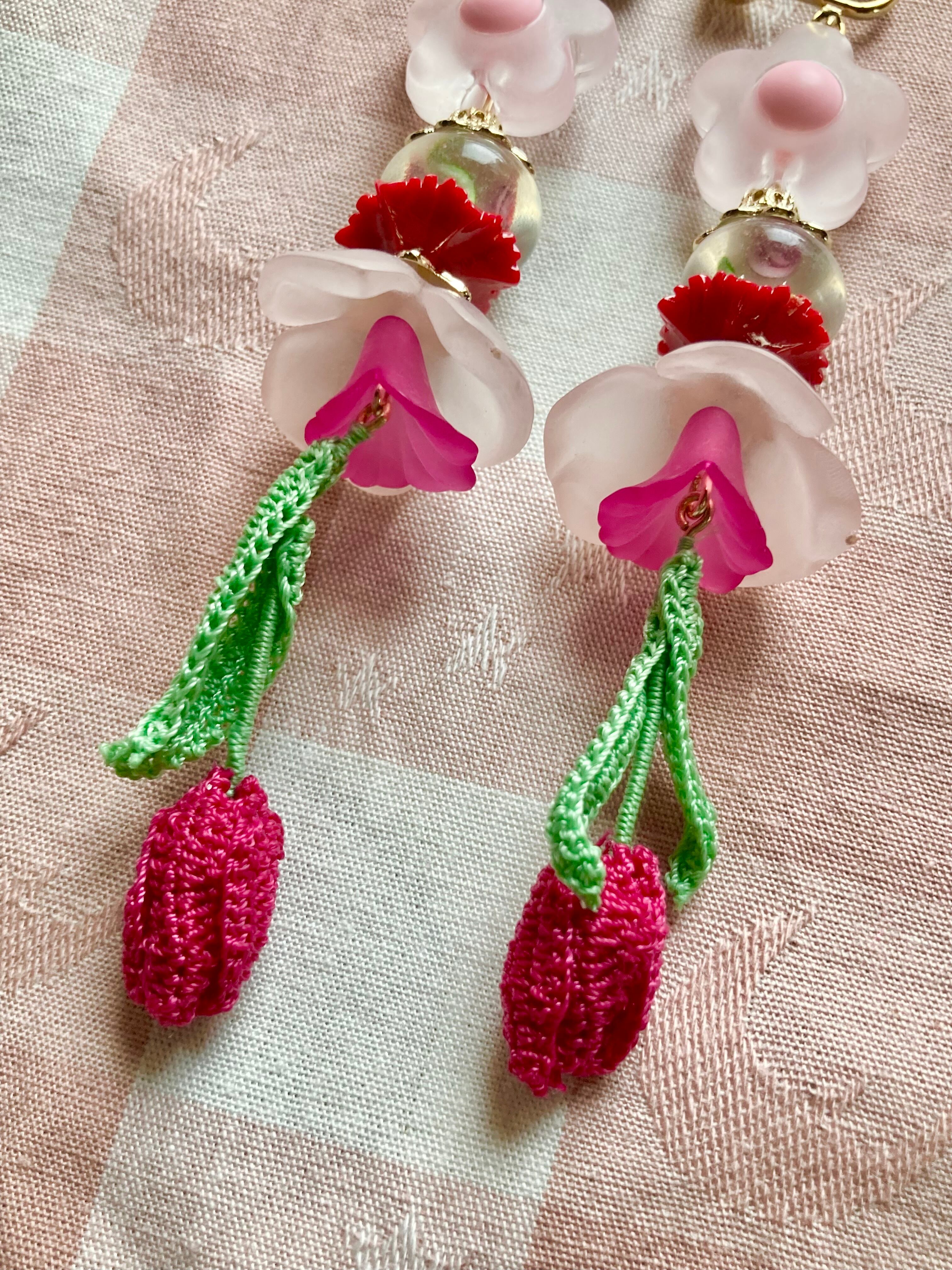 ピクニックに持っていくフルーツやチューリップなどのモチーフを春らしいデザインのアクセサリーに仕立てました