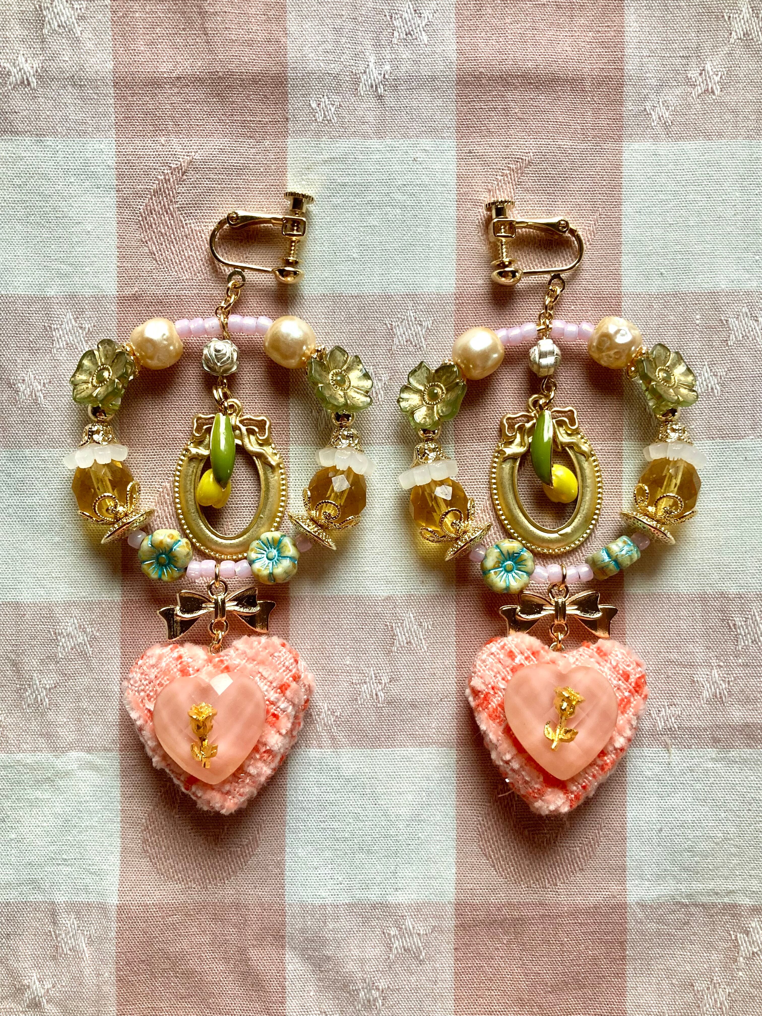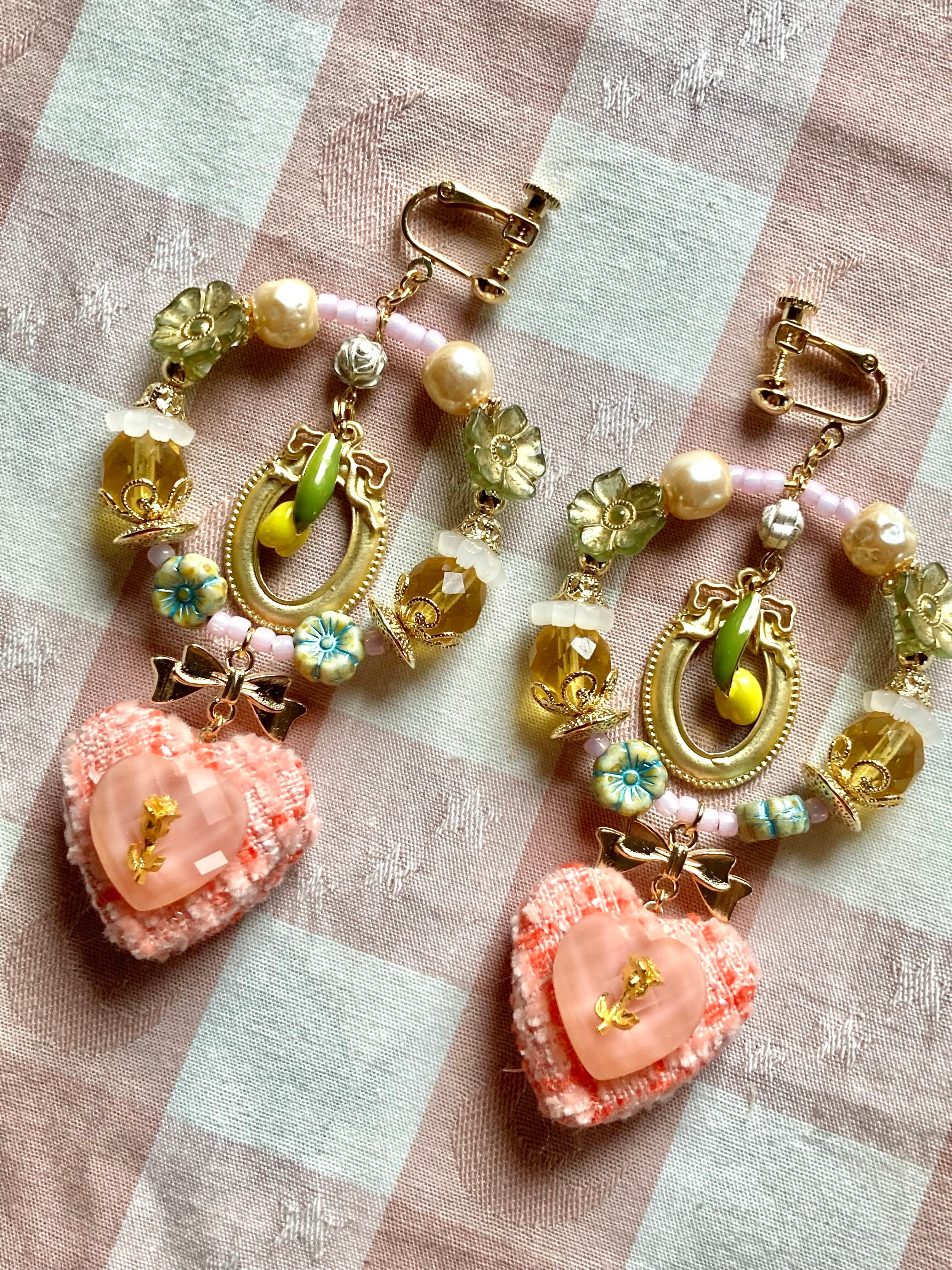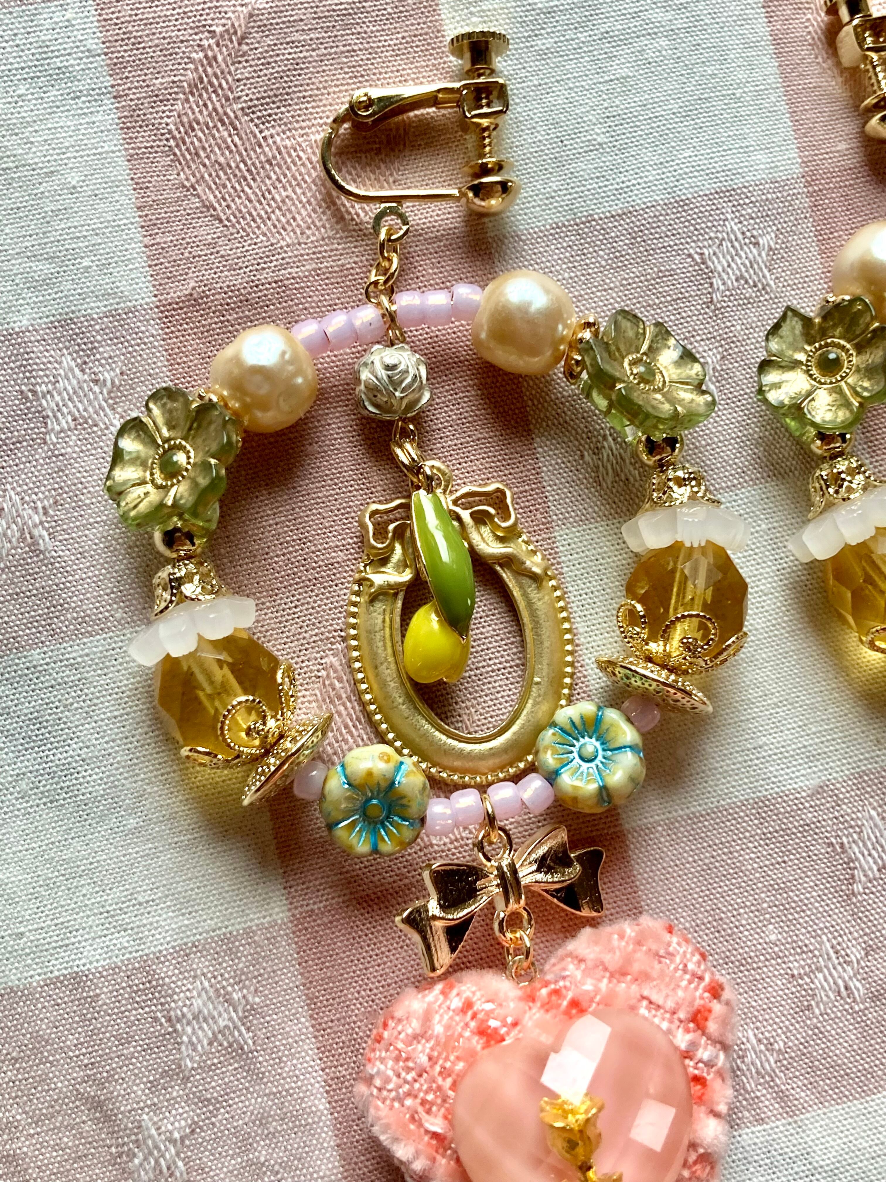ピクニックに持っていくフルーツやチューリップなどのモチーフを春らしいデザインのアクセサリーに仕立てました。