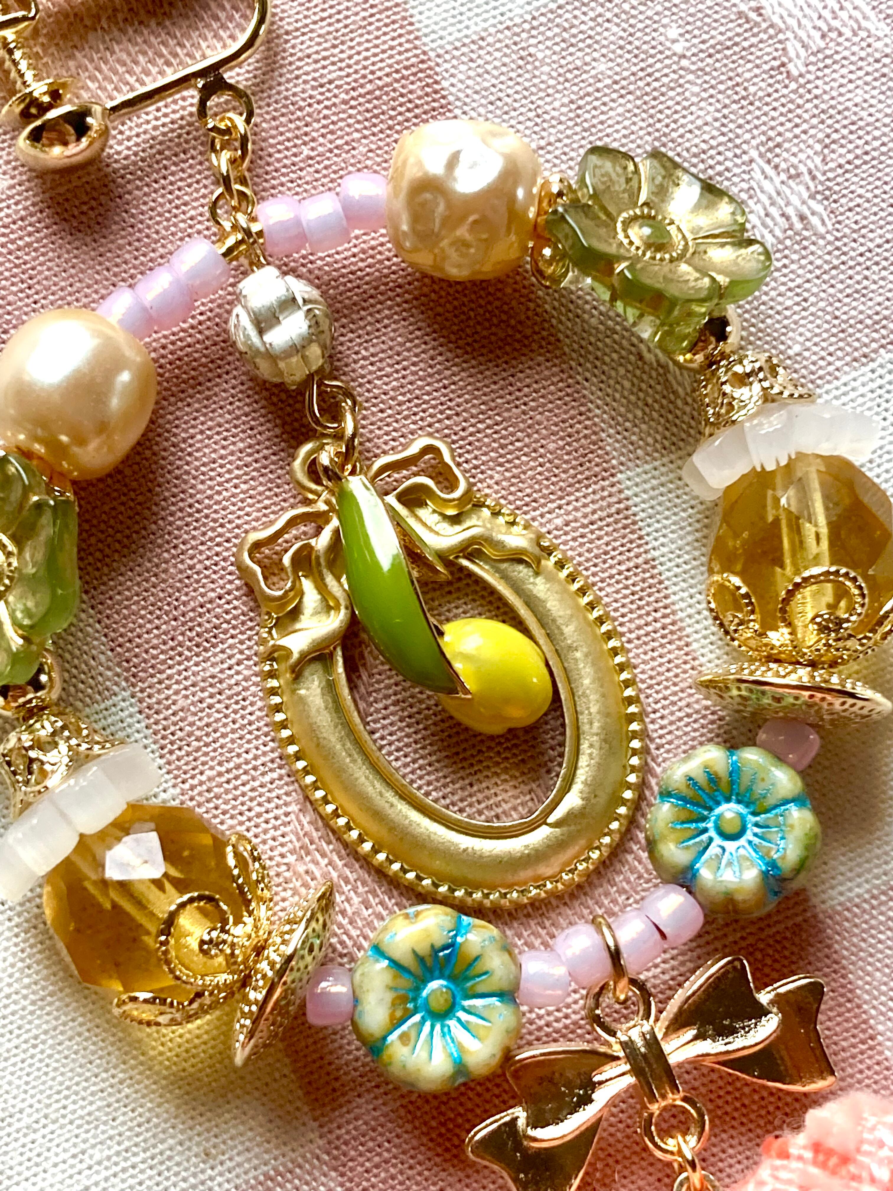 素材:チェコ硝子ビーズ、ドイツ製アクリルビーズ、キャストパーツなど