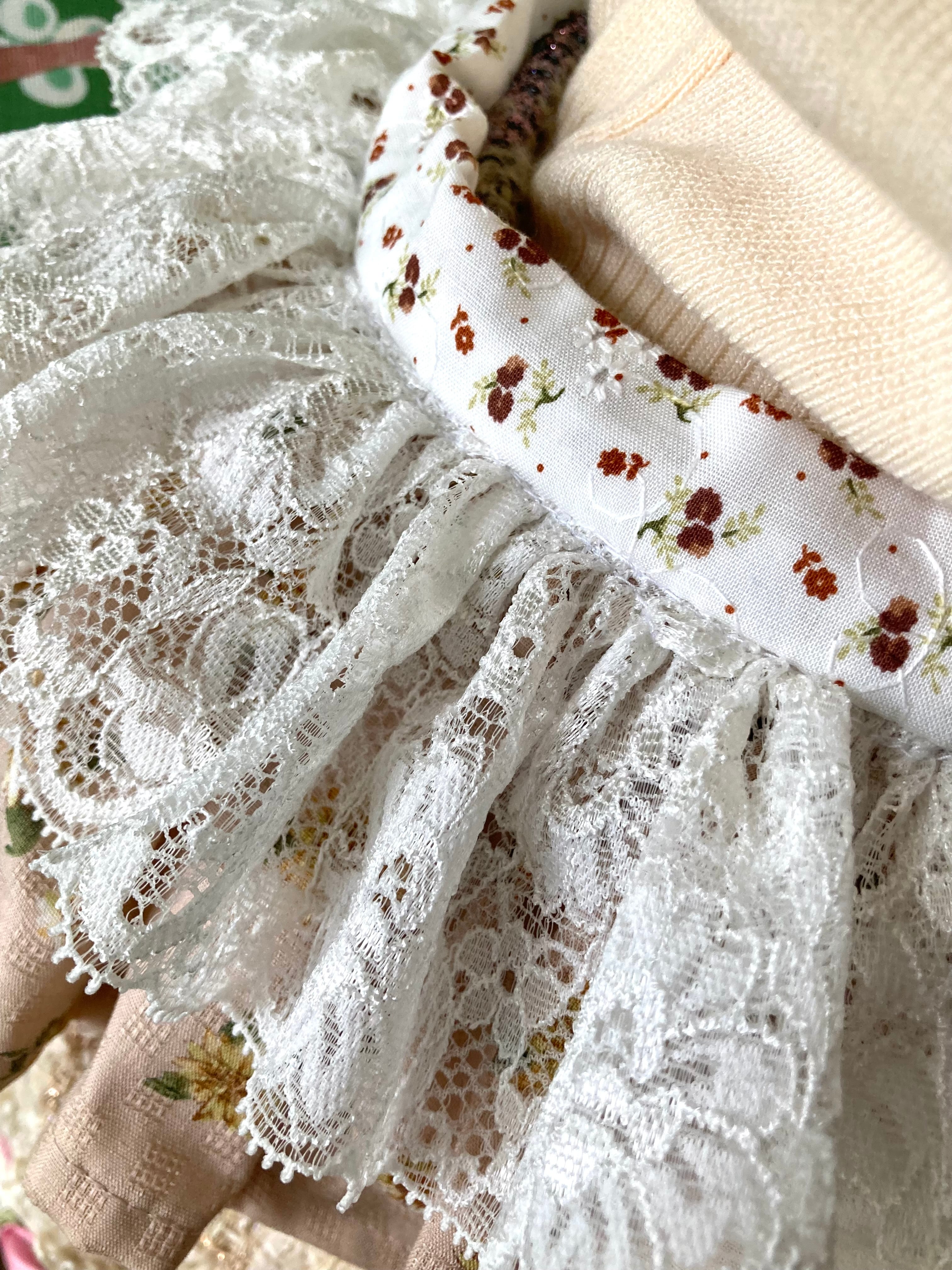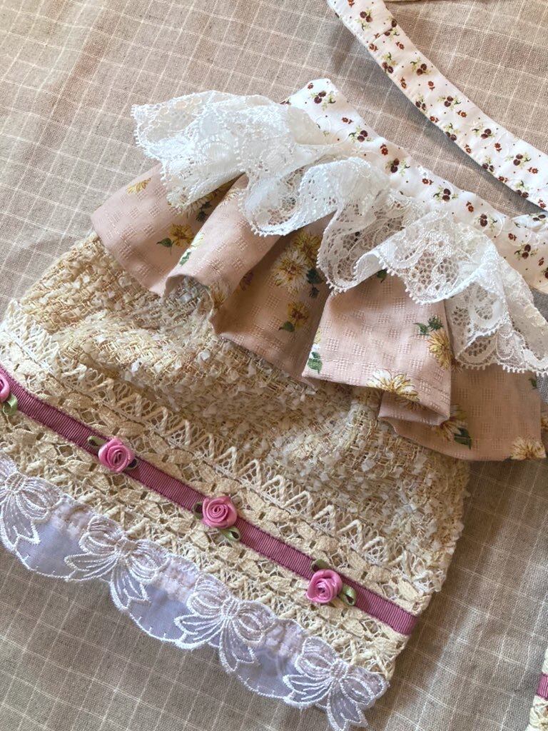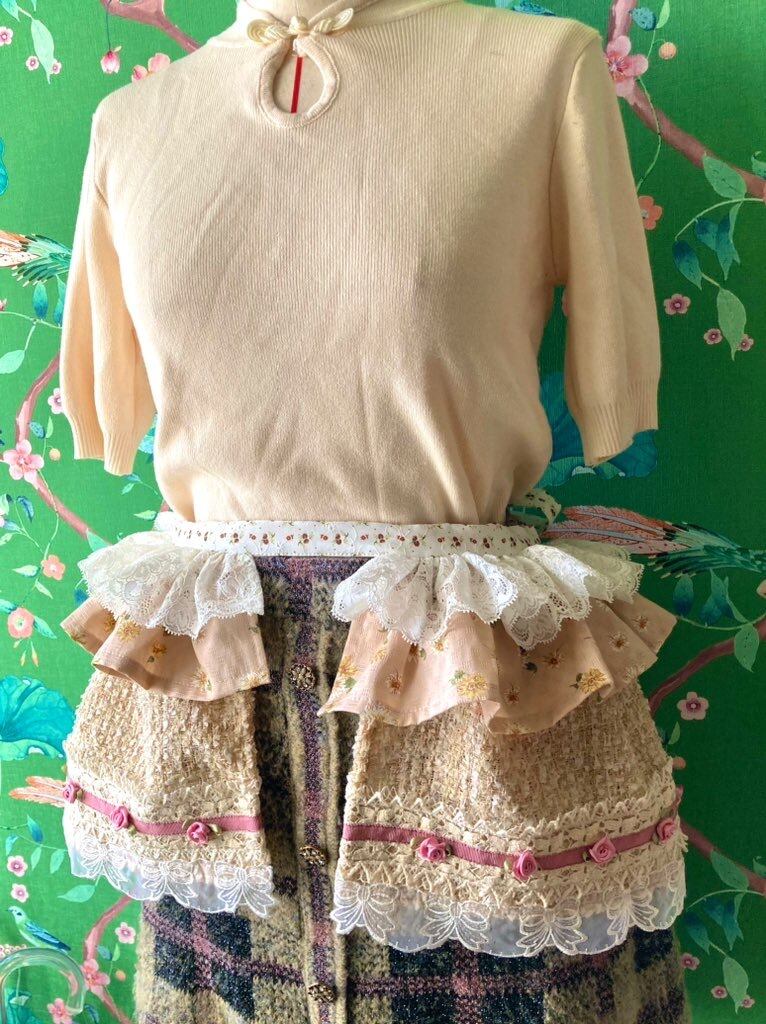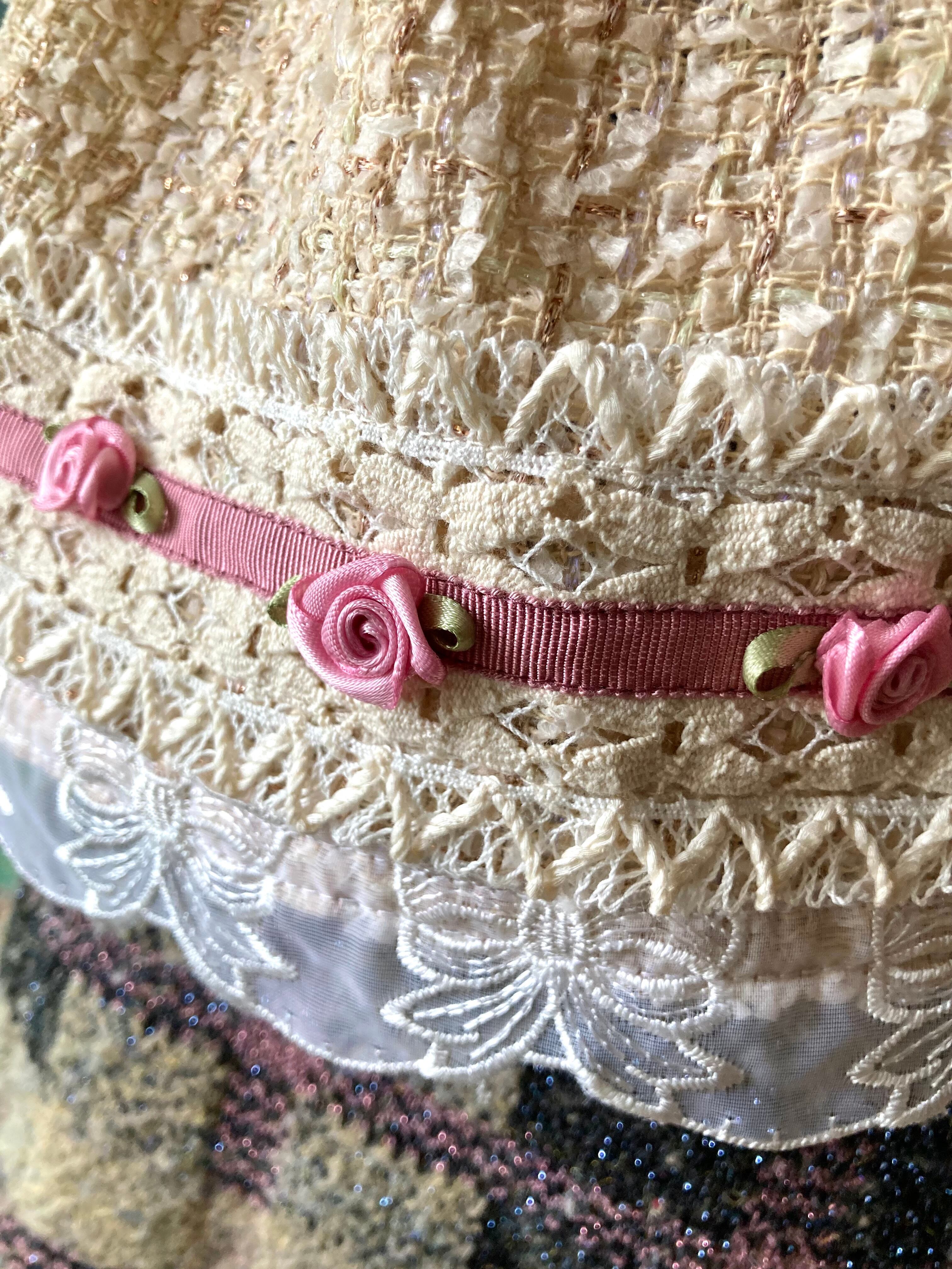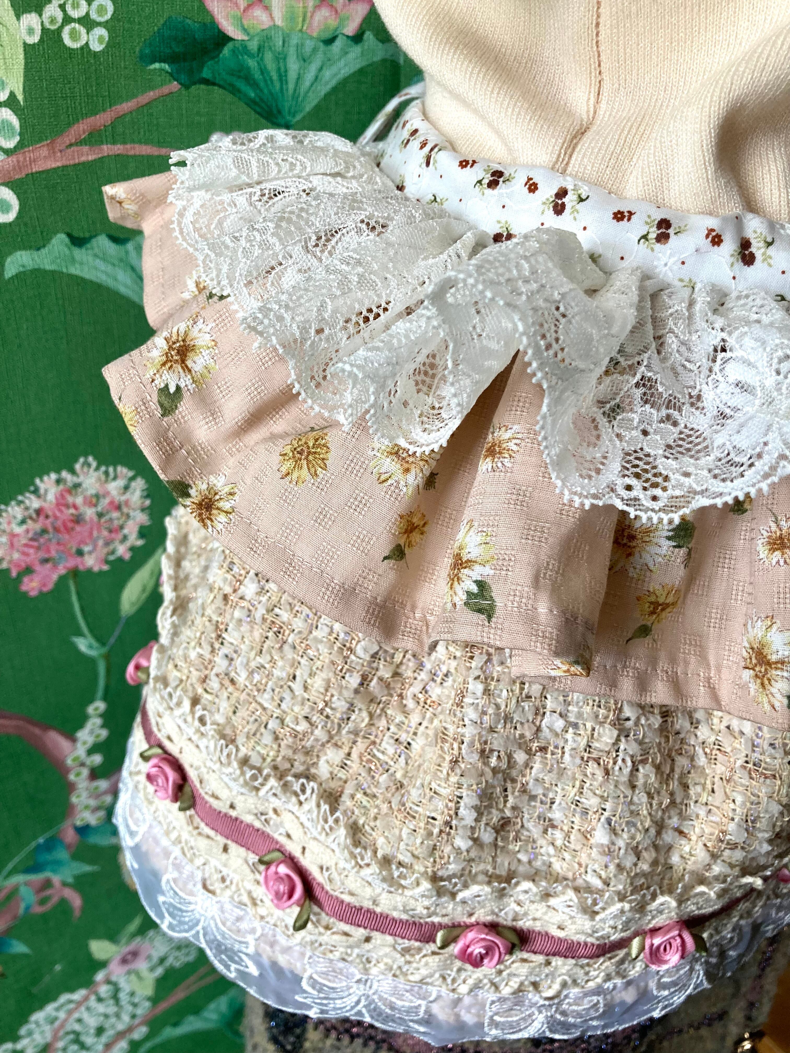 合わせやすいベージュのツイード生地に生クリームやジャムの様なフリルなどの装飾をほどこしました。