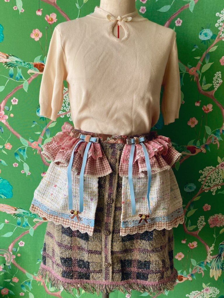 ボトムスやワンピースの上にエプロンの様にサッと着けてレイヤードスタイルを楽しめる、オーバースカートを制作しました。