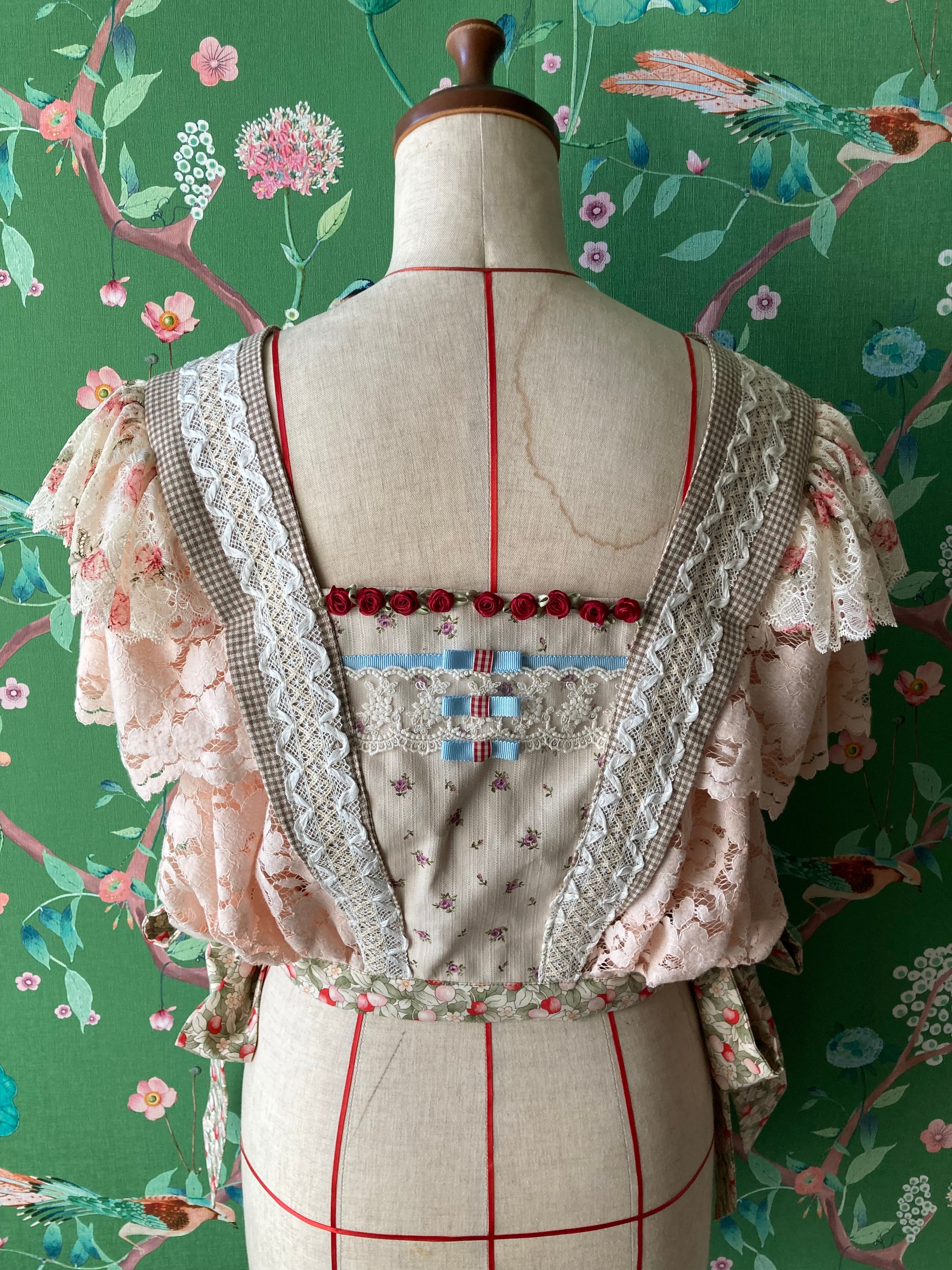 肩には薔薇柄のレース、ウエストにはチェリー柄の生地。市販されていない貴重なトーションレースなどを贅沢に使用し、細部までロマンティックに仕上げました。