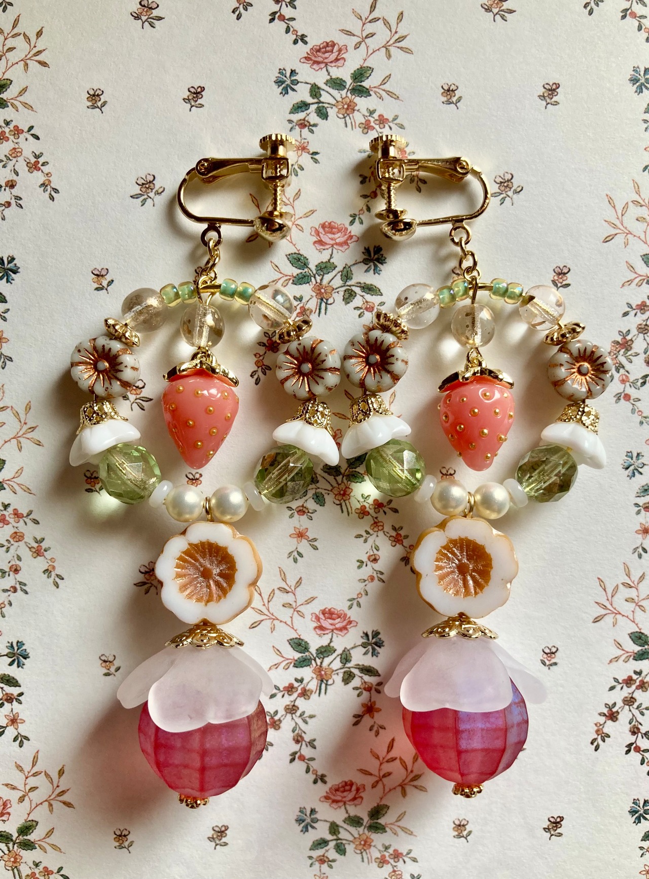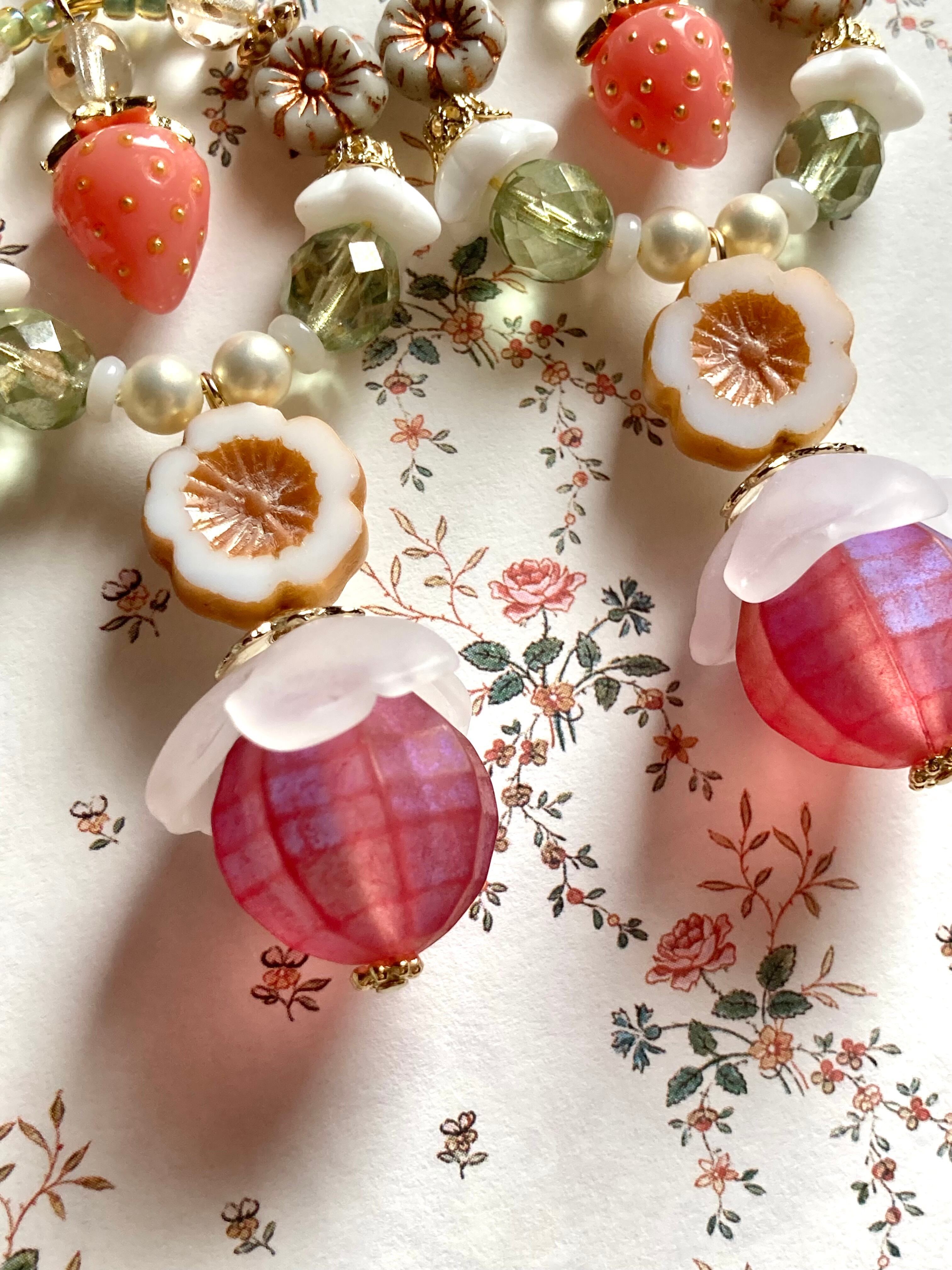 素材:チェコ硝子ビーズ、ドイツ製アクリルビーズ、キャストパーツ、手染めアクリルビーズなど