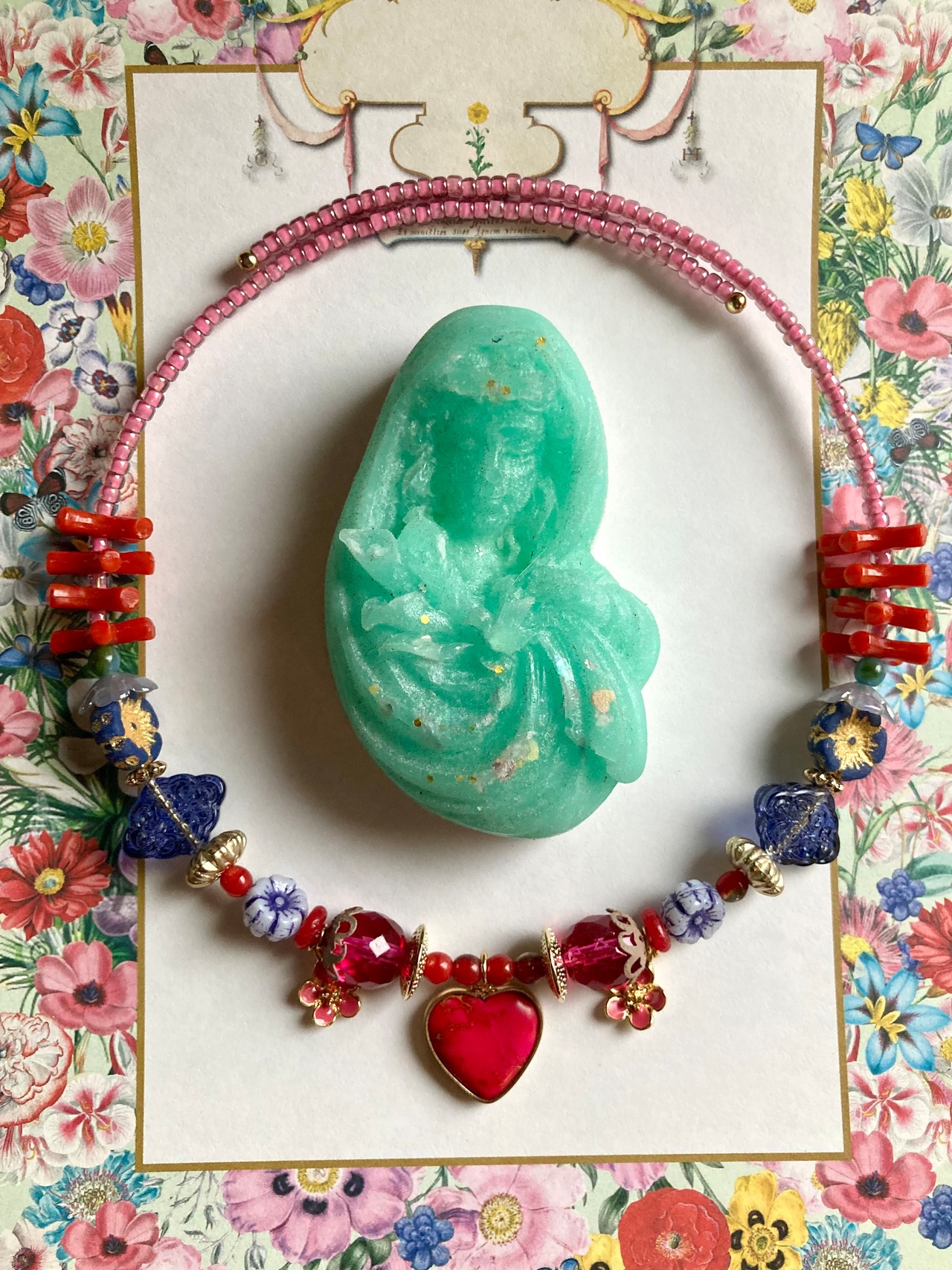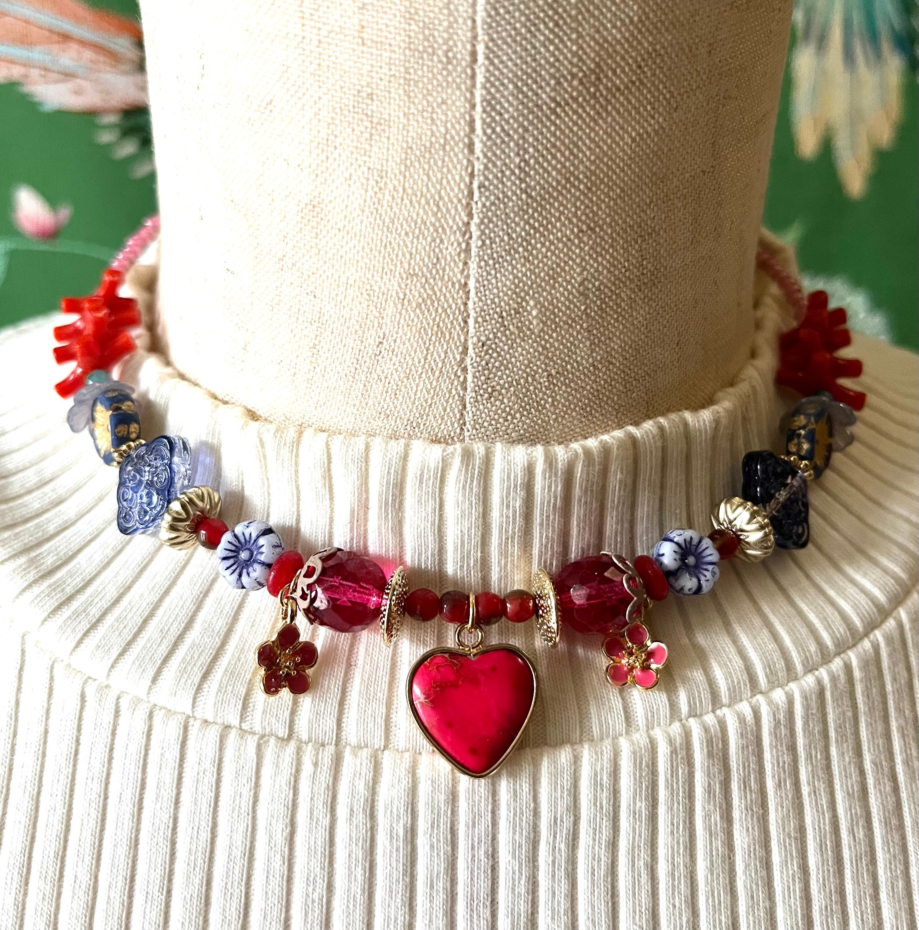オリエンタルなフラワーやイミテーション珊瑚等を使用したシノワズリなデザインのビーズチョーカー。