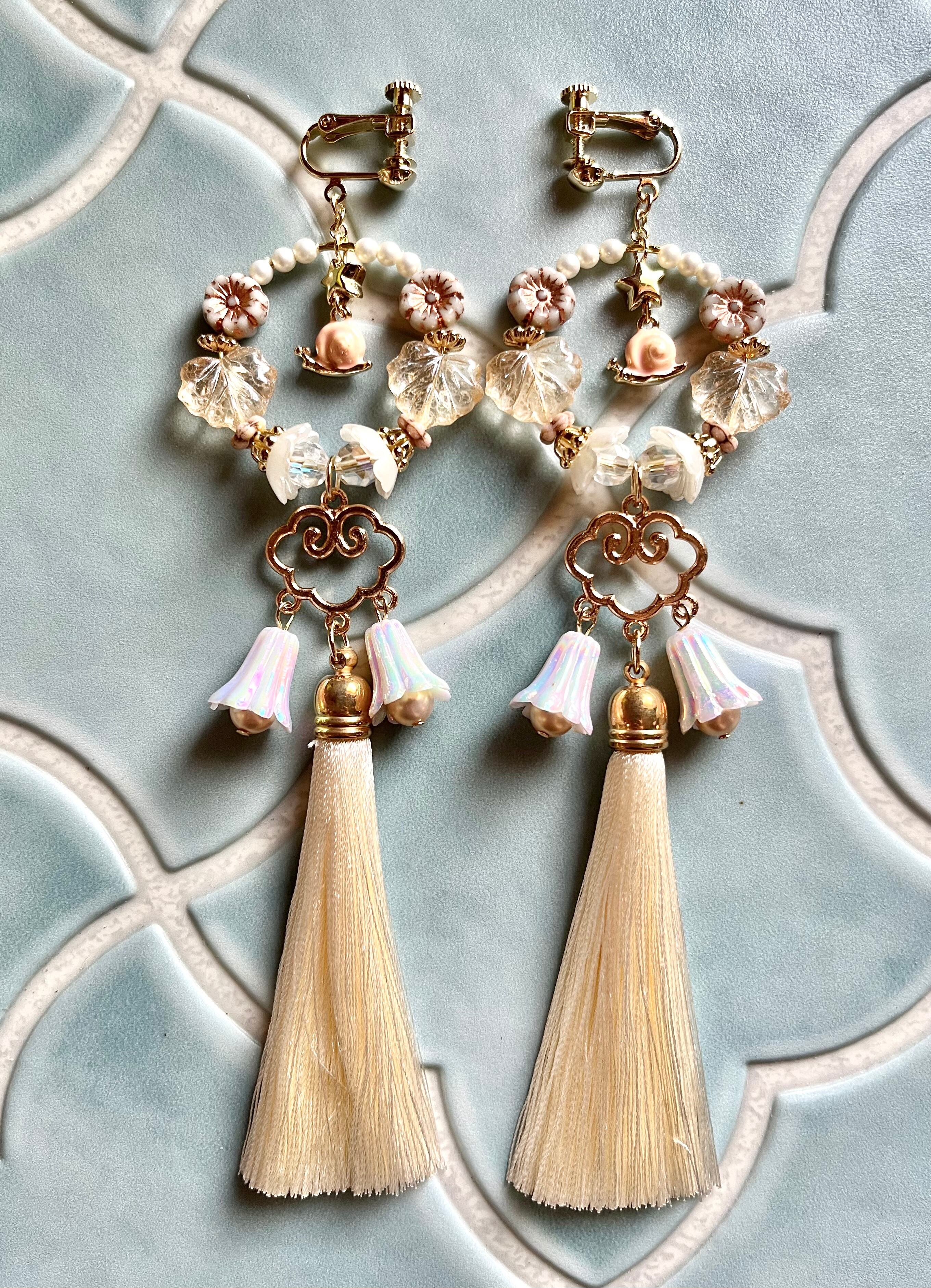 こちらはロングタッセルデザインのかたつむりチャーム耳飾りです。