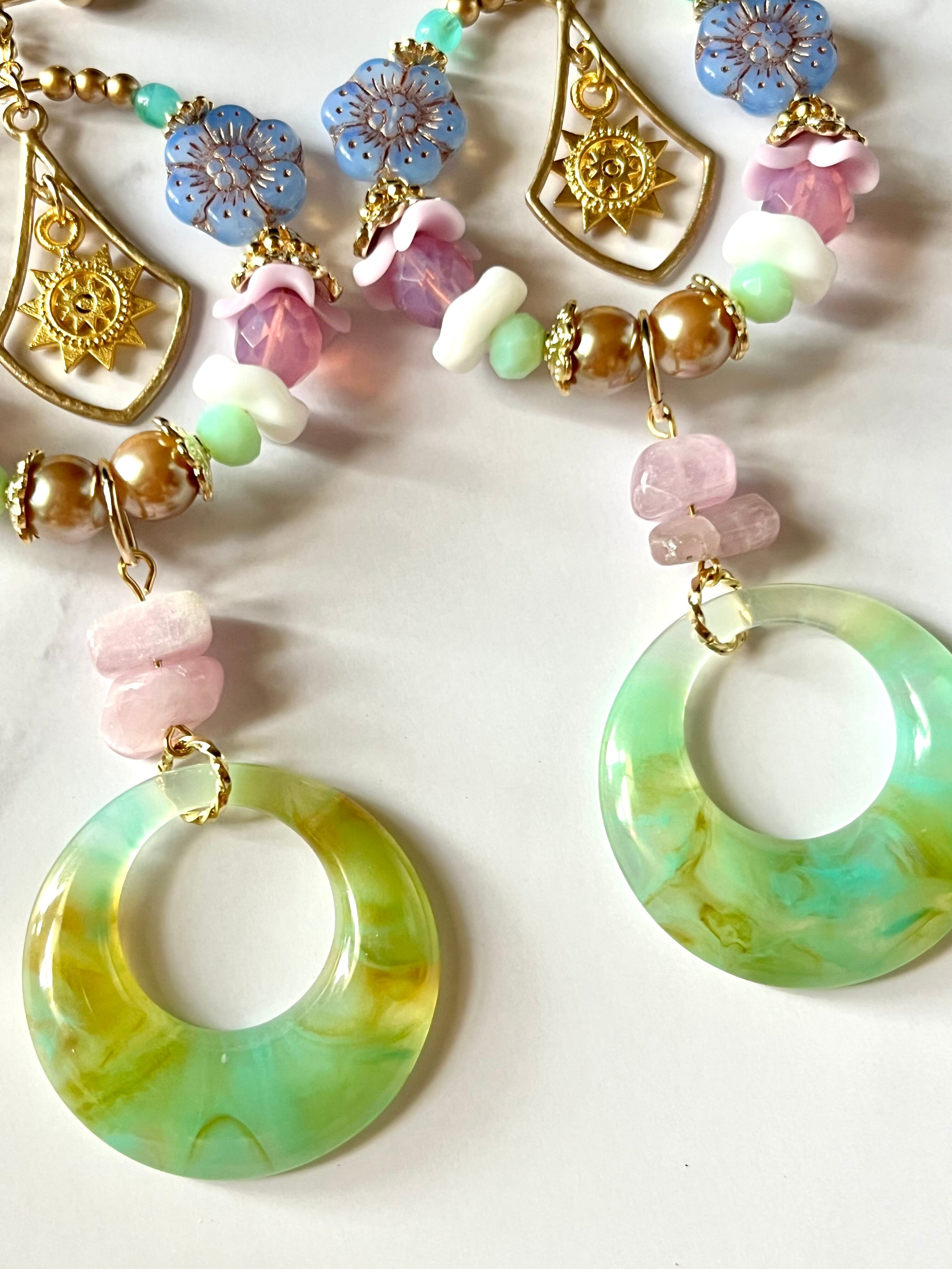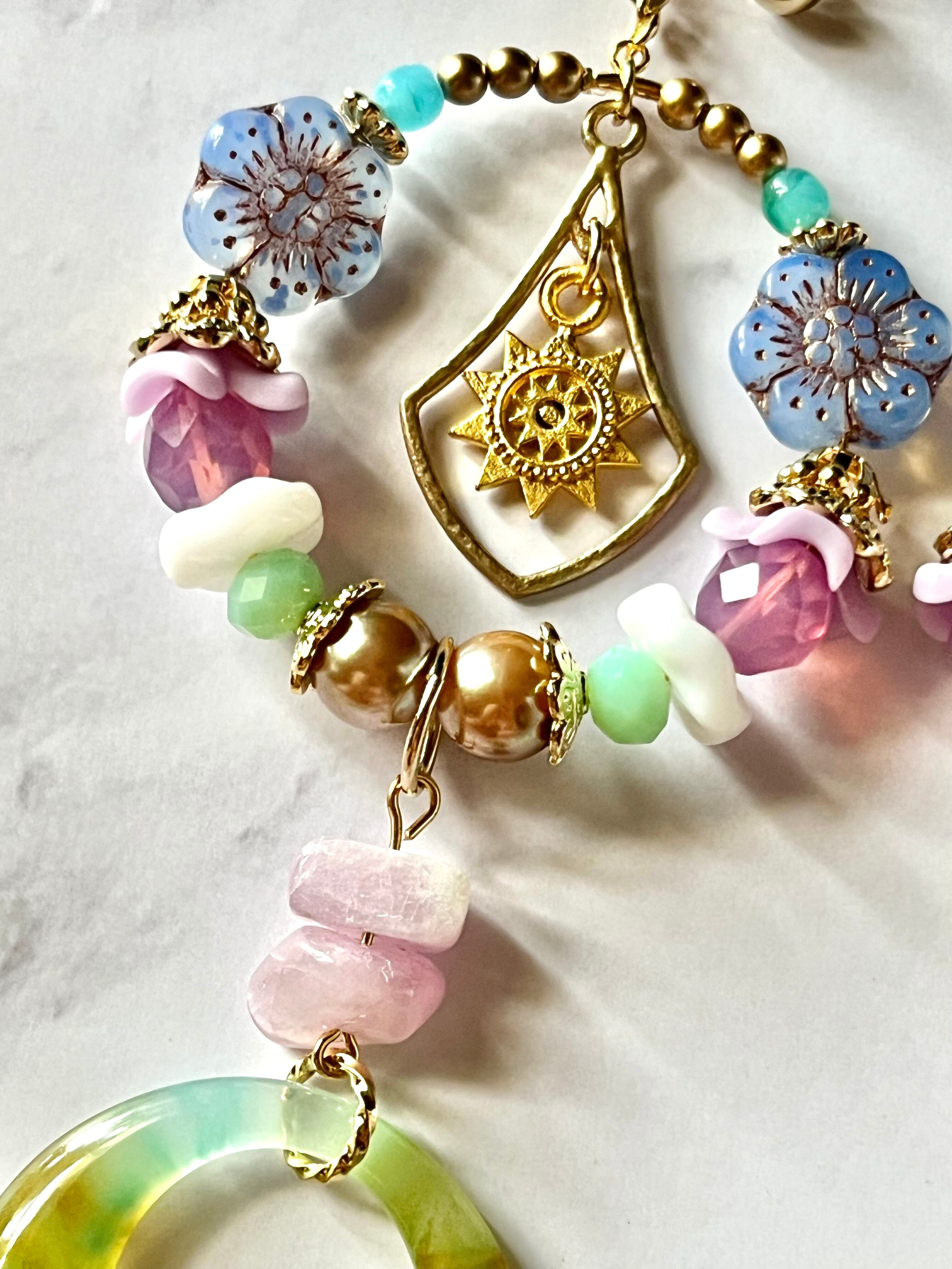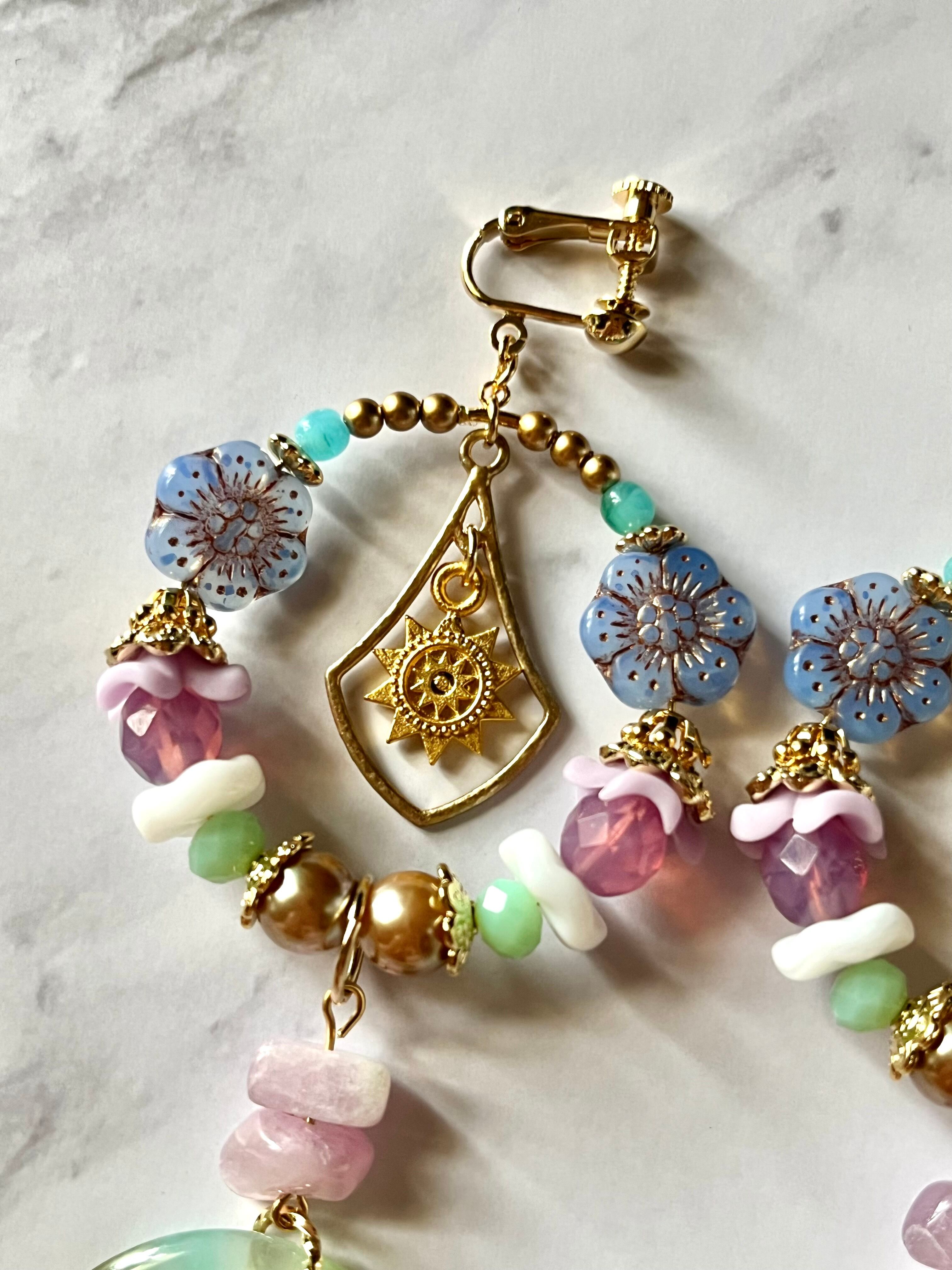 素材:チェコ硝子ビーズ、トルコ製チャーム、天然石ビーズ、ドイツアクリルビーズなど