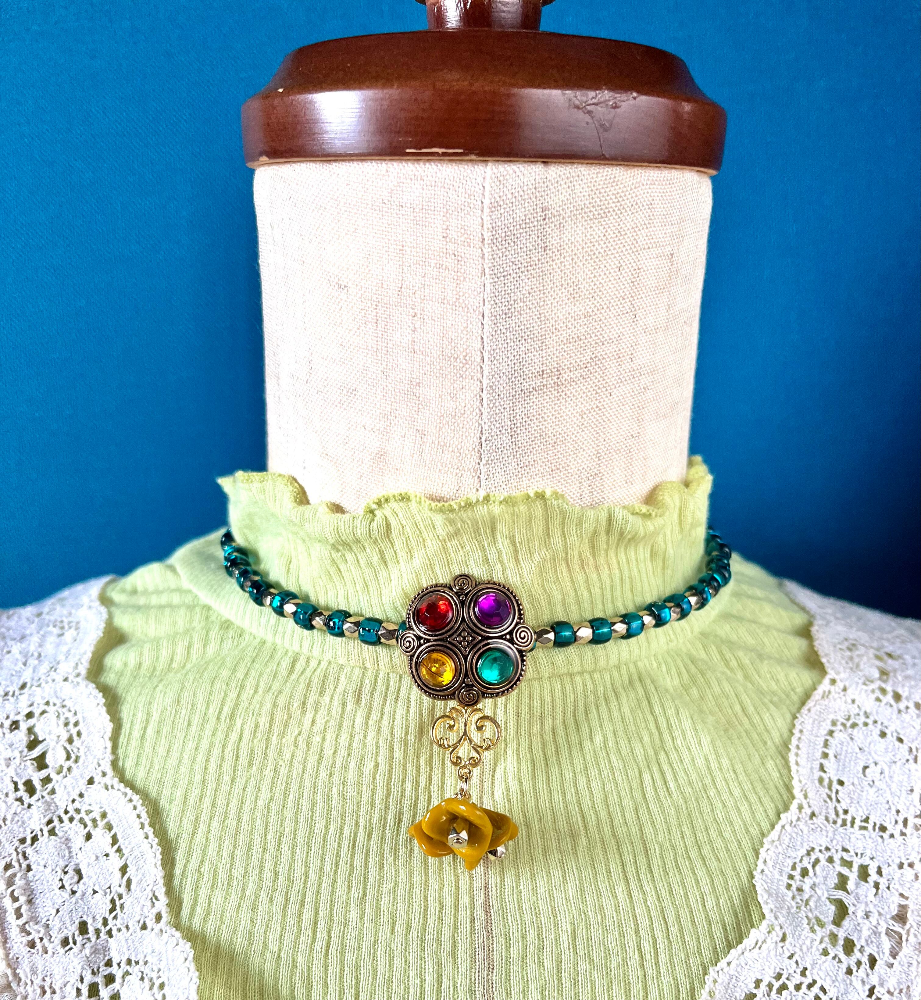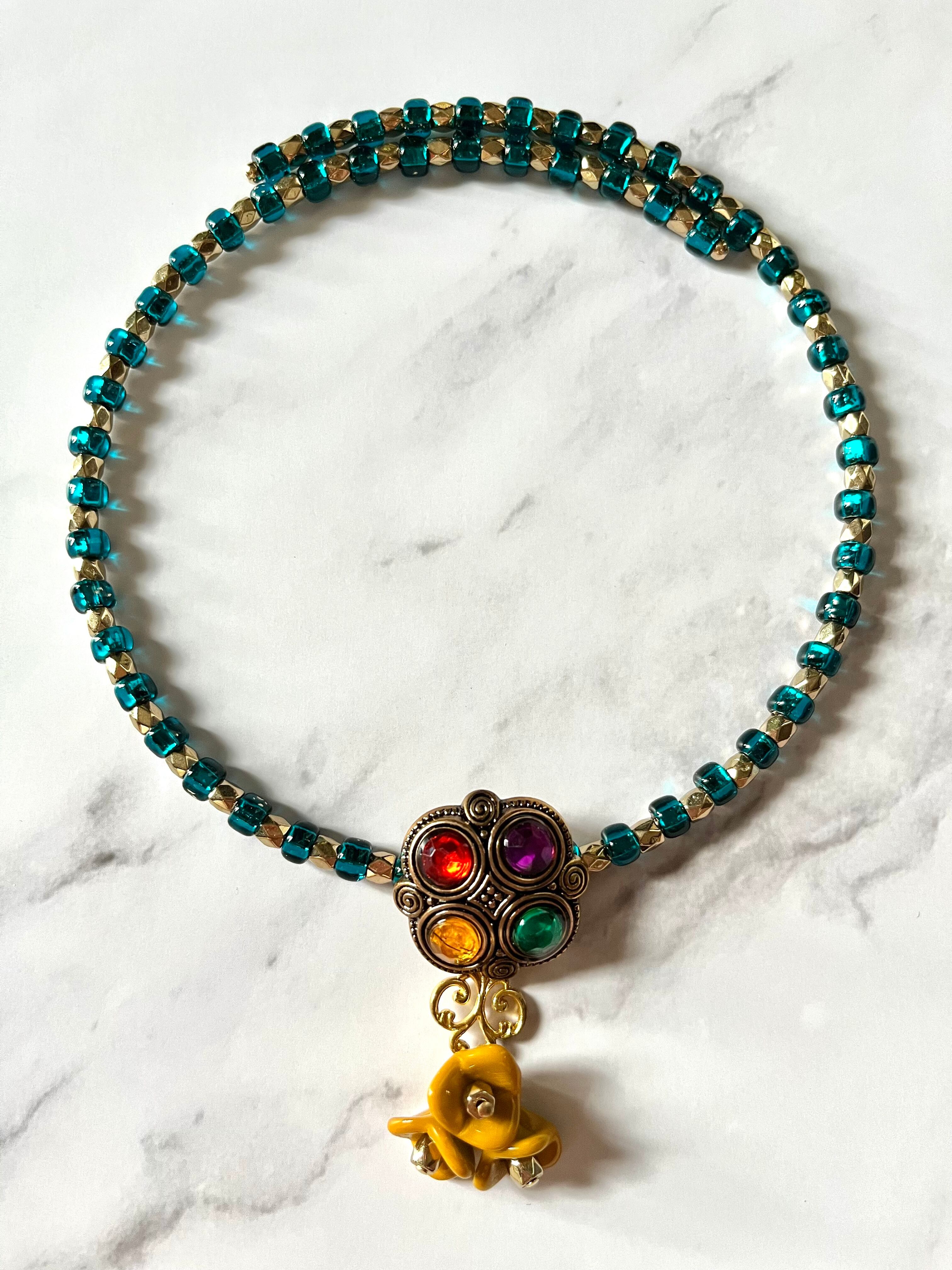 素材:ビンテージ硝子ビーズ、キャスト釦、チェコ硝子ビーズなど