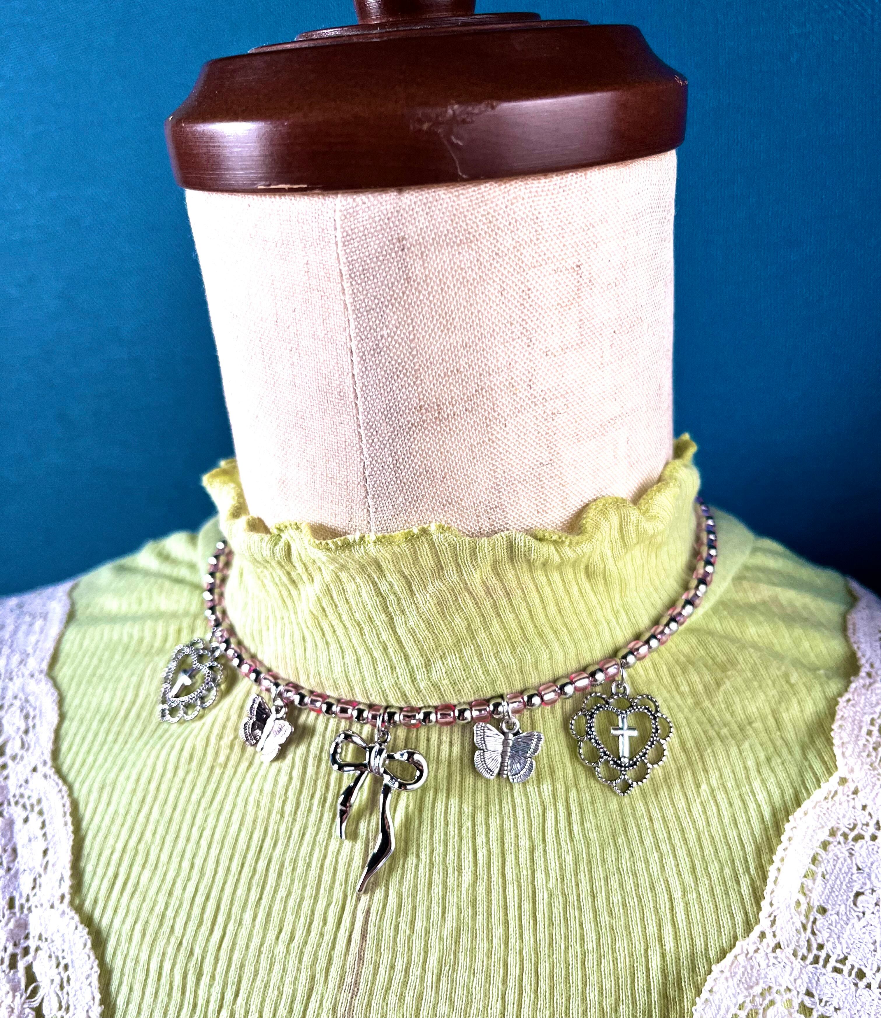 夏の空の下が似合うシルバー×ピンクのワイヤーチョーカー。チャームつきとチャーム無しのデザインがあります。