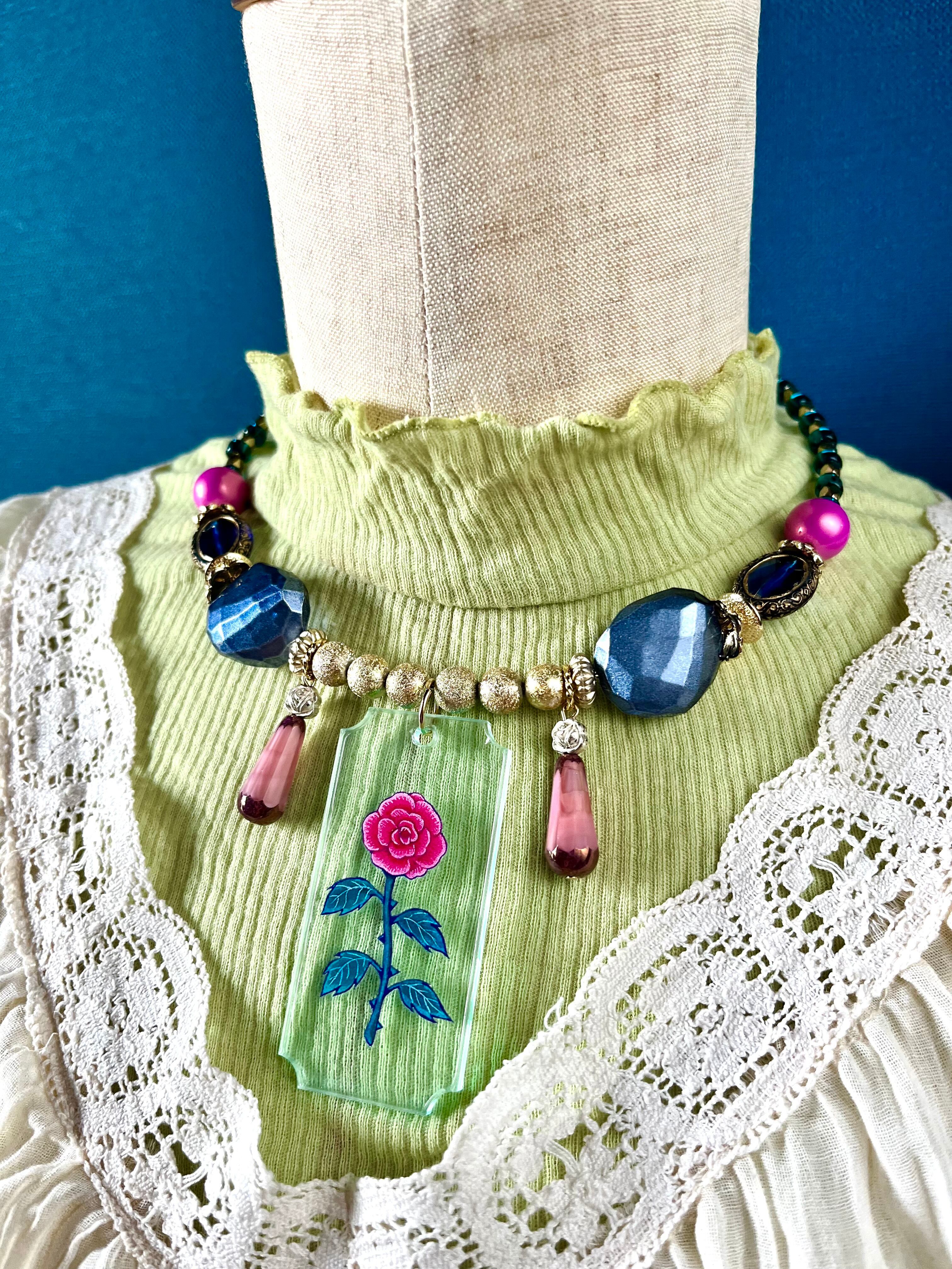 素材:チェコ硝子ビーズ、硝子風イラストアクリルチャーム、アクリルビーズなど