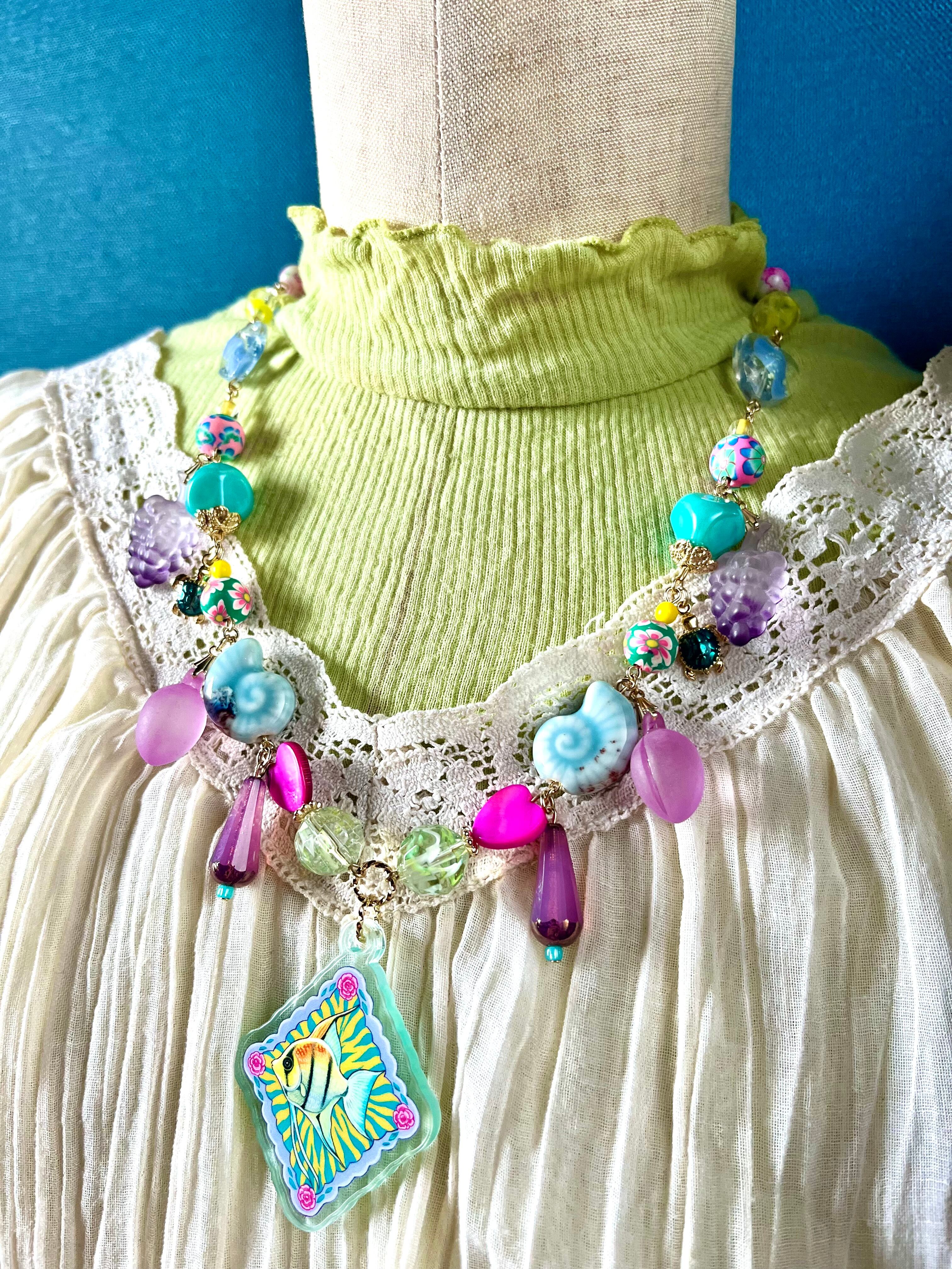 素材:チェコ硝子ビーズ、硝子風イラストアクリルチャーム、ビンテージフルーツビーズ、アクリルビーズなど