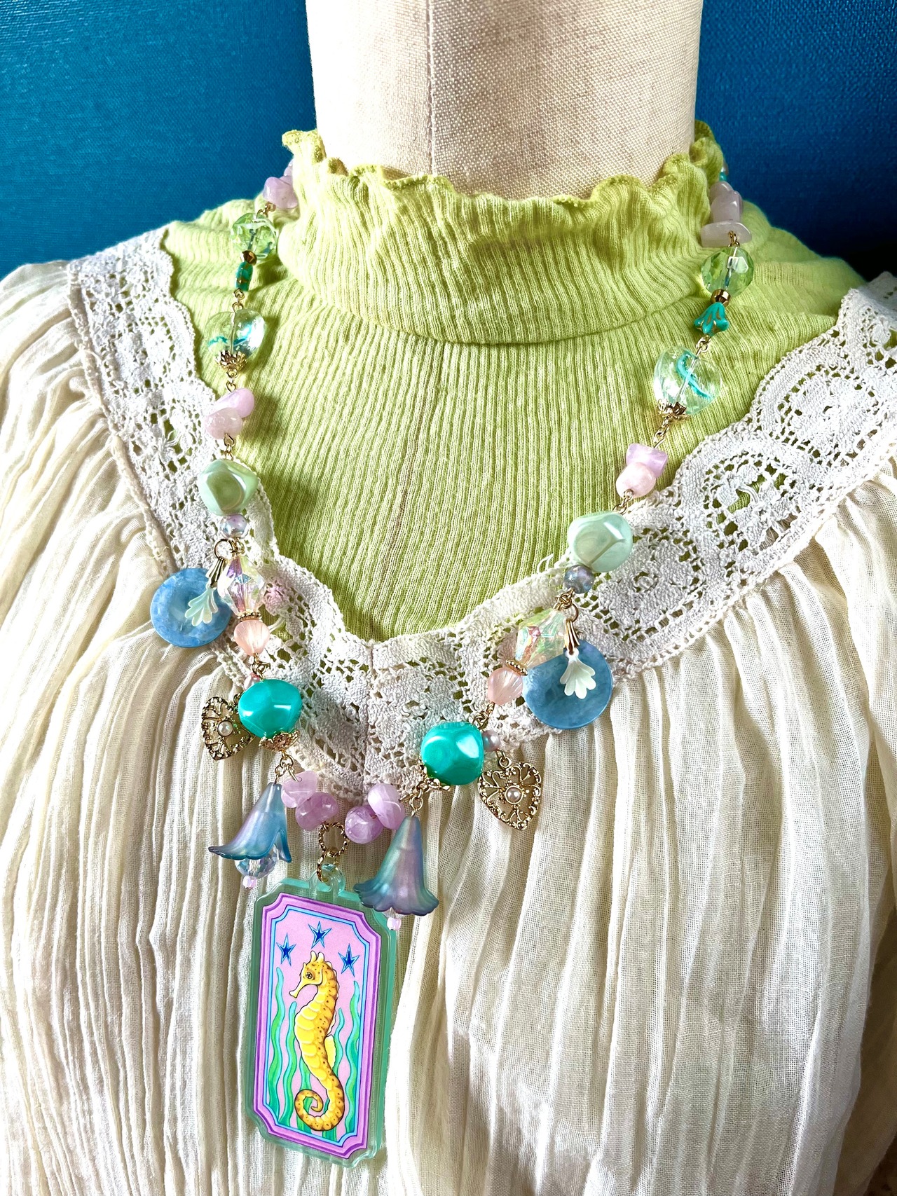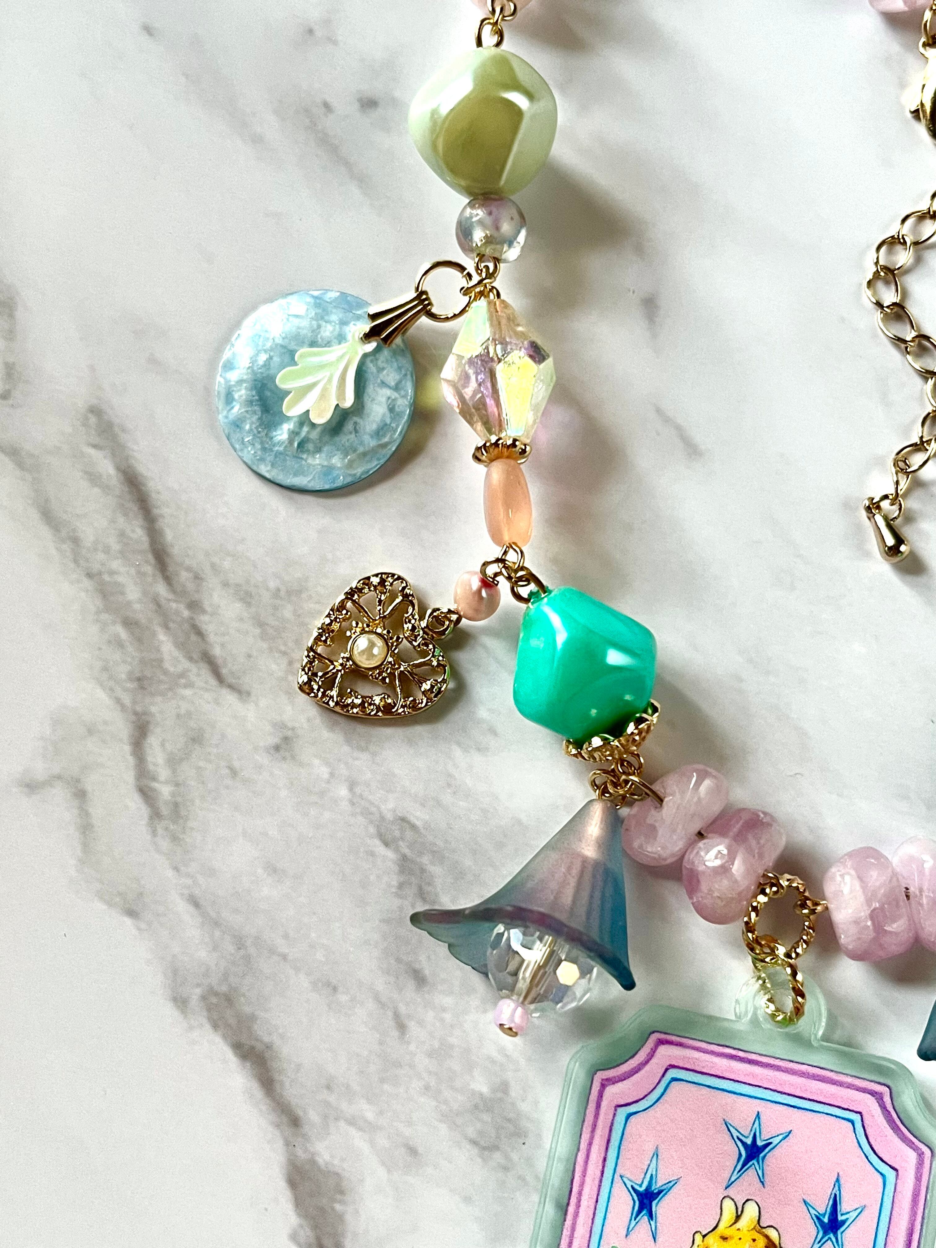 素材:チェコ硝子ビーズ、硝子風イラストアクリルチャーム、ビンテージスパンコール、アクリルビーズ、天然石ビーズ、シェルパーツなど