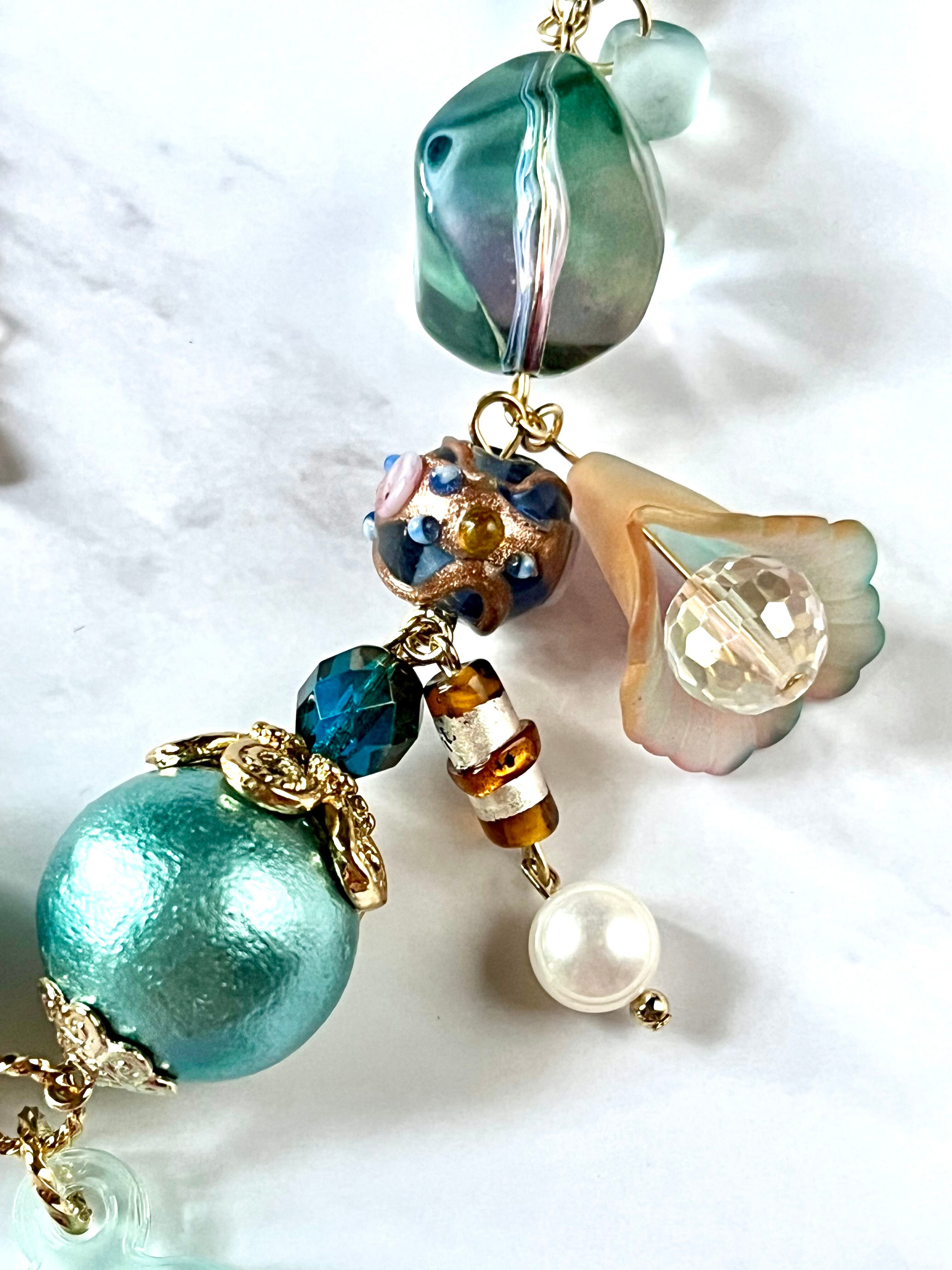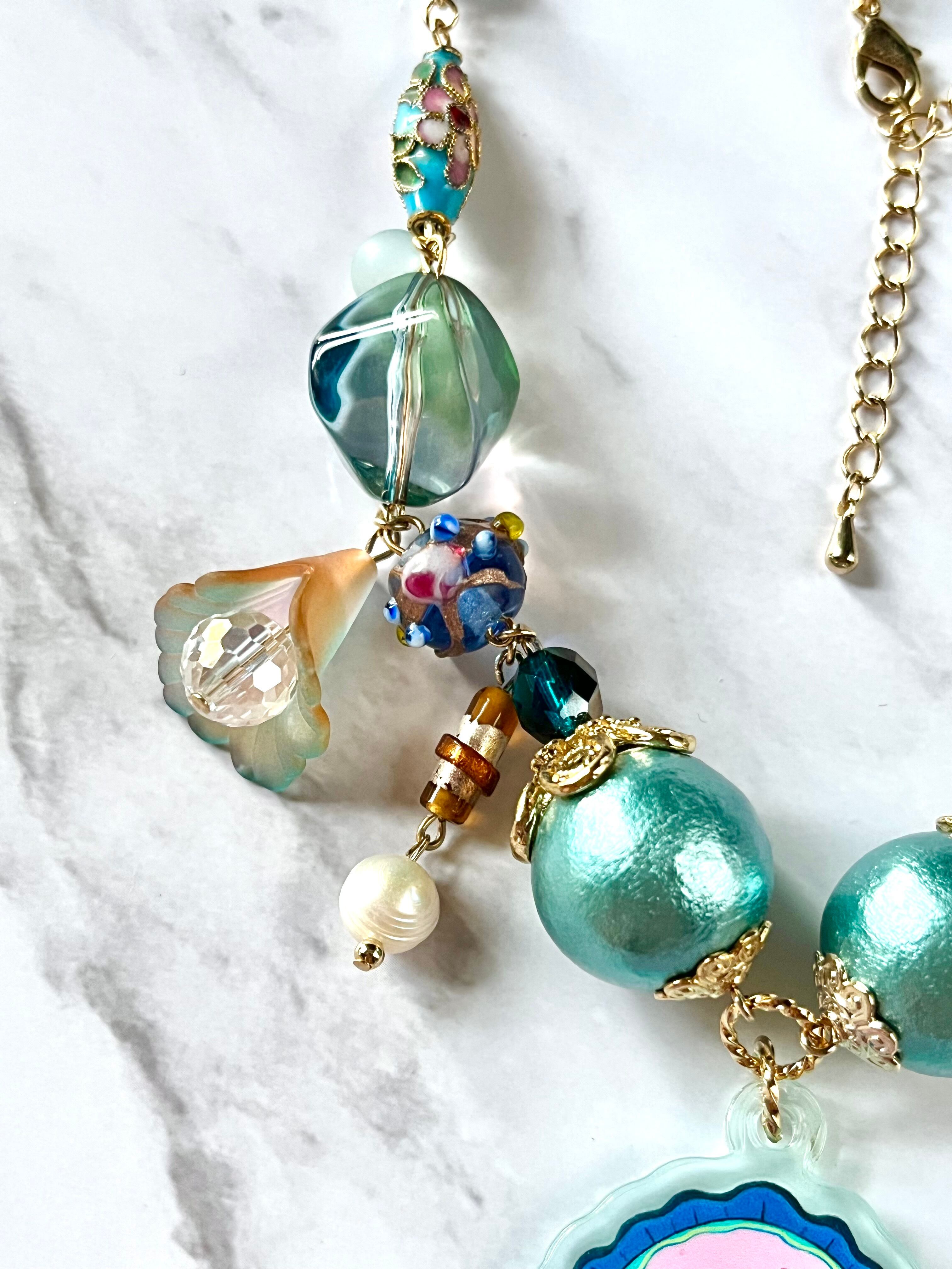 素材:チェコ硝子ビーズ、硝子風イラストアクリルチャーム、台湾仕入れランプビーズ、コットンパール、アクリルビーズなど