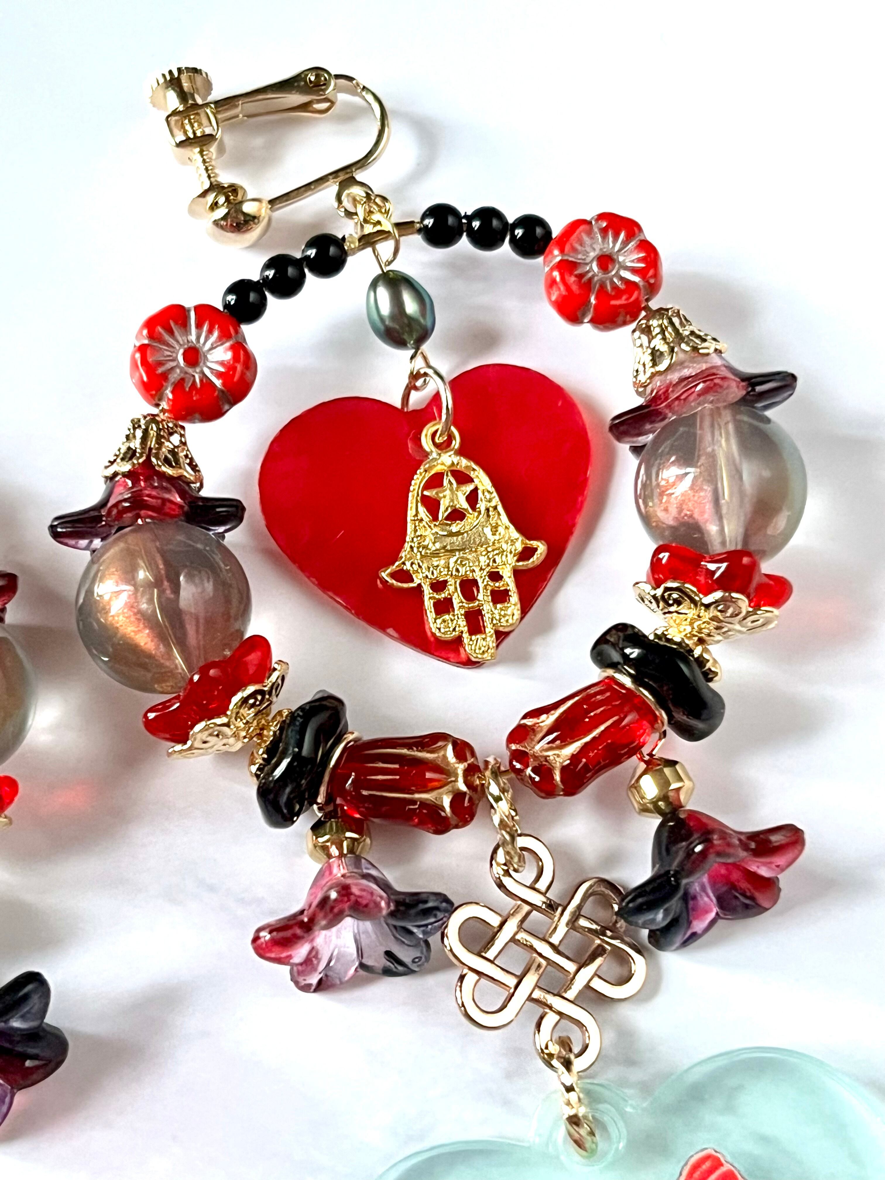 素材:チェコ硝子ビーズ、硝子風イラストアクリルチャーム、トルコ製チャーム、シェルパーツアクリルビーズなど