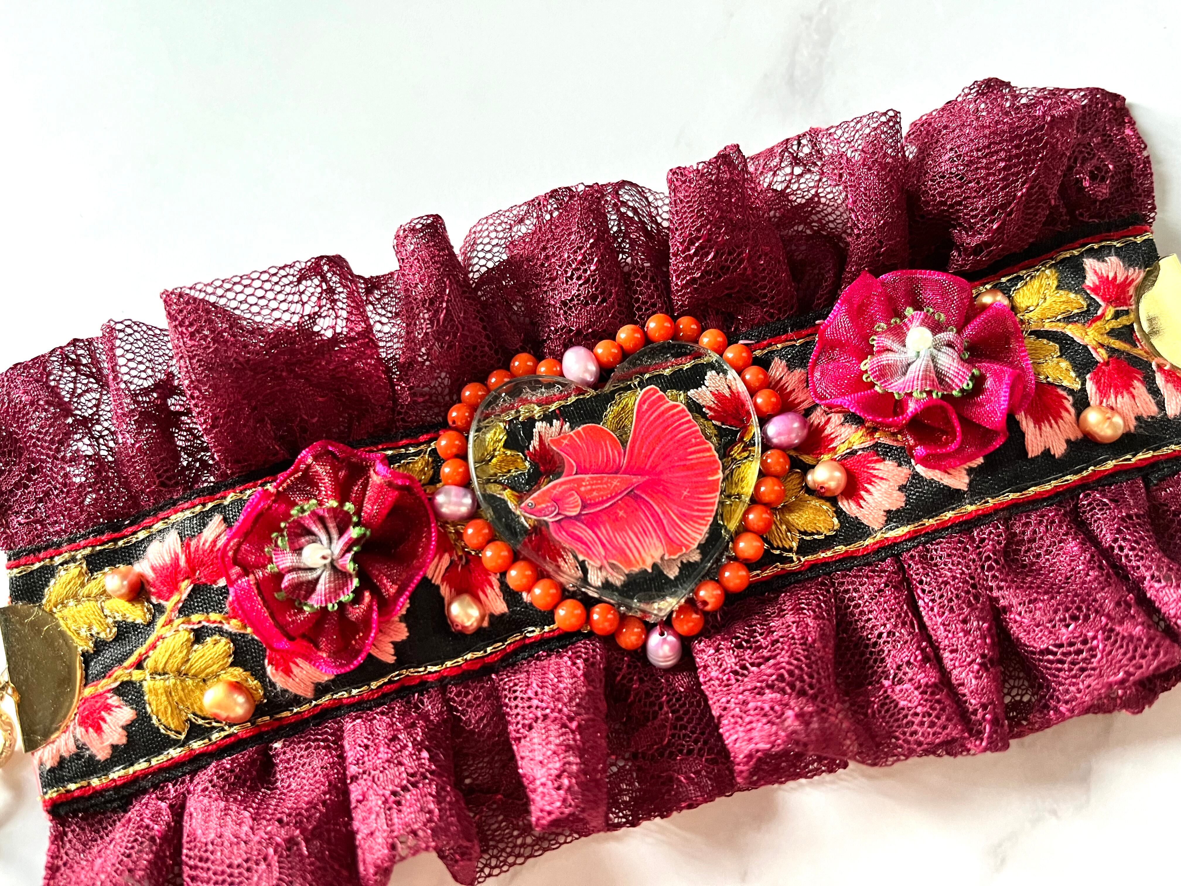 素材:淡水パール、硝子風イラストアクリルチャーム、台湾製フラワーパーツ、珊瑚ビーズ、ラッセルレース生地、インド刺繍りぼんなど