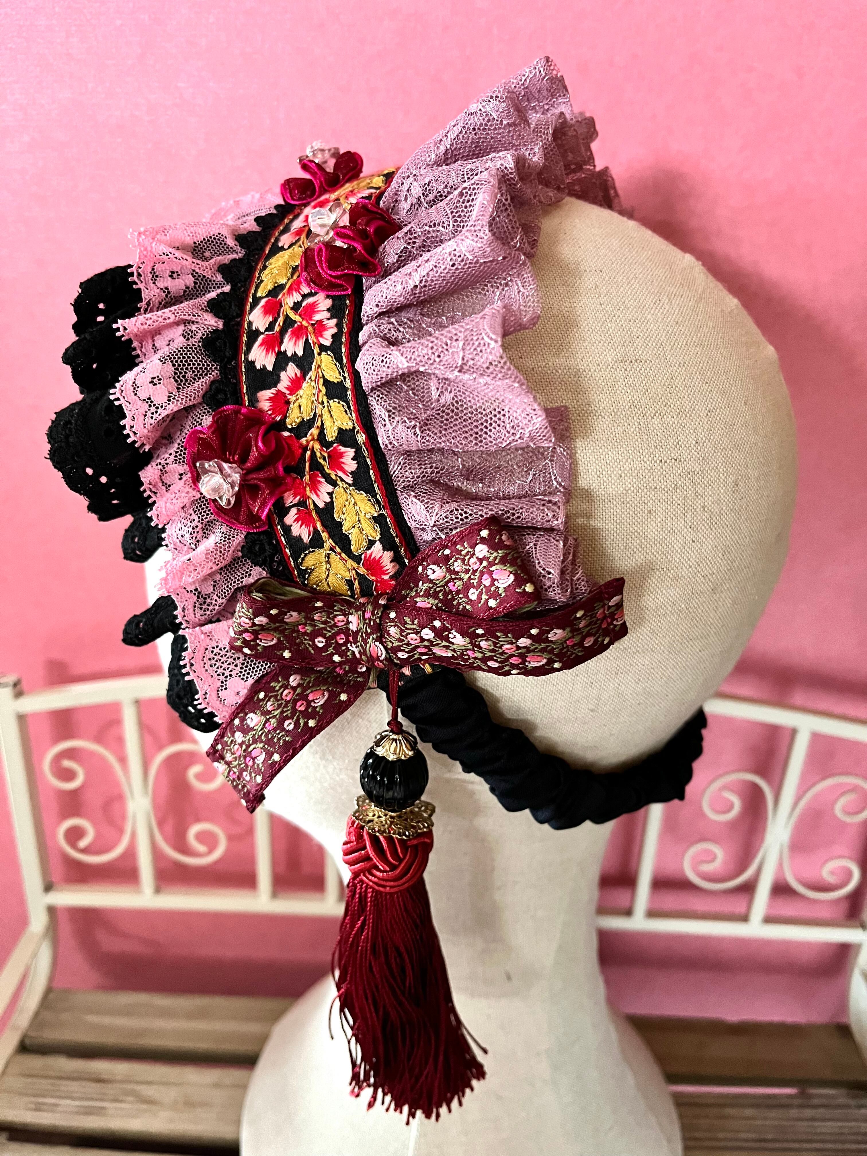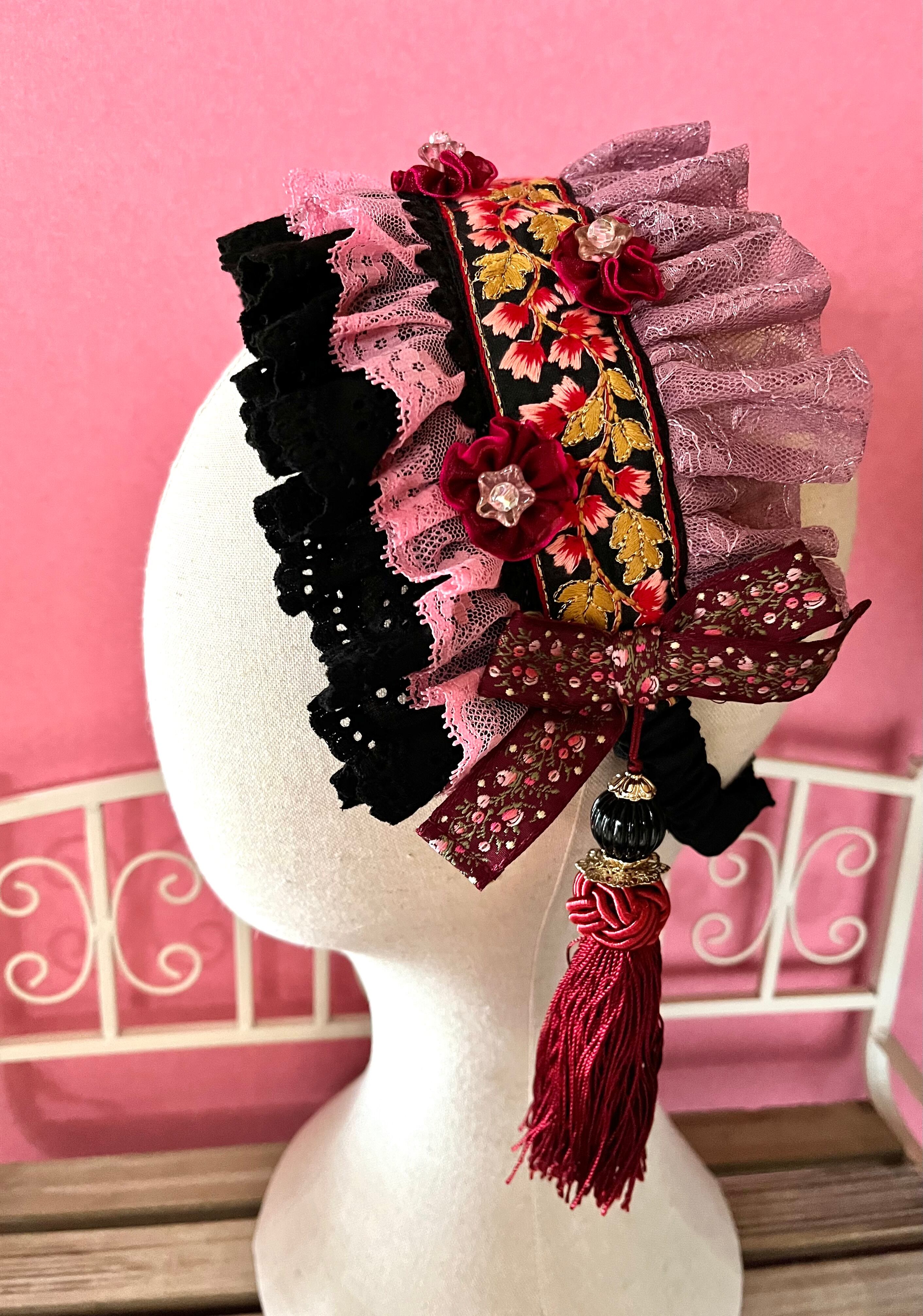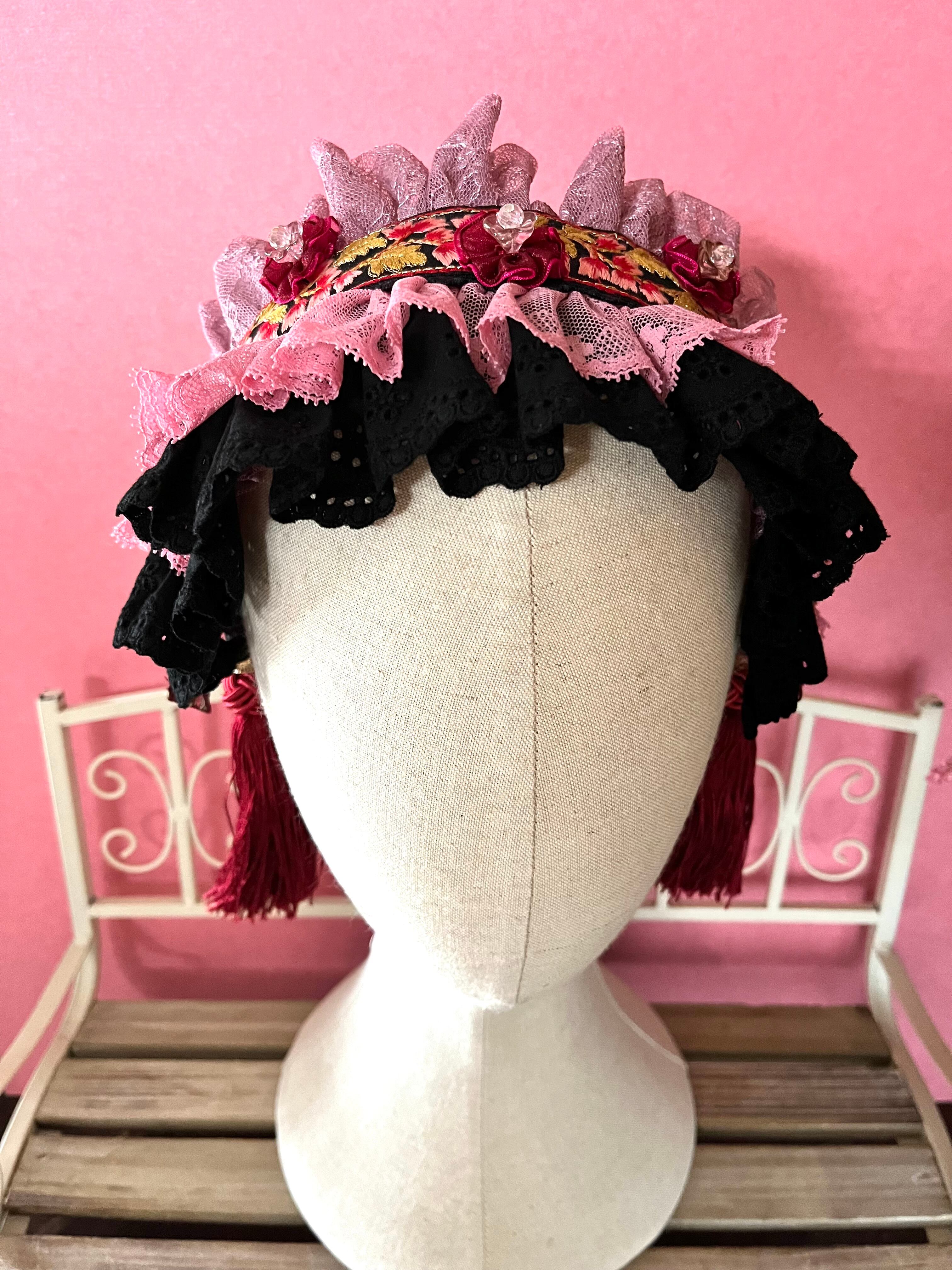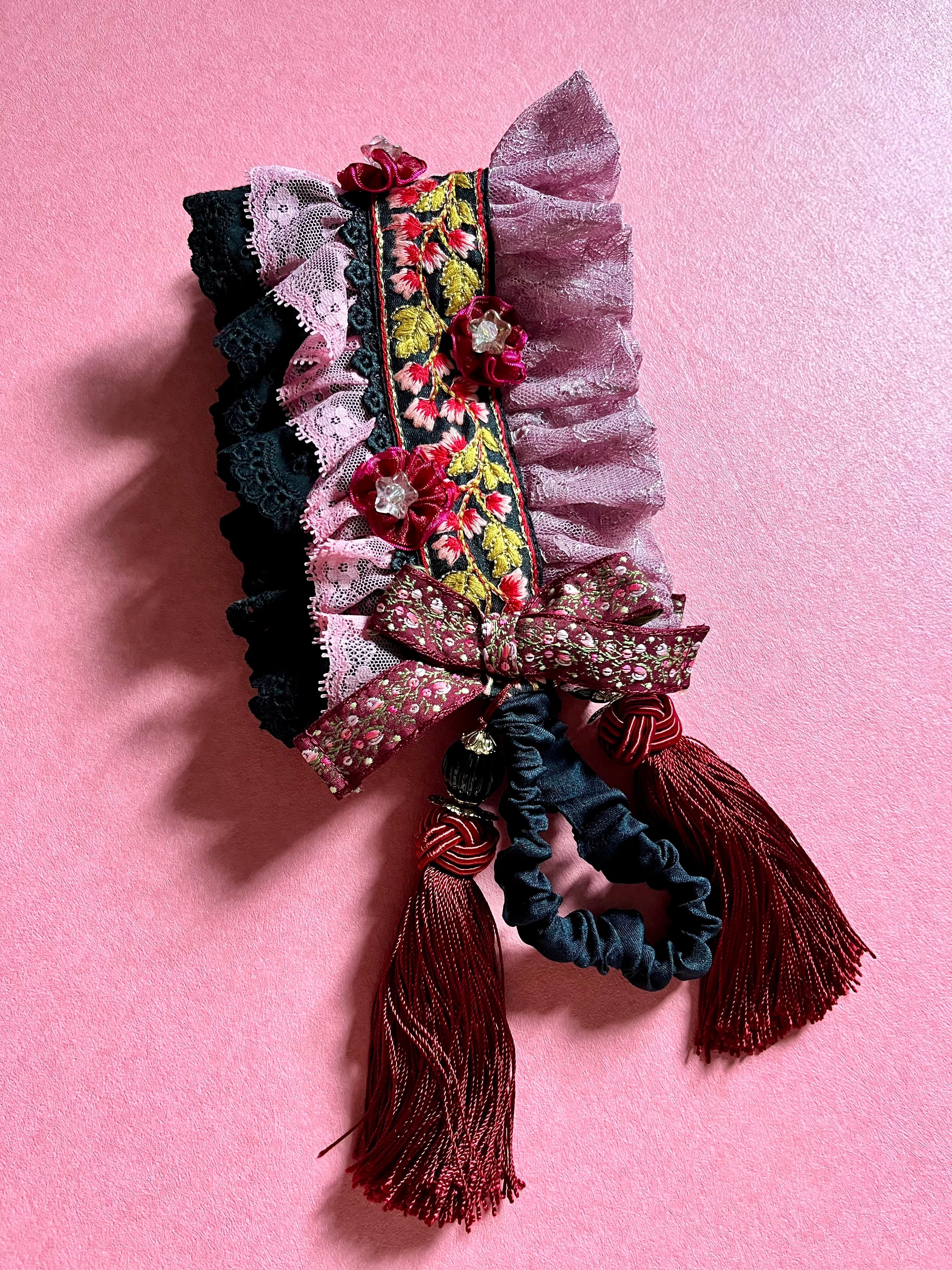 インド刺繍りぼんや台湾で仕入れたパーツ、レース類などを贅沢にボリューミーに使用しています。