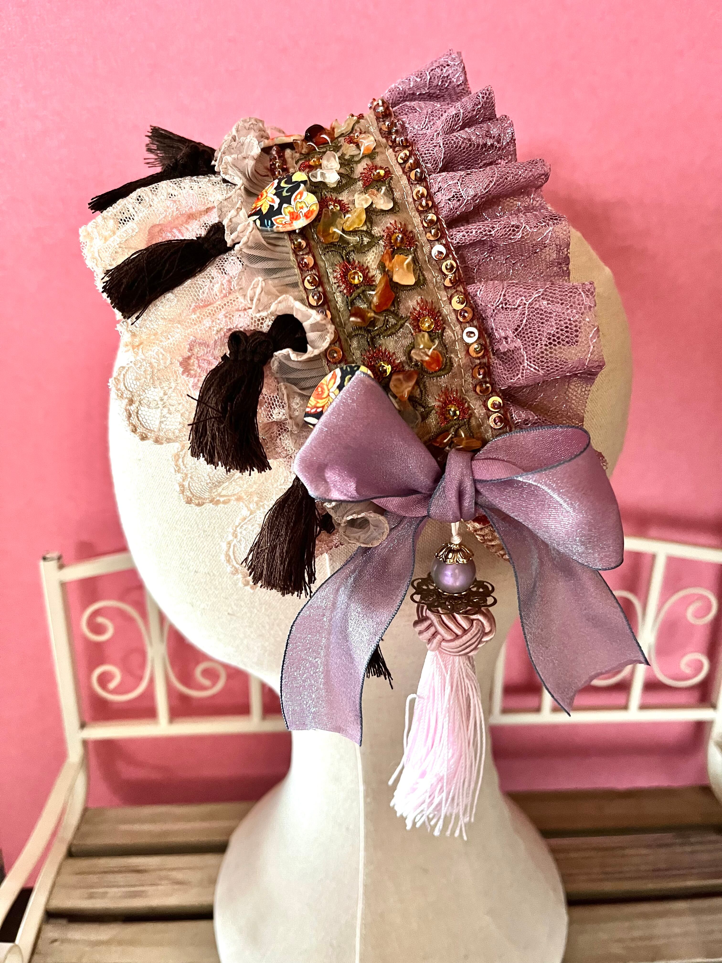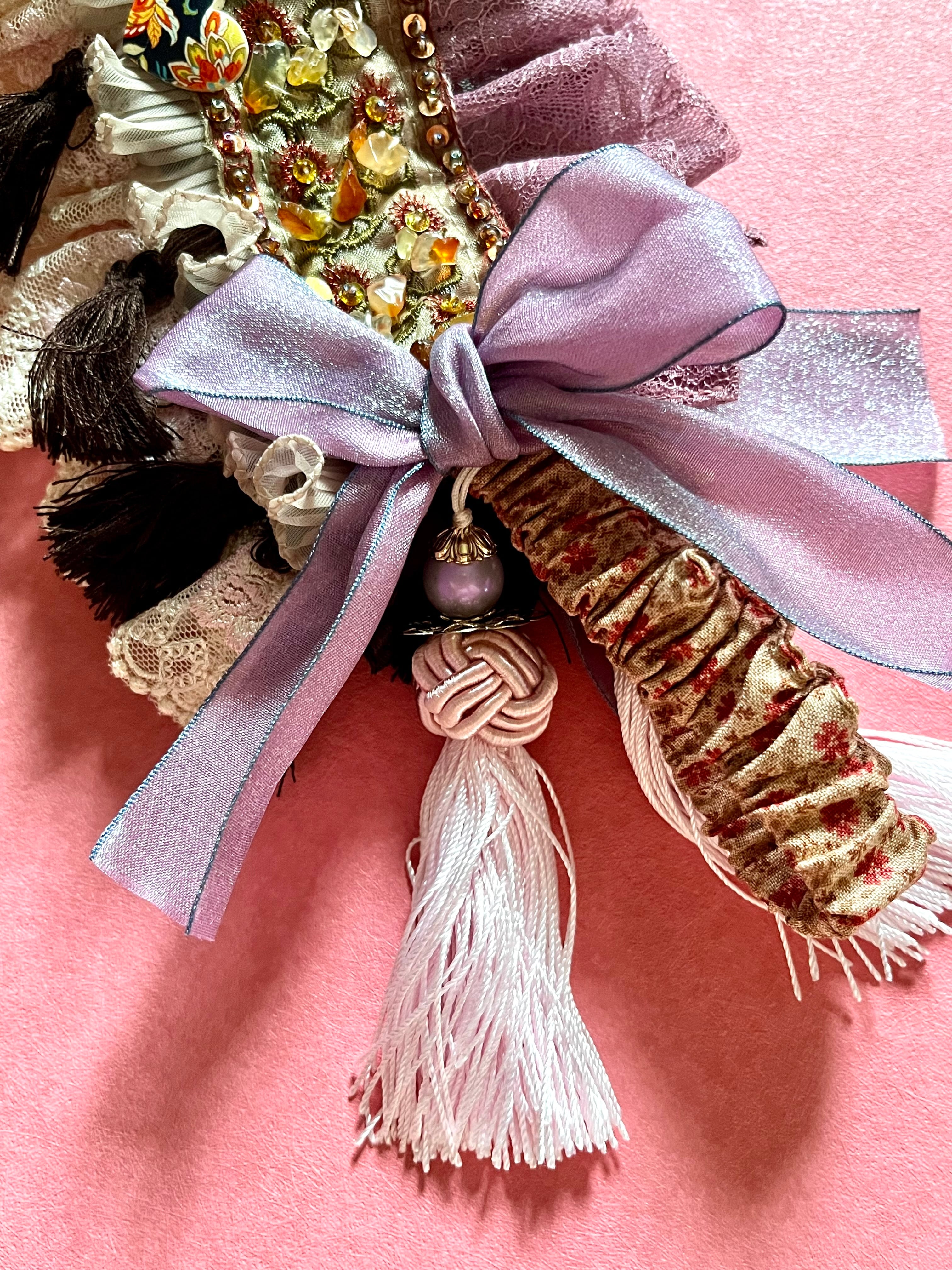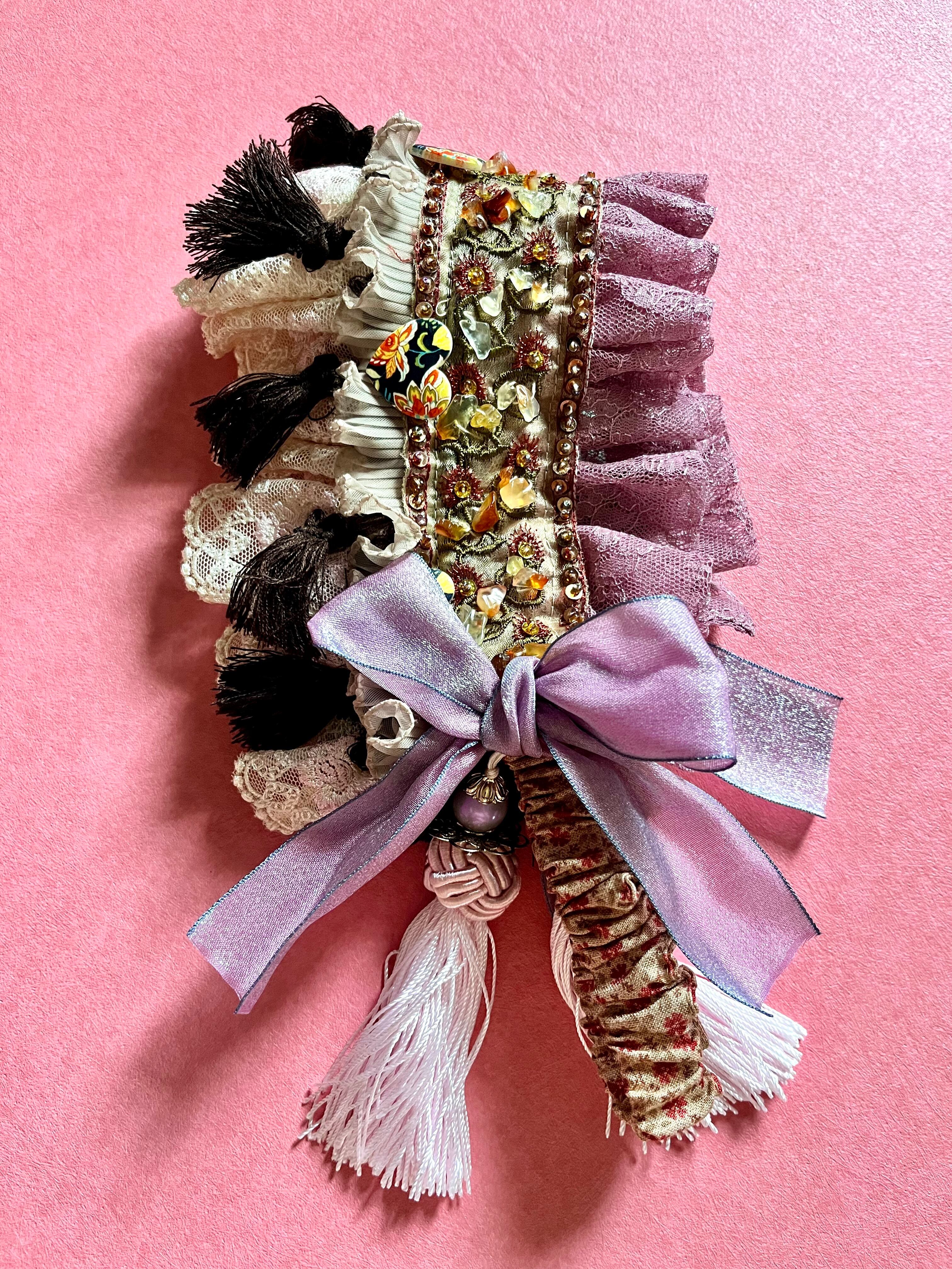 インド刺繍りぼんや台湾で仕入れたパーツ、レース類などを贅沢にボリューミーに使用しています。