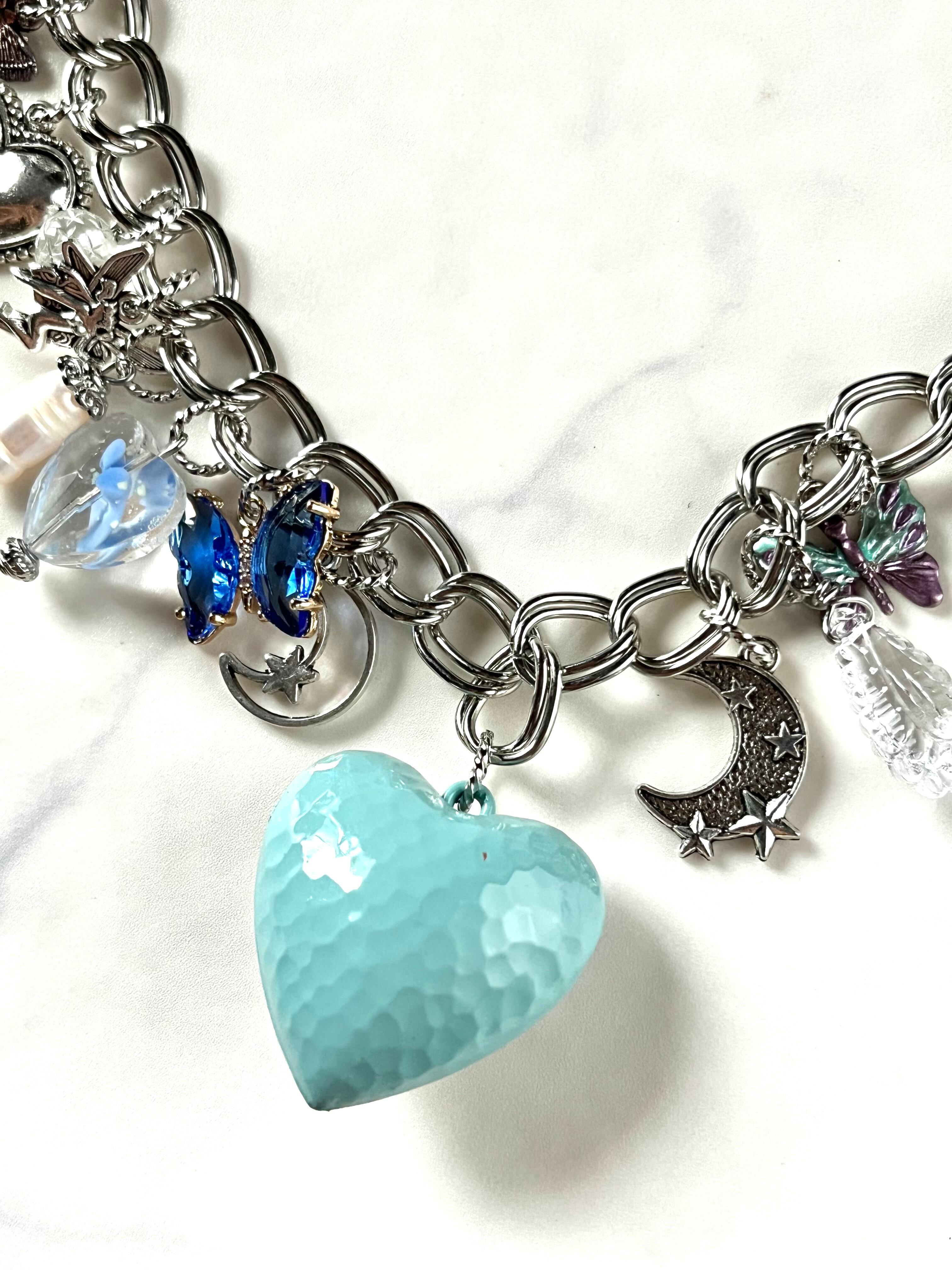 水色のハートチャームに初めから小さなキズがついている為、少しお値引しての販売となります。
