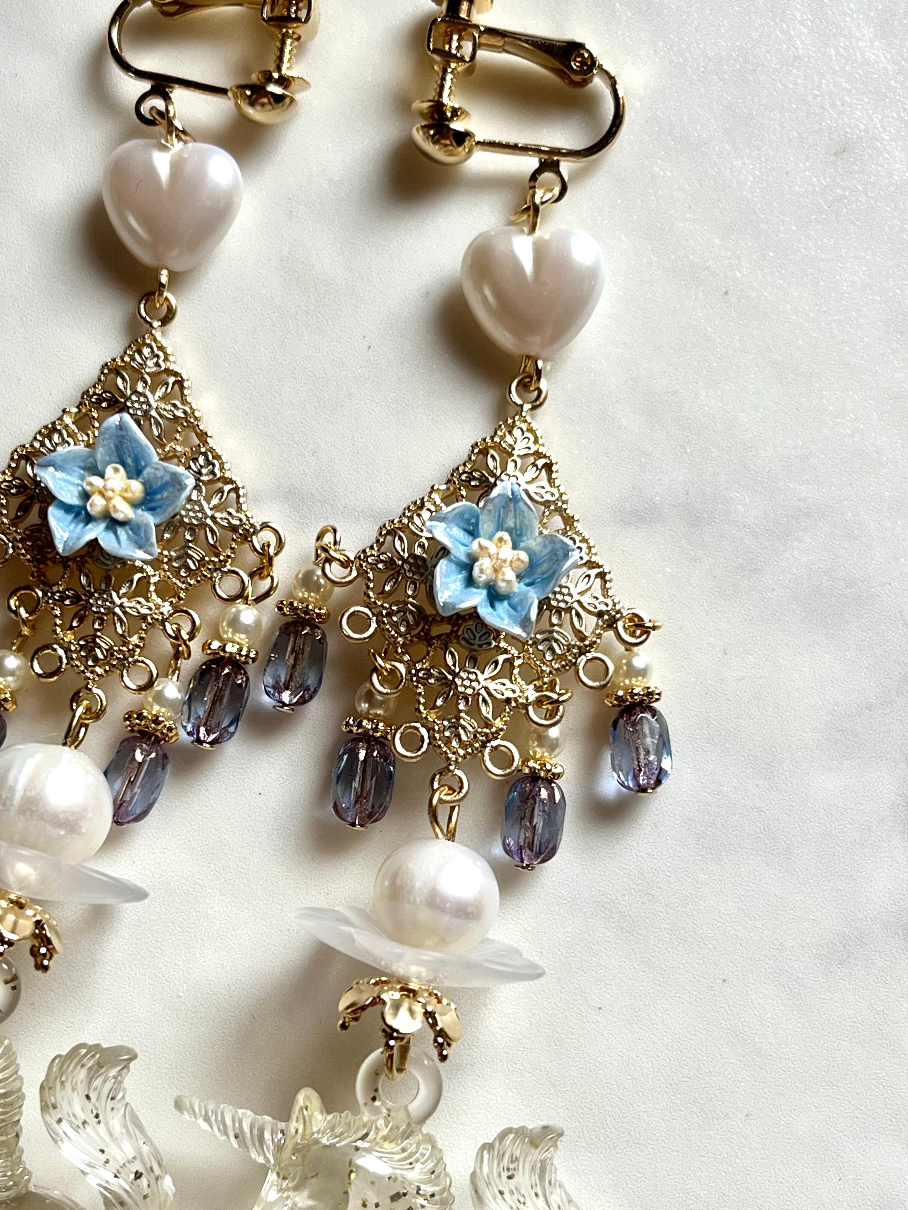 素材:淡水パール、チェコ硝子ビーズ、ドイツ製アクリルパーツ、キャストパーツなど