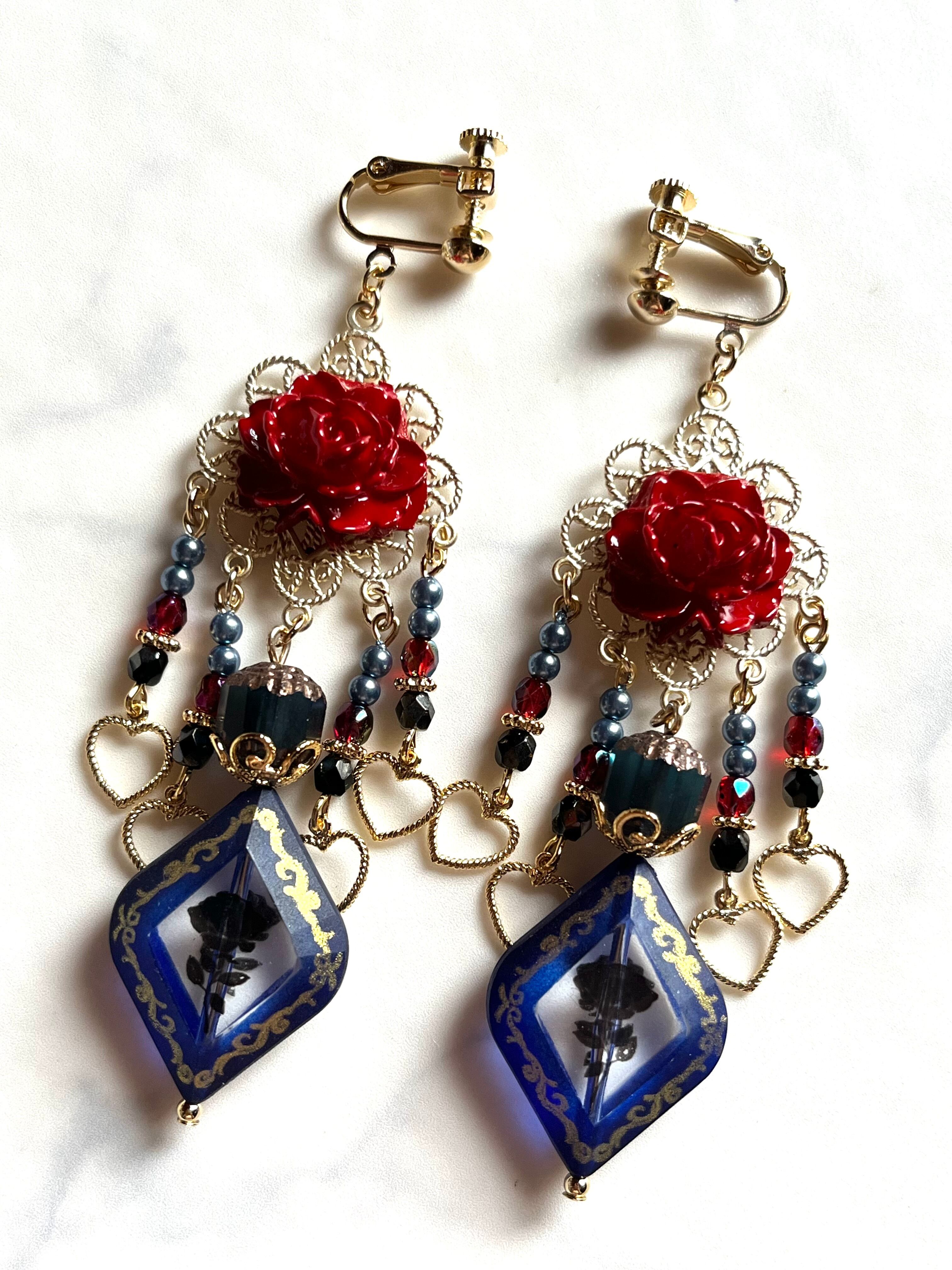 薔薇柄のビーズはみつねビーズ様の手描きビーズを使用しています。強く擦る、引っ掛けるなどで塗装が剥げる可能性がございますので、お取り扱いにはご注意ください。